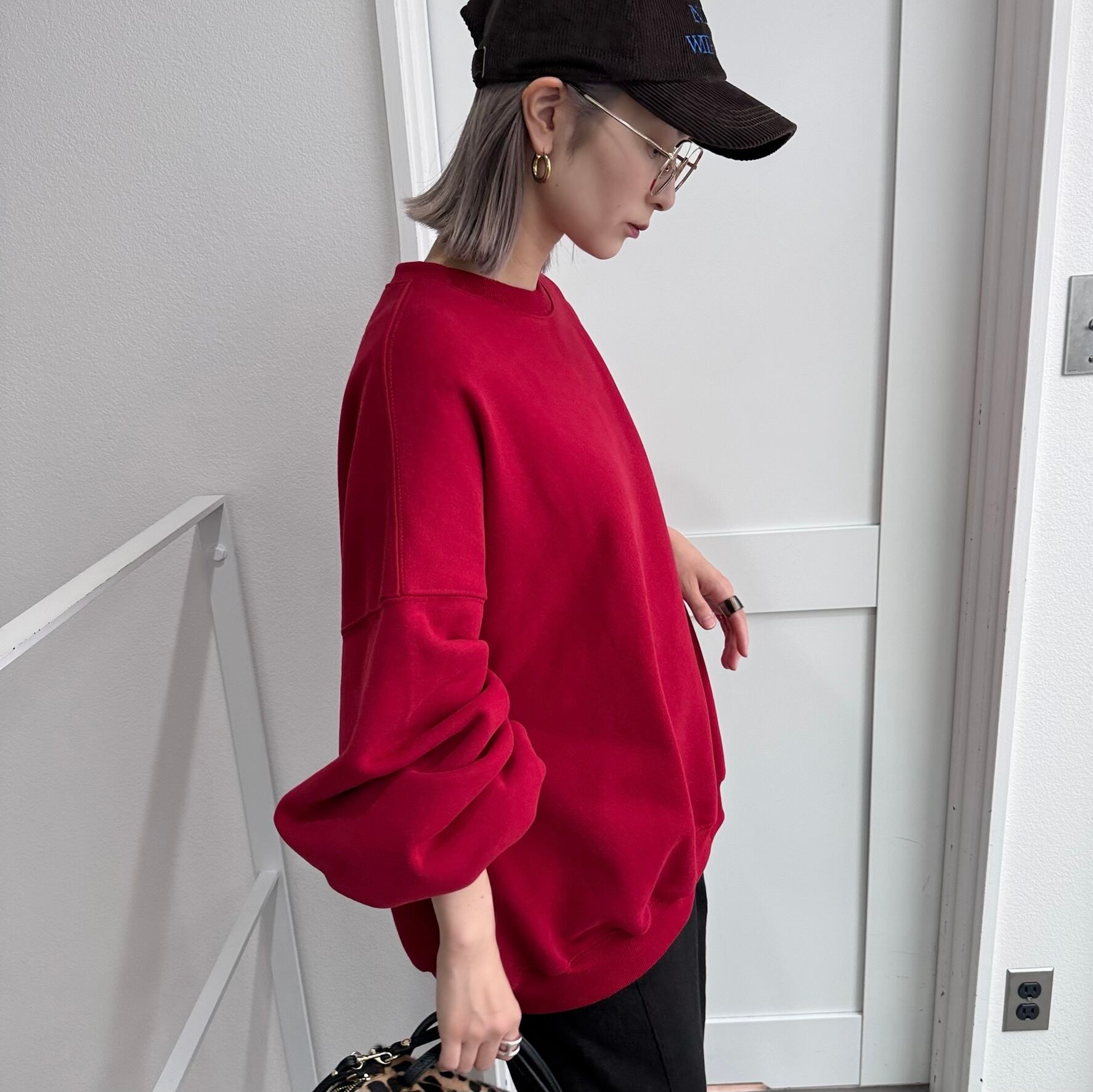 トレンドのビッグシルエットに、たっぷりとしたボリュームスリーブを落とし込んだ裏起毛スウェットプルオーバー。袖の丸みと肩の落ち感が、立体感を生み出し、着るだけで旬なバランスが完成します。全体にゆとりのあるシルエットながらも、サイドに向かって自然に落ちるシェイプが、ラフすぎない印象にまとめてくれます。軽さと暖かさを両立した着心地は、デイリーウェアとしてもパーフェクト。袖口・裾・ネックラインにはテンションのあるリブを施し、メリハリを効かせることでルーズになりすぎず、スッキリ見せが叶います。