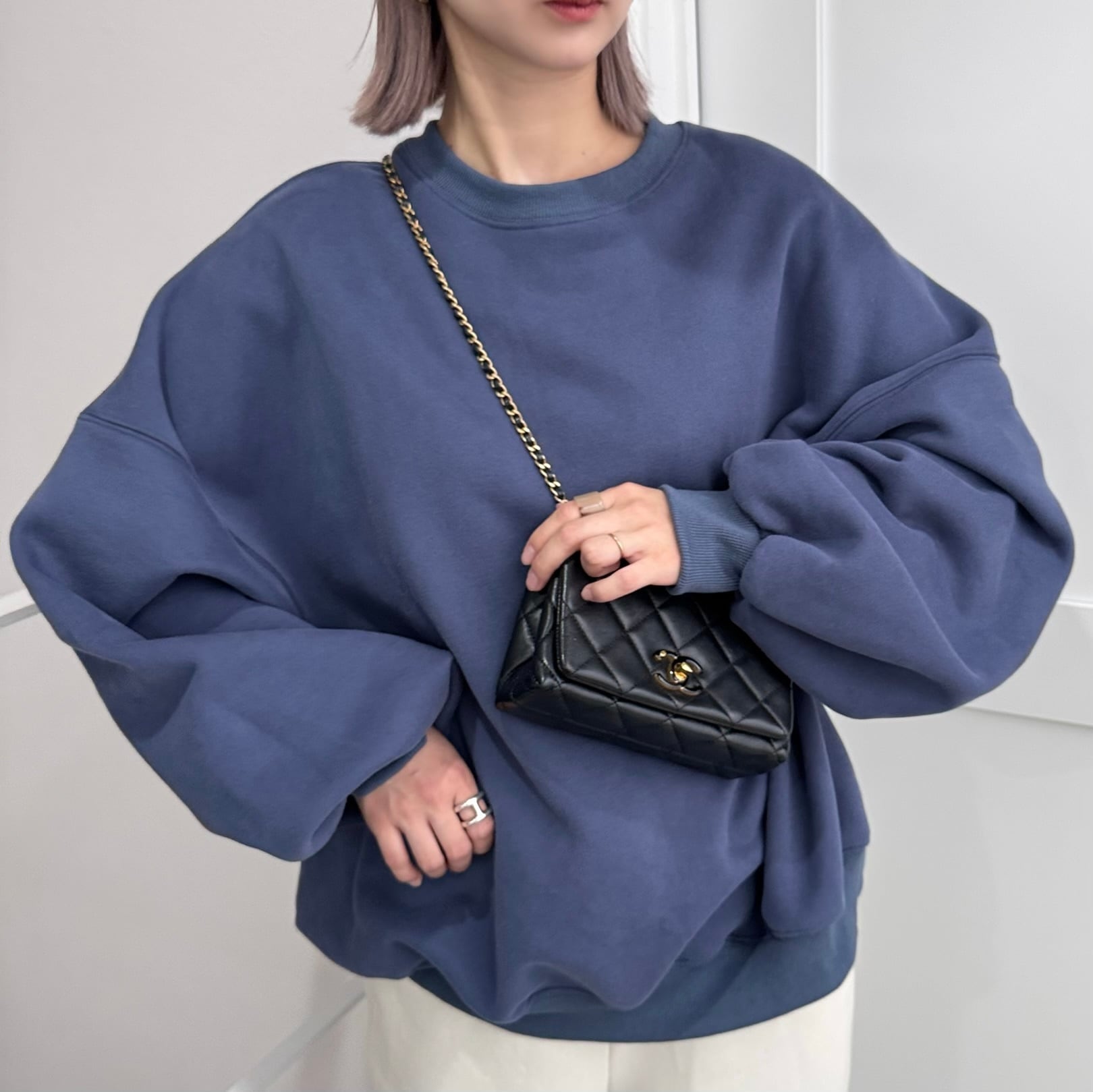 トレンドのビッグシルエットに、たっぷりとしたボリュームスリーブを落とし込んだ裏起毛スウェットプルオーバー。袖の丸みと肩の落ち感が、立体感を生み出し、着るだけで旬なバランスが完成します。全体にゆとりのあるシルエットながらも、サイドに向かって自然に落ちるシェイプが、ラフすぎない印象にまとめてくれます。軽さと暖かさを両立した着心地は、デイリーウェアとしてもパーフェクト。袖口・裾・ネックラインにはテンションのあるリブを施し、メリハリを効かせることでルーズになりすぎず、スッキリ見せが叶います。