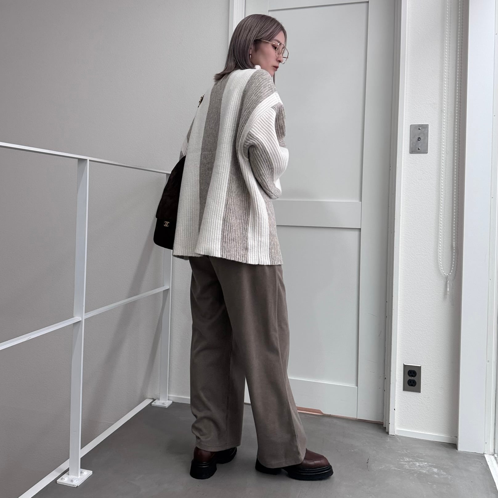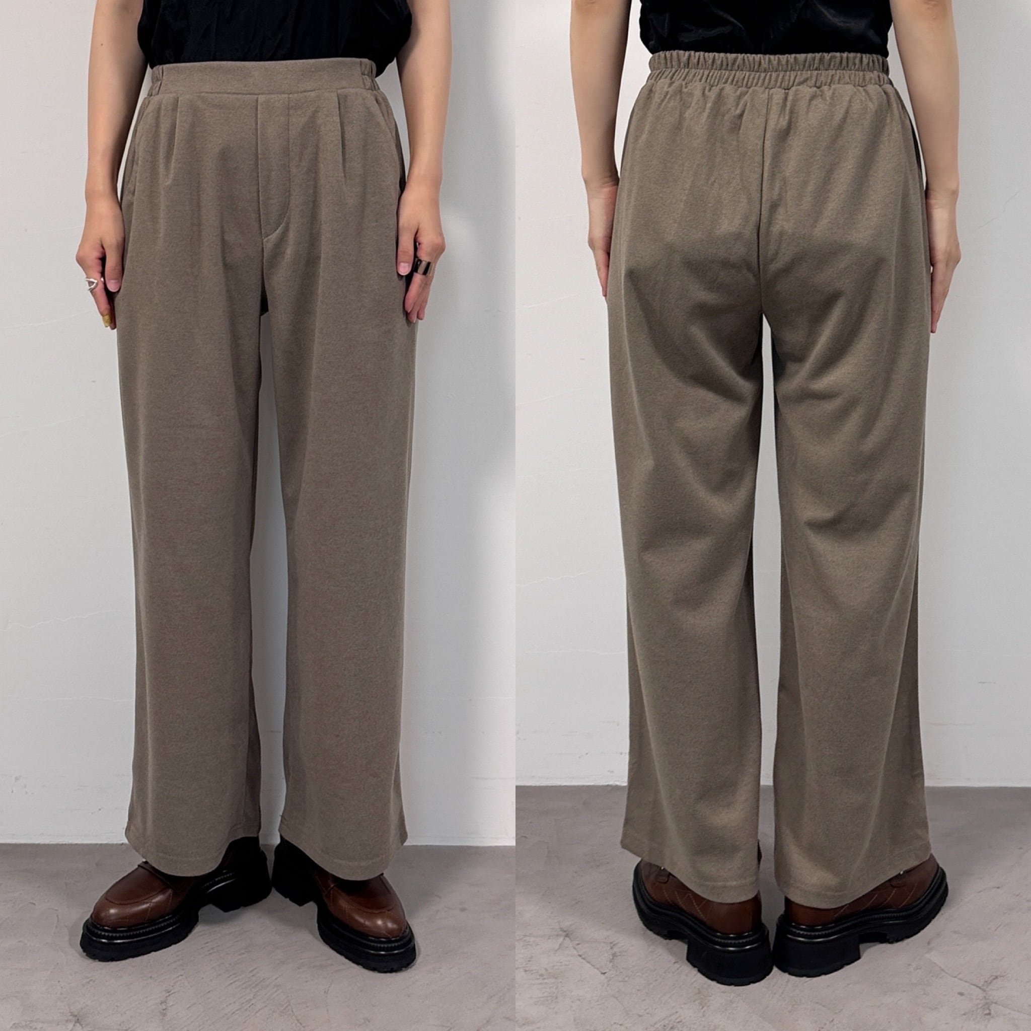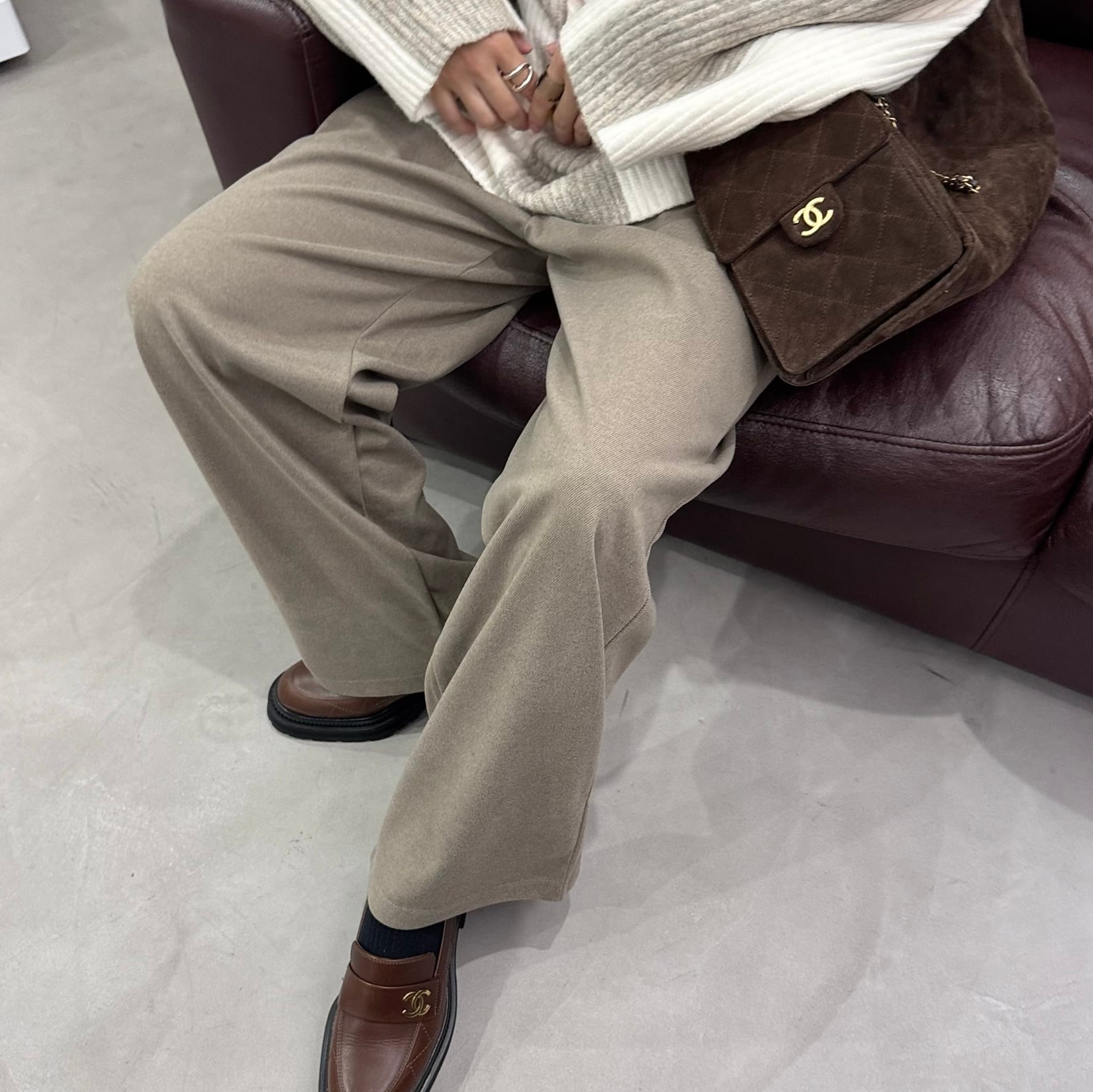 ウールタッチな生地を使用したストレートパンツ。ピーチスキンのような起毛感があり温もりのある柔らかい肌触りが特徴でこれからの時期に活躍する一枚。後ろのみゴムを使用になっておりストレスフリーな履き心地。コンパクトめなトップスと合わせてメリハリのあるスタイリングはもちろん、ボリュームのあるトップスとあわせて抜け感のあるスタイリングもおすすめです。