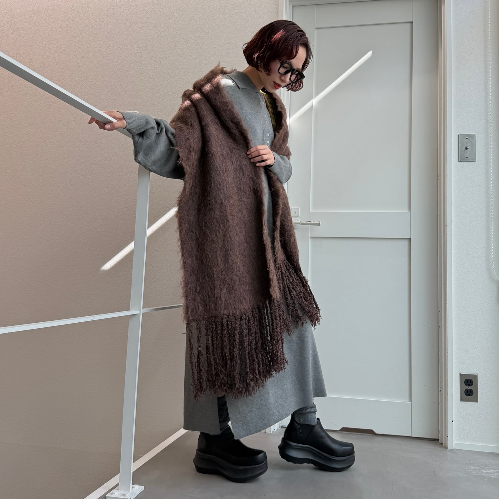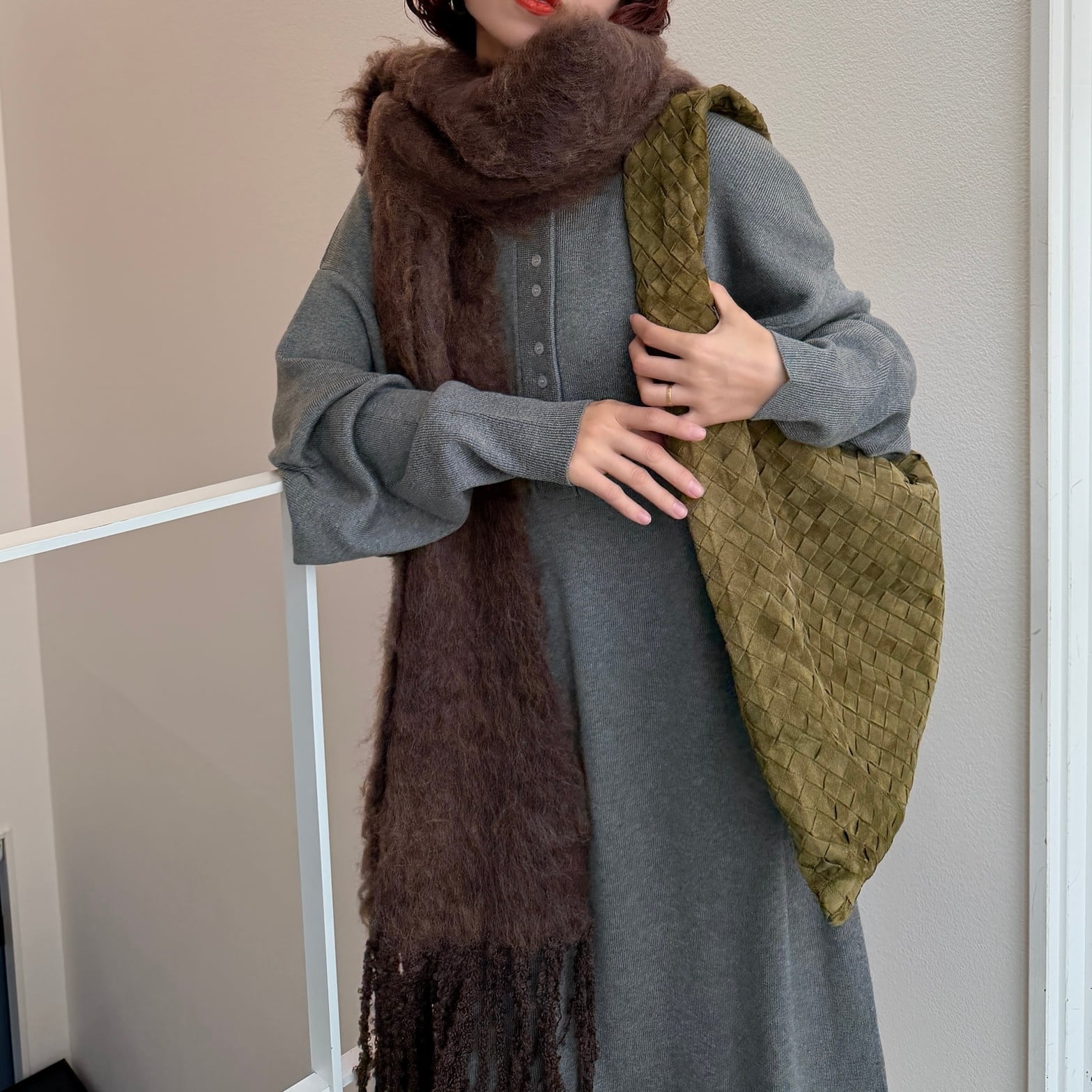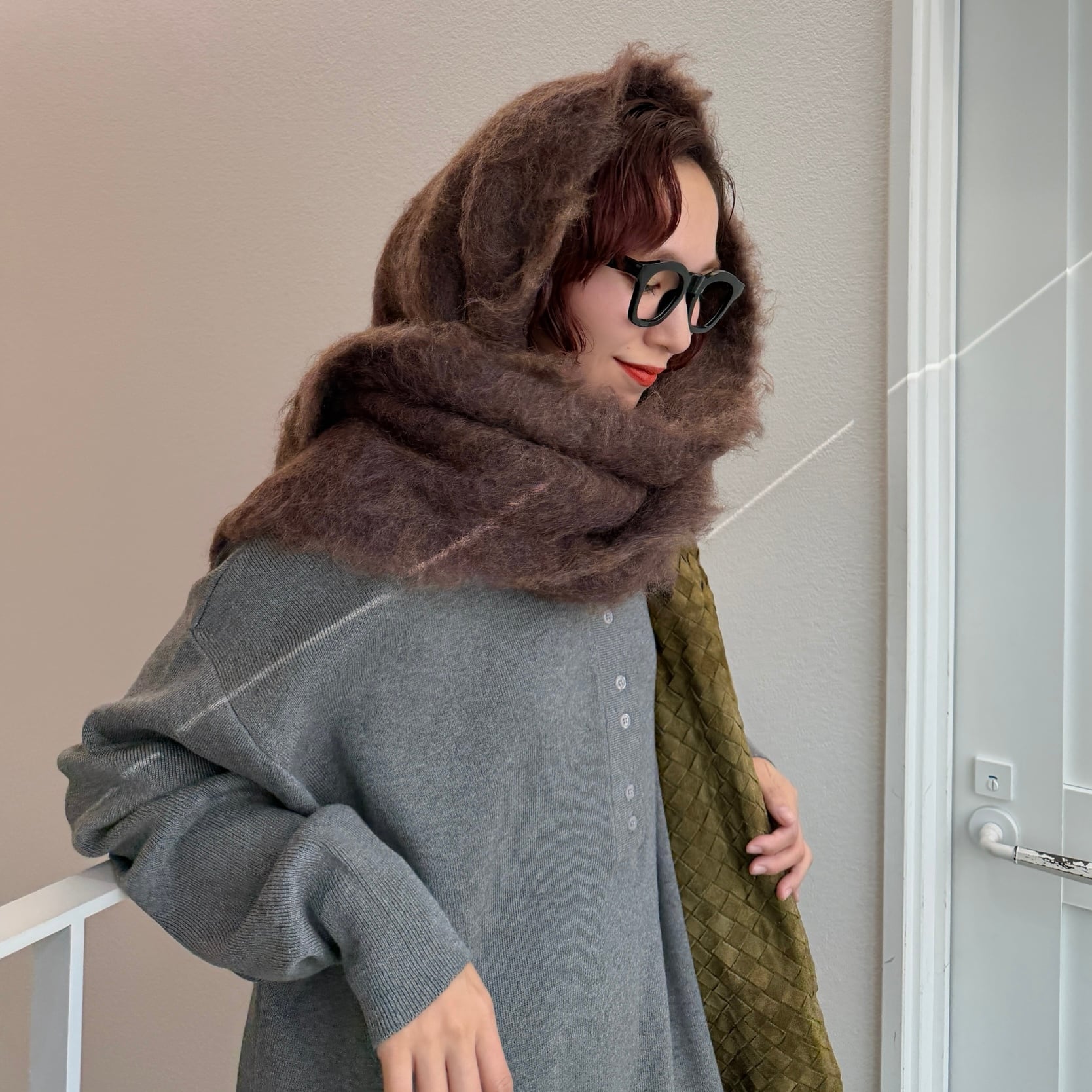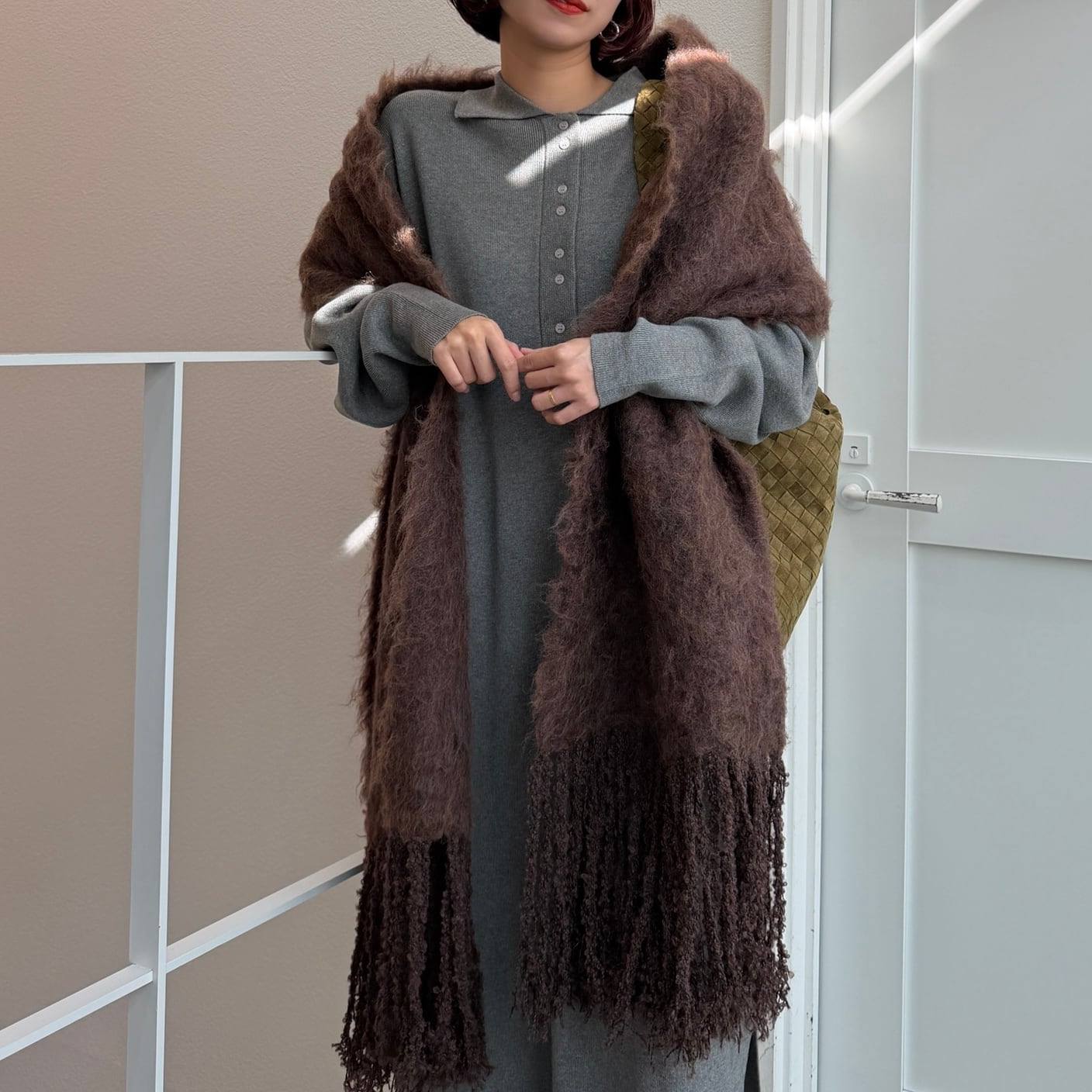 ふんわりと柔らかな、シャギーフリンジストールマフラー。長めのフリンジが、動くたびに表情豊かに揺れ、華やかさをプラスしてくれます。シンプルなデザインで、様々なスタイリングに合わせやすいのも魅力です。巻き方次第で様々な表情を楽しめ、首元にボリュームを持たせると小顔効果も◎ 大きめのサイズなので羽織ったり、ひざ掛けにしたりと寒い季節にぴったり です。
