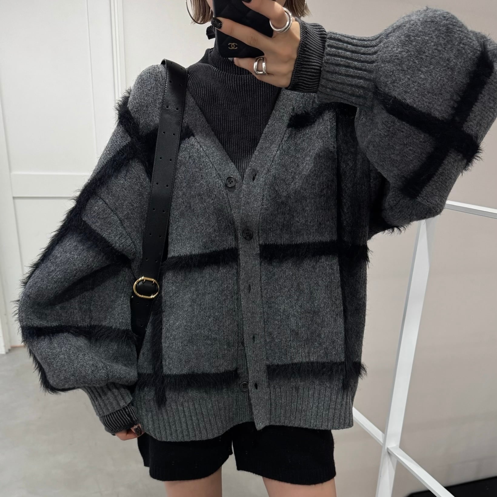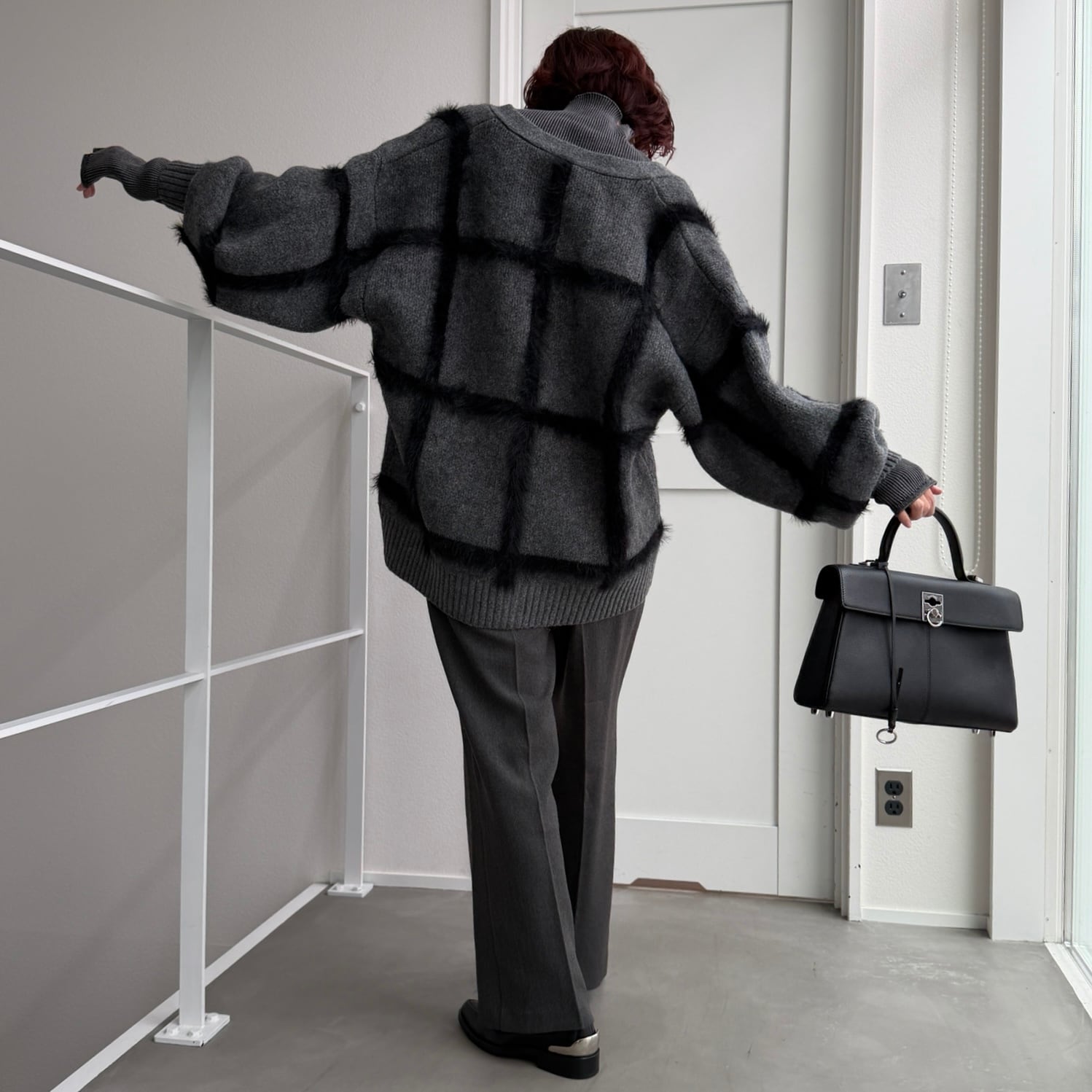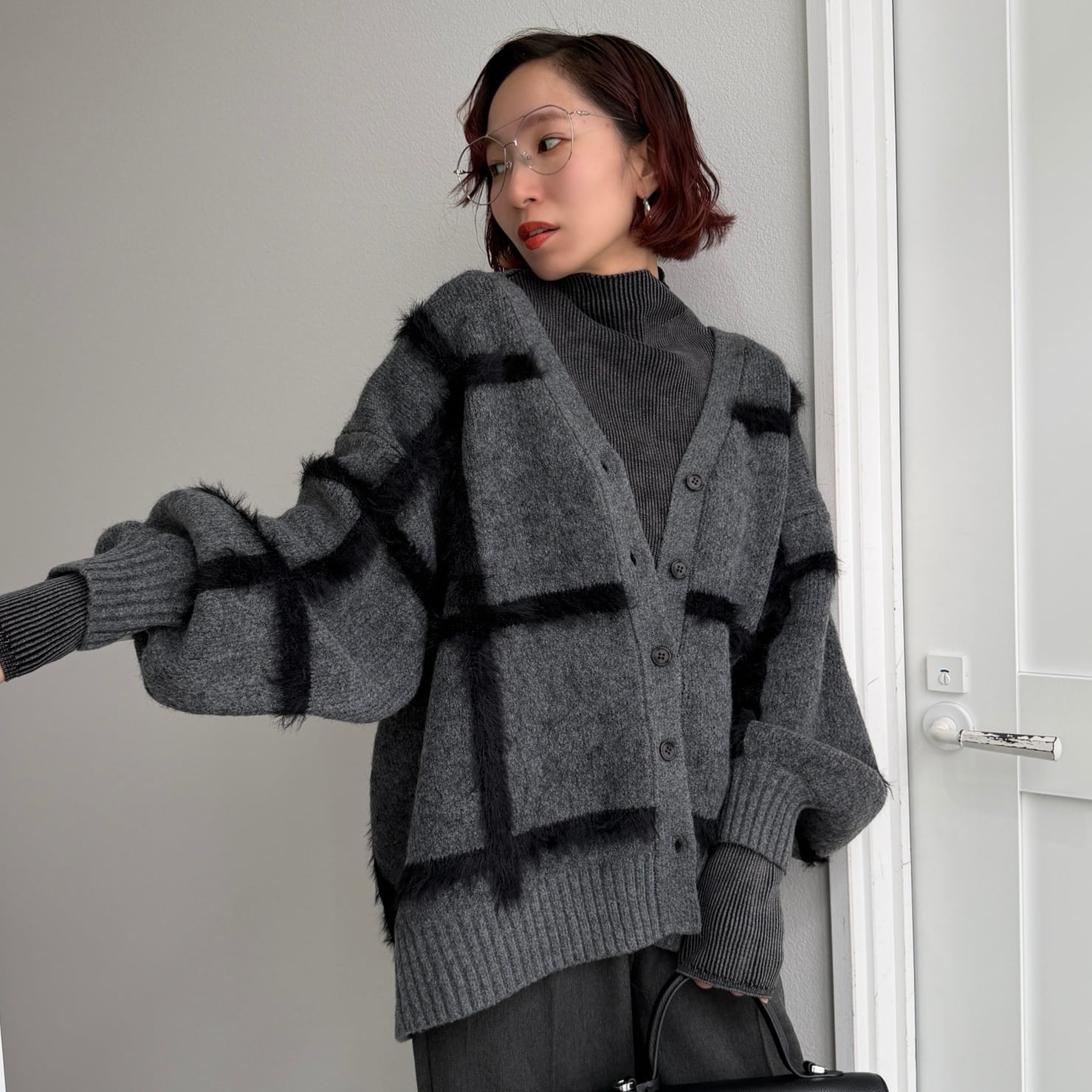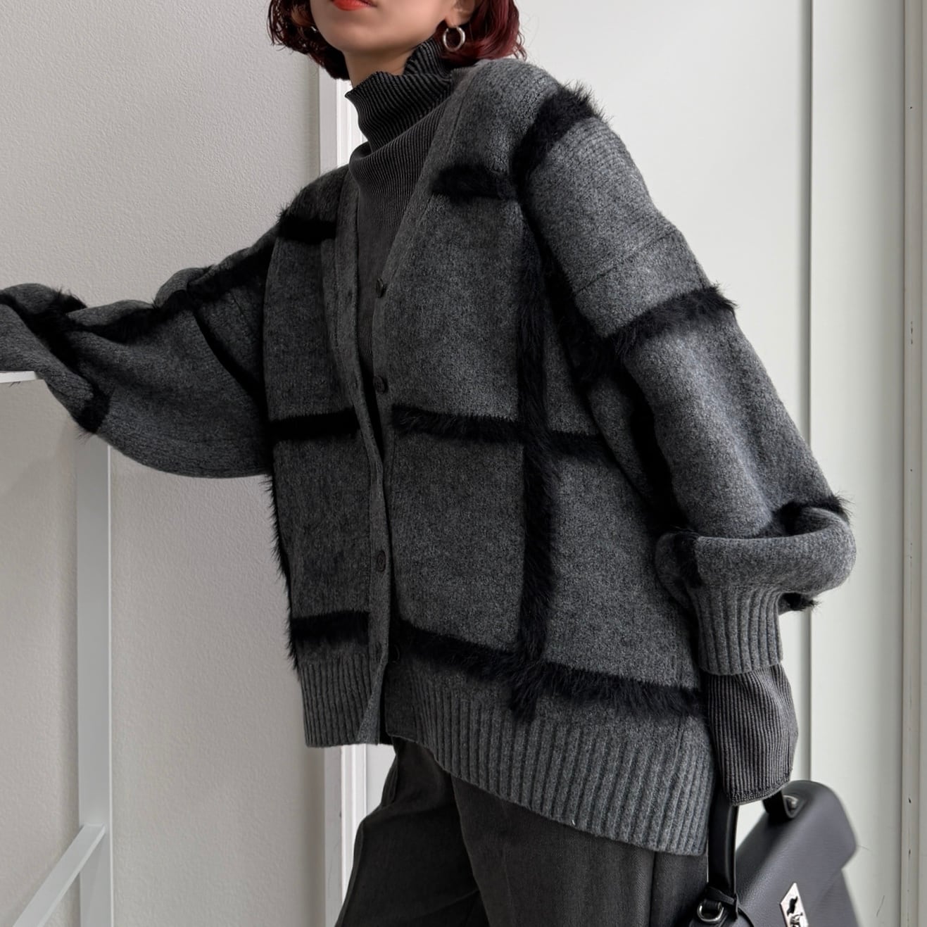 秋冬の装いに華やかさをプラスするチェック柄のVネックカーディガン。大きなチェックデザインが目を惹きます。シャギー部分は毛足が長く立体的な表面感に、少しもっちりした質感がやみつきに。着丈は程良く長めなので体型カバーも◎少し深めのVネックで抜け感もありつつ、目を惹く新鮮なカラーリングが魅力の一着。