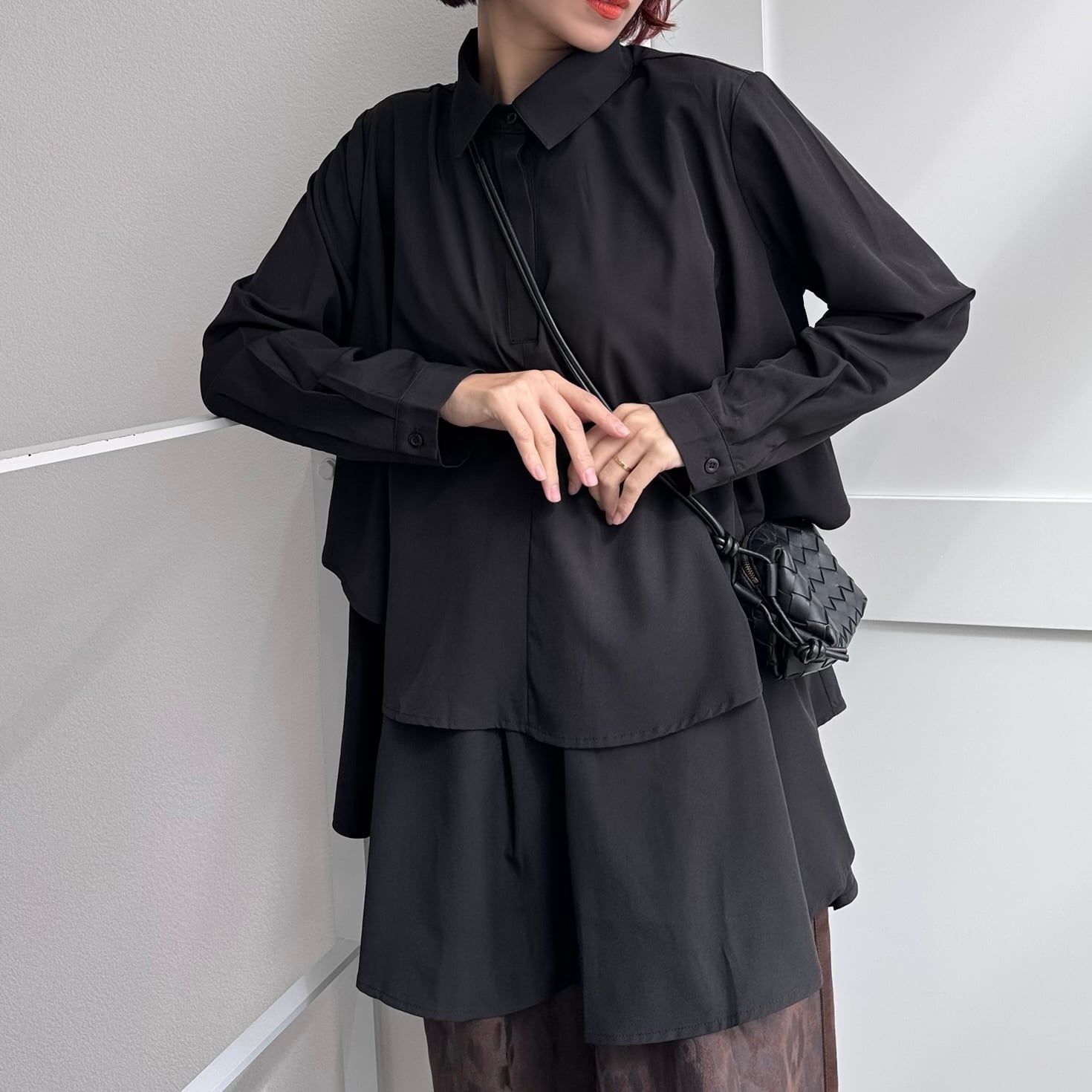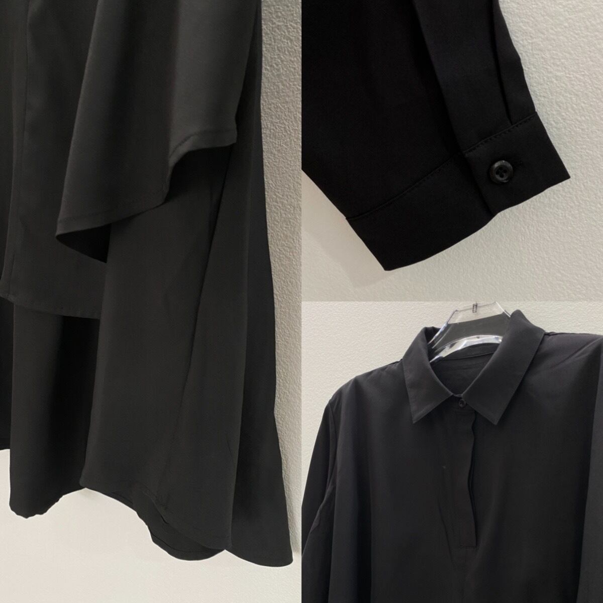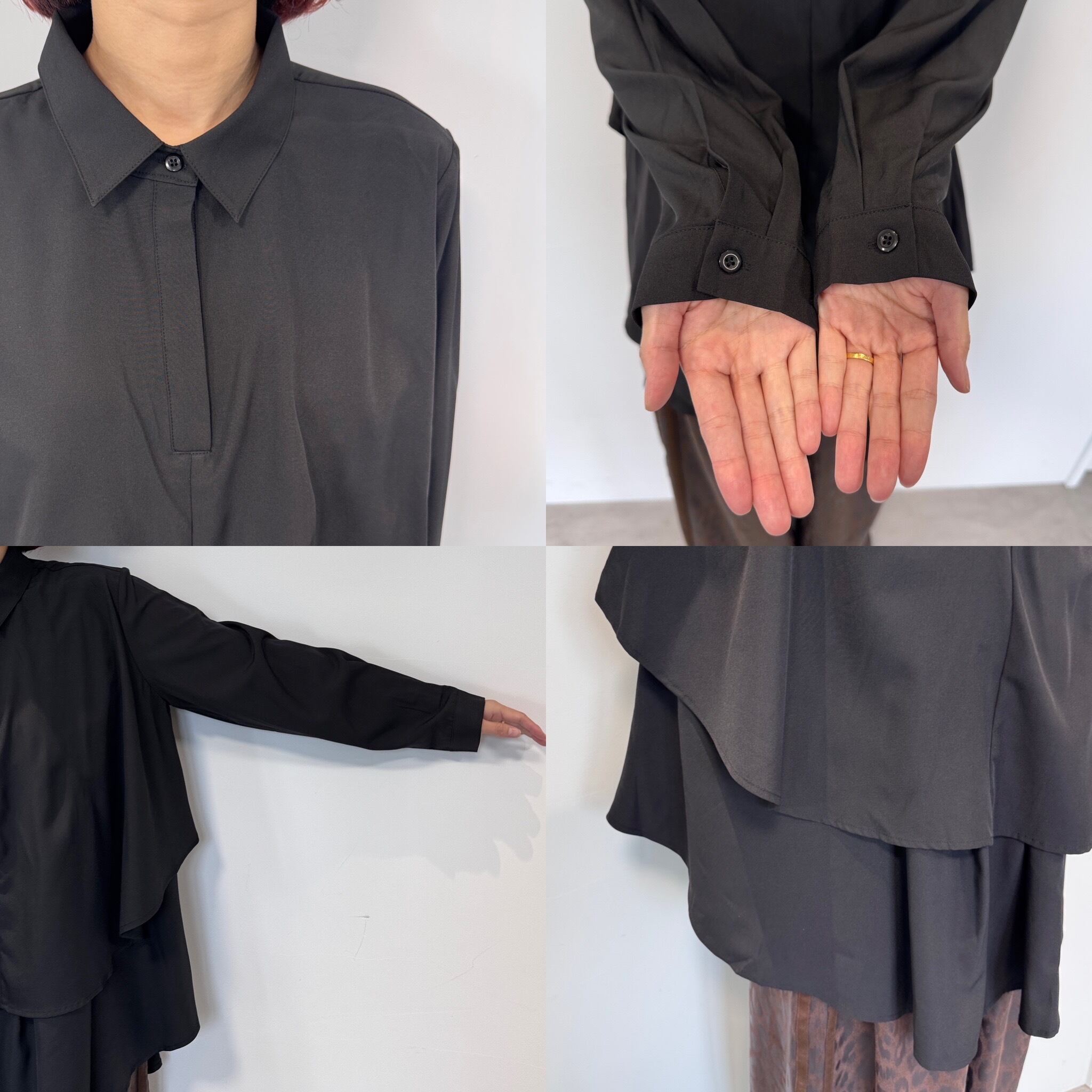 ウエスト下からの切り替えのレイヤードされたカッテイングが動きがありデザイン性のあるシャツ。裾はドレープのようになっていて華やかな雰囲気に。ジャケット等カチッとしたアウターに合わせるとオケージョンシーンにもおすすめの一枚。身幅たっぷりで体型カバーできるのも嬉しいポイント。