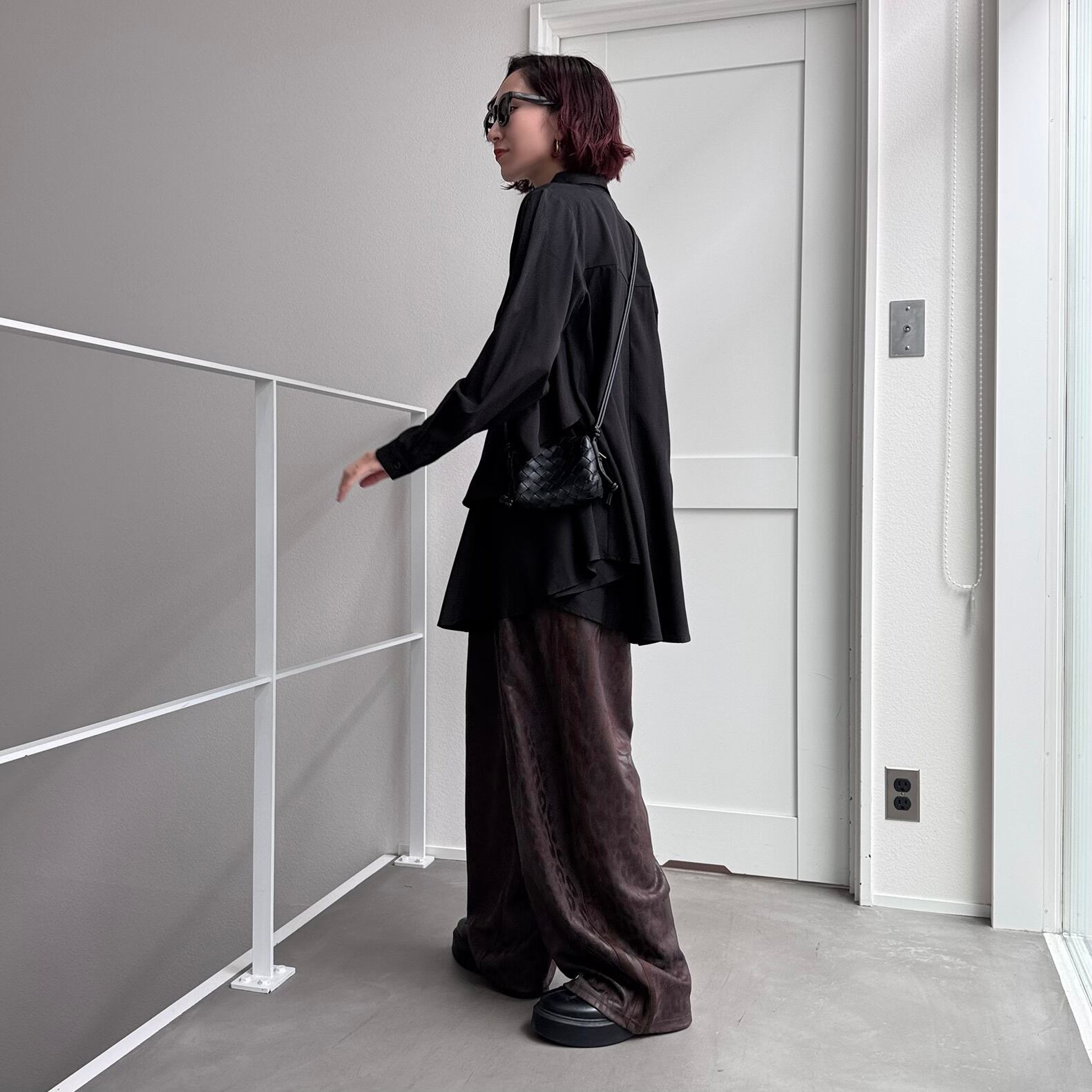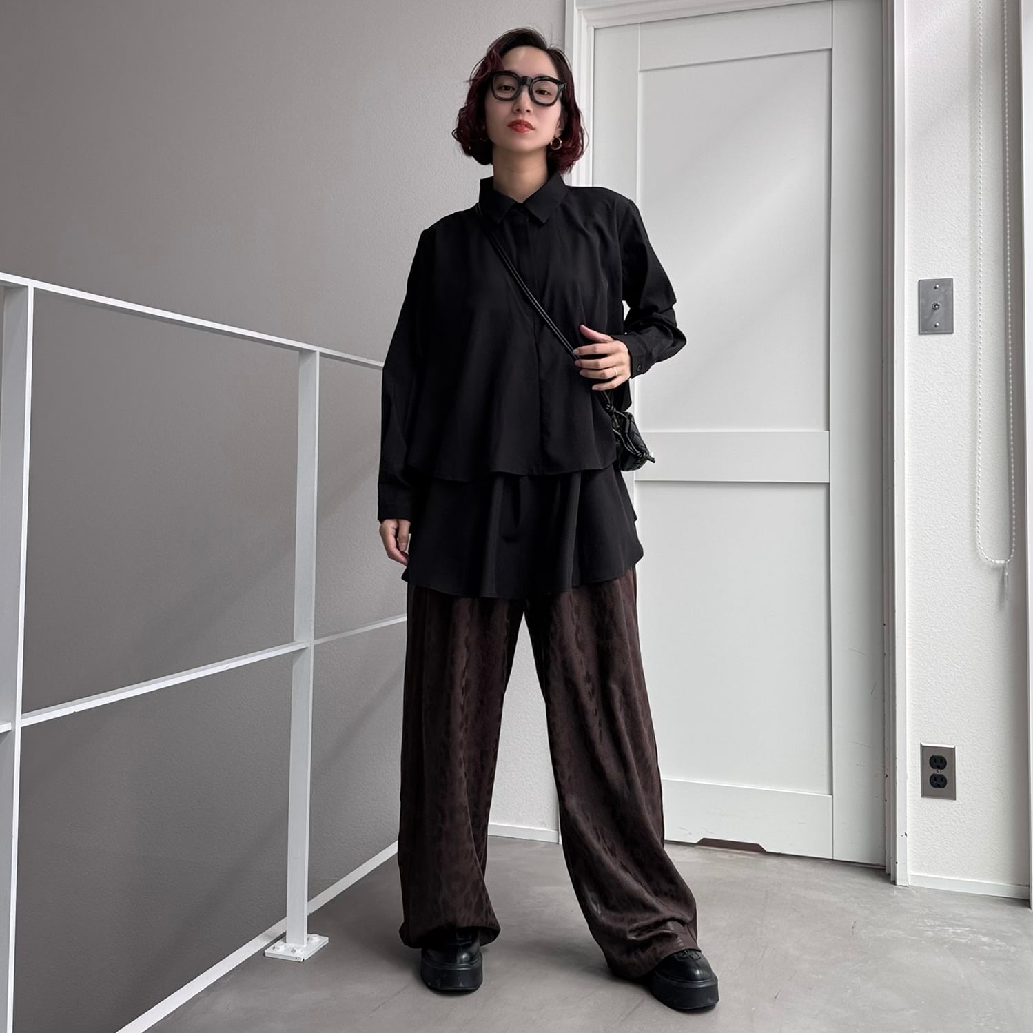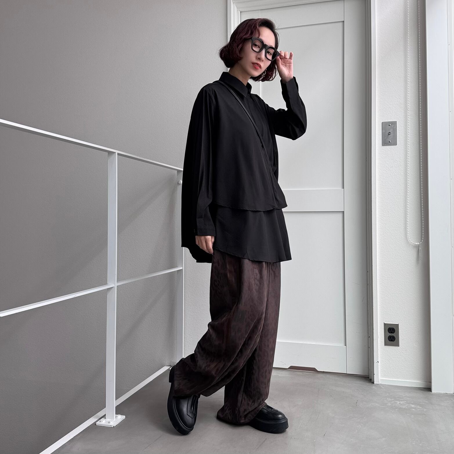 ウエスト下からの切り替えのレイヤードされたカッテイングが動きがありデザイン性のあるシャツ。裾はドレープのようになっていて華やかな雰囲気に。ジャケット等カチッとしたアウターに合わせるとオケージョンシーンにもおすすめの一枚。身幅たっぷりで体型カバーできるのも嬉しいポイント。