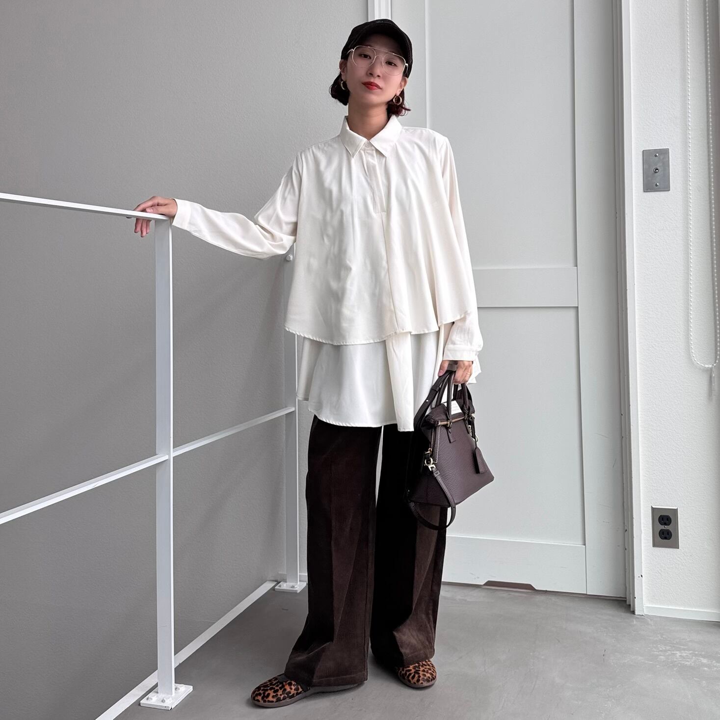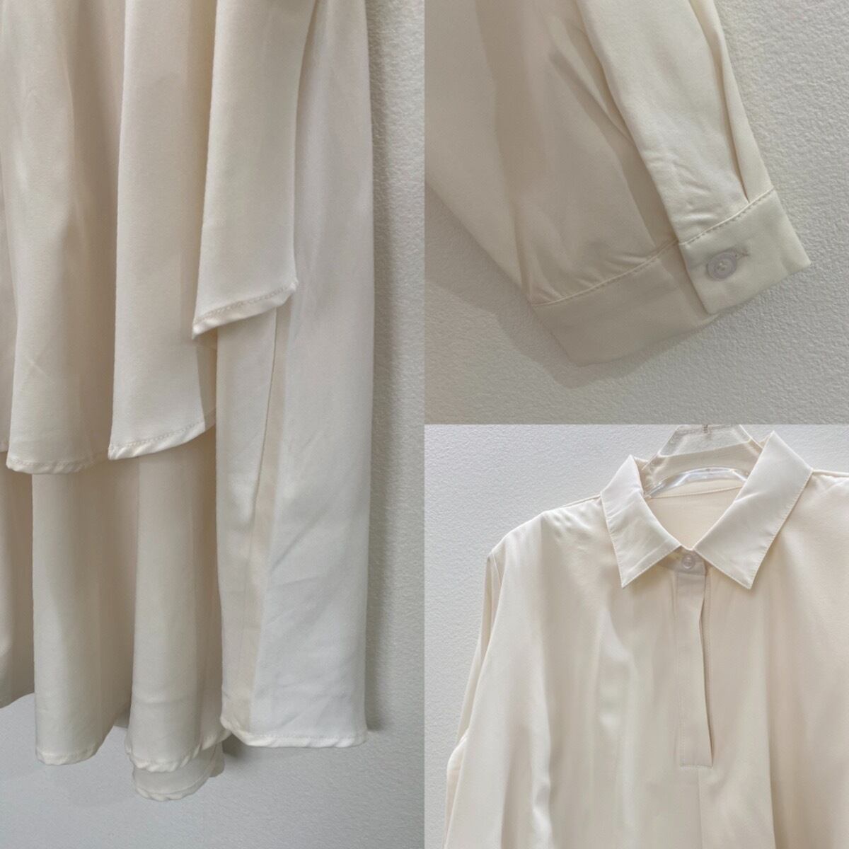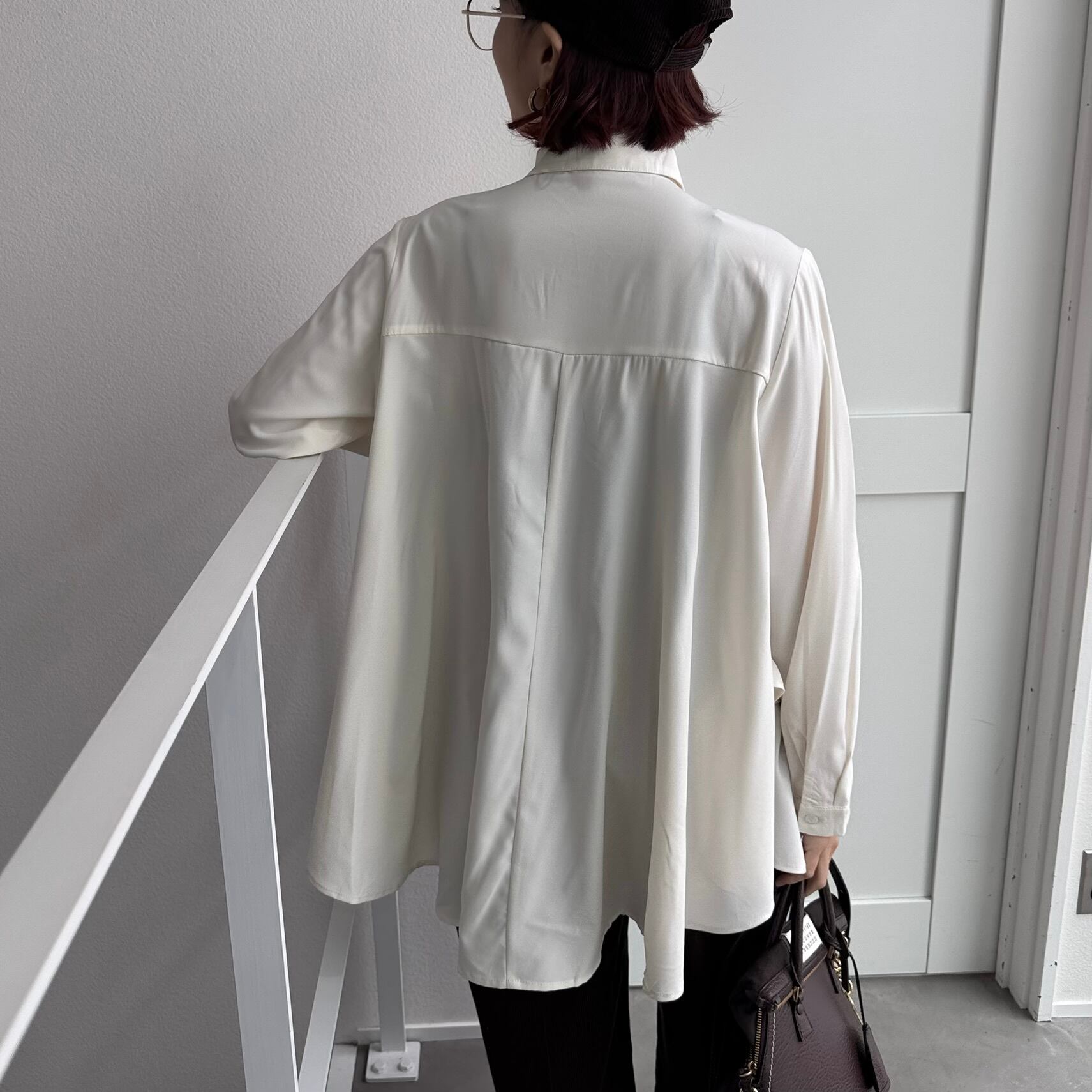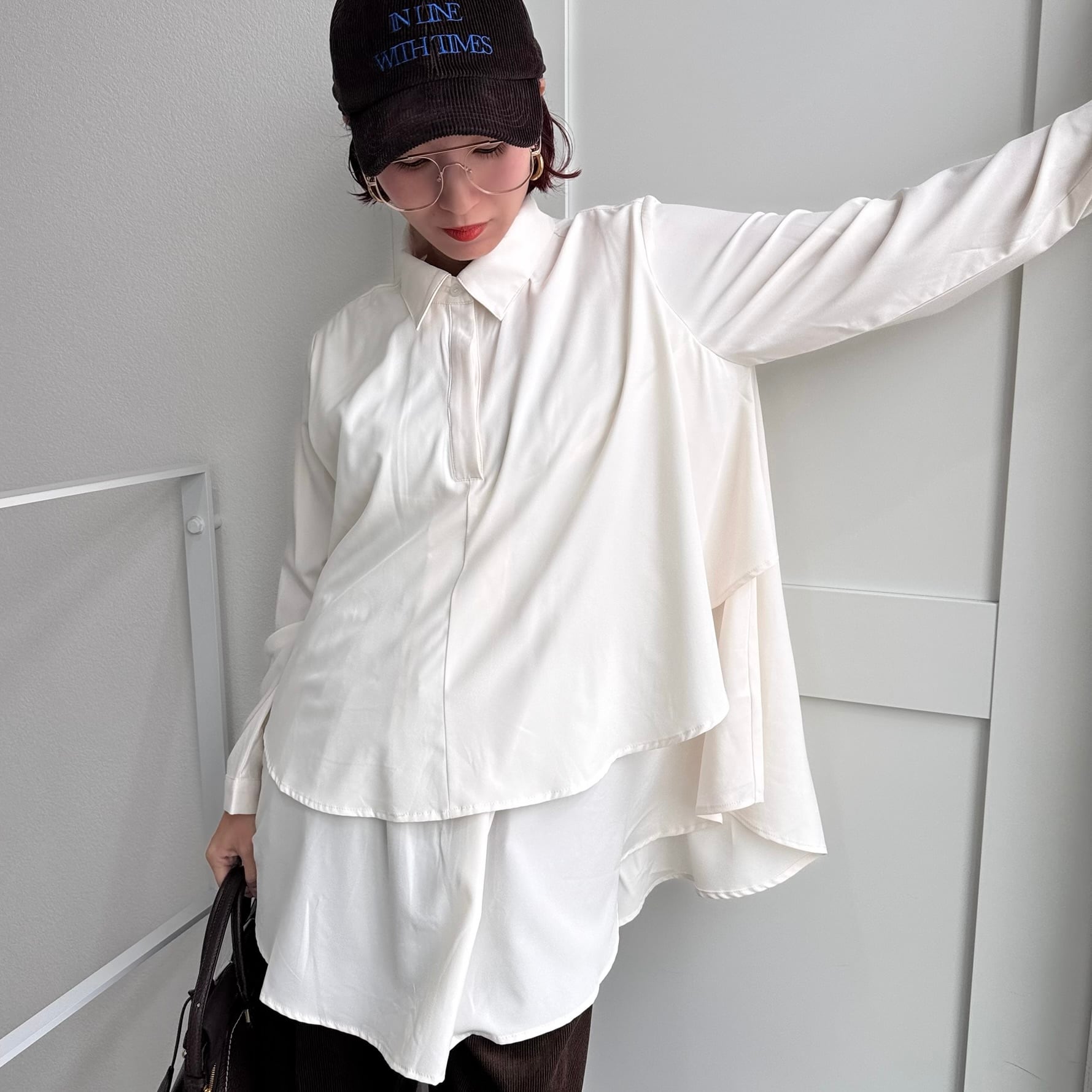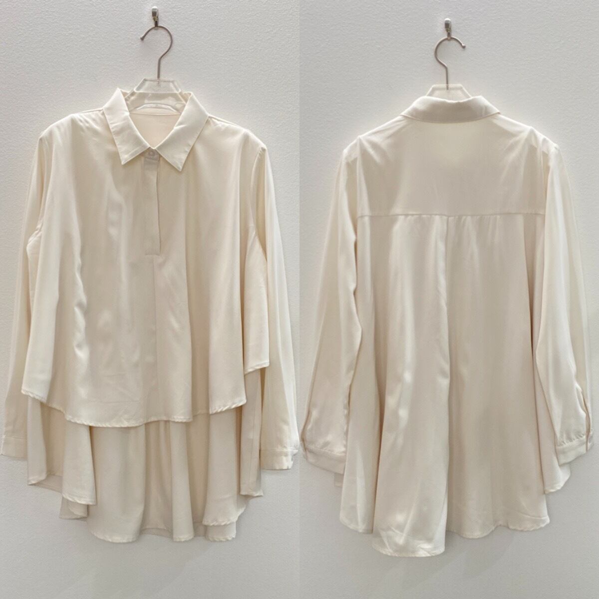 ウエスト下からの切り替えのレイヤードされたカッテイングが動きがありデザイン性のあるシャツ。裾はドレープのようになっていて華やかな雰囲気に。ジャケット等カチッとしたアウターに合わせるとオケージョンシーンにもおすすめの一枚。身幅たっぷりで体型カバーできるのも嬉しいポイント。