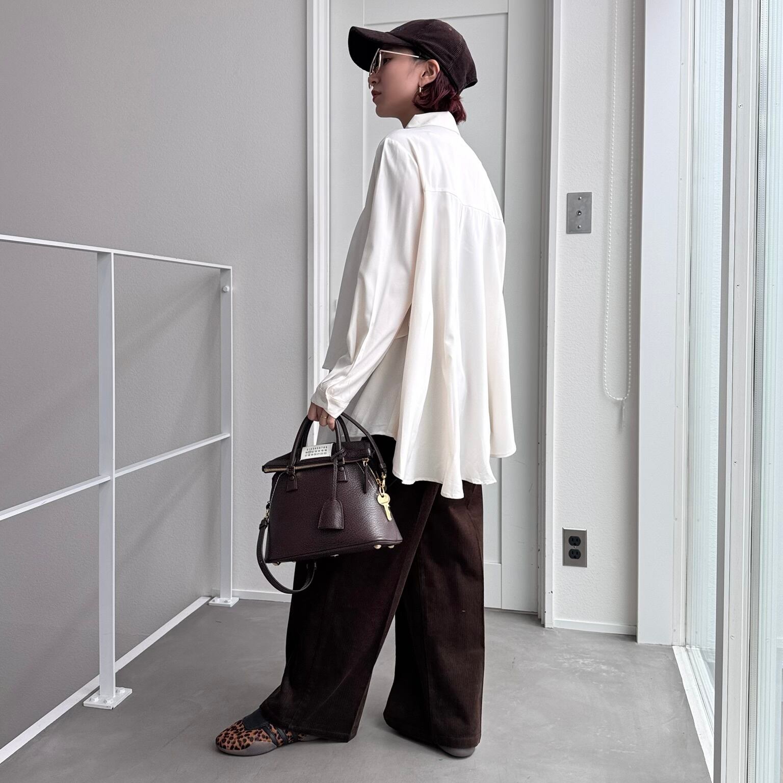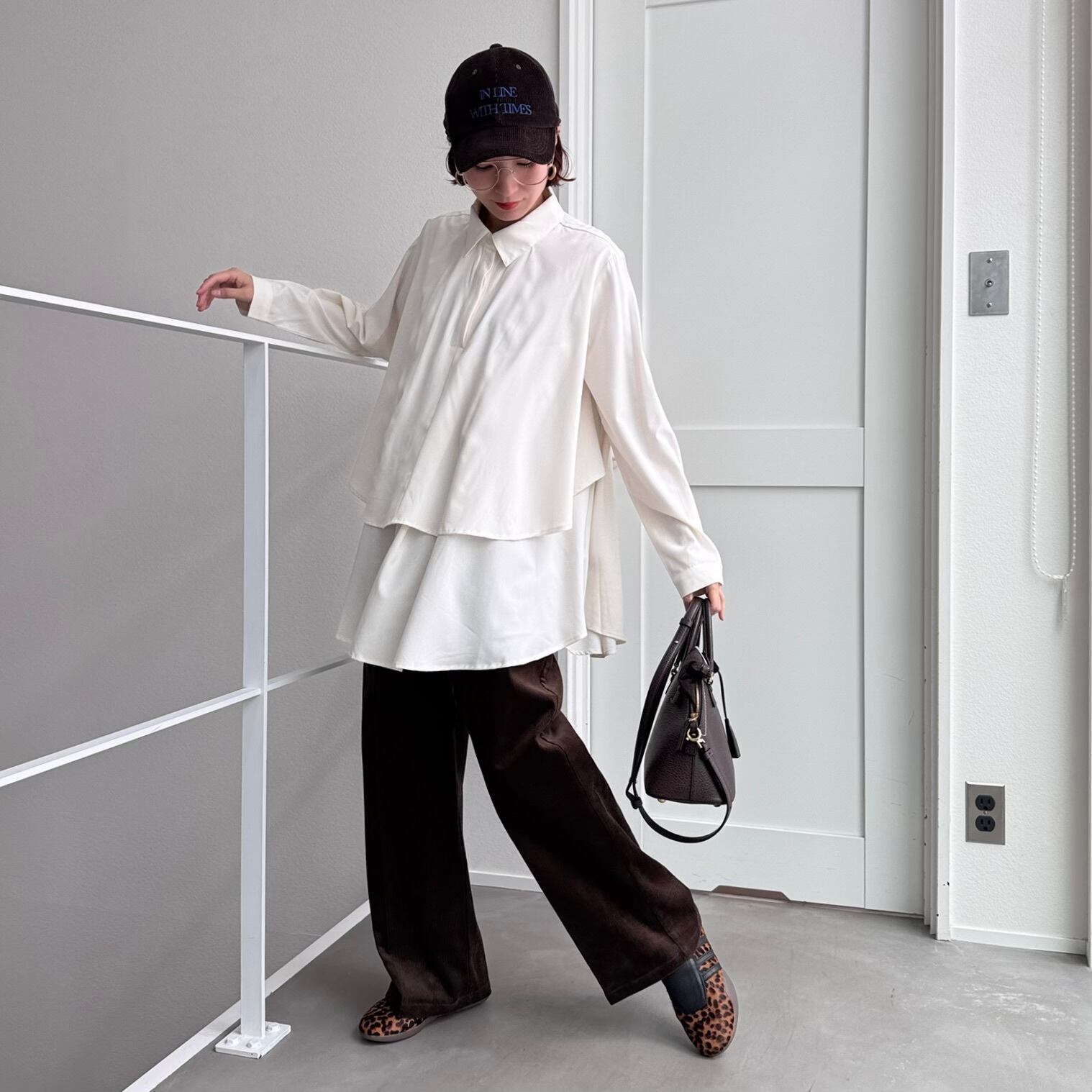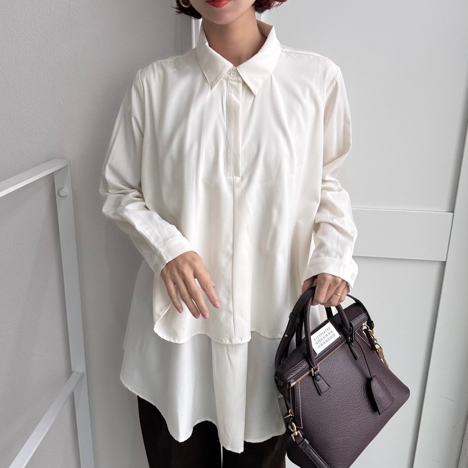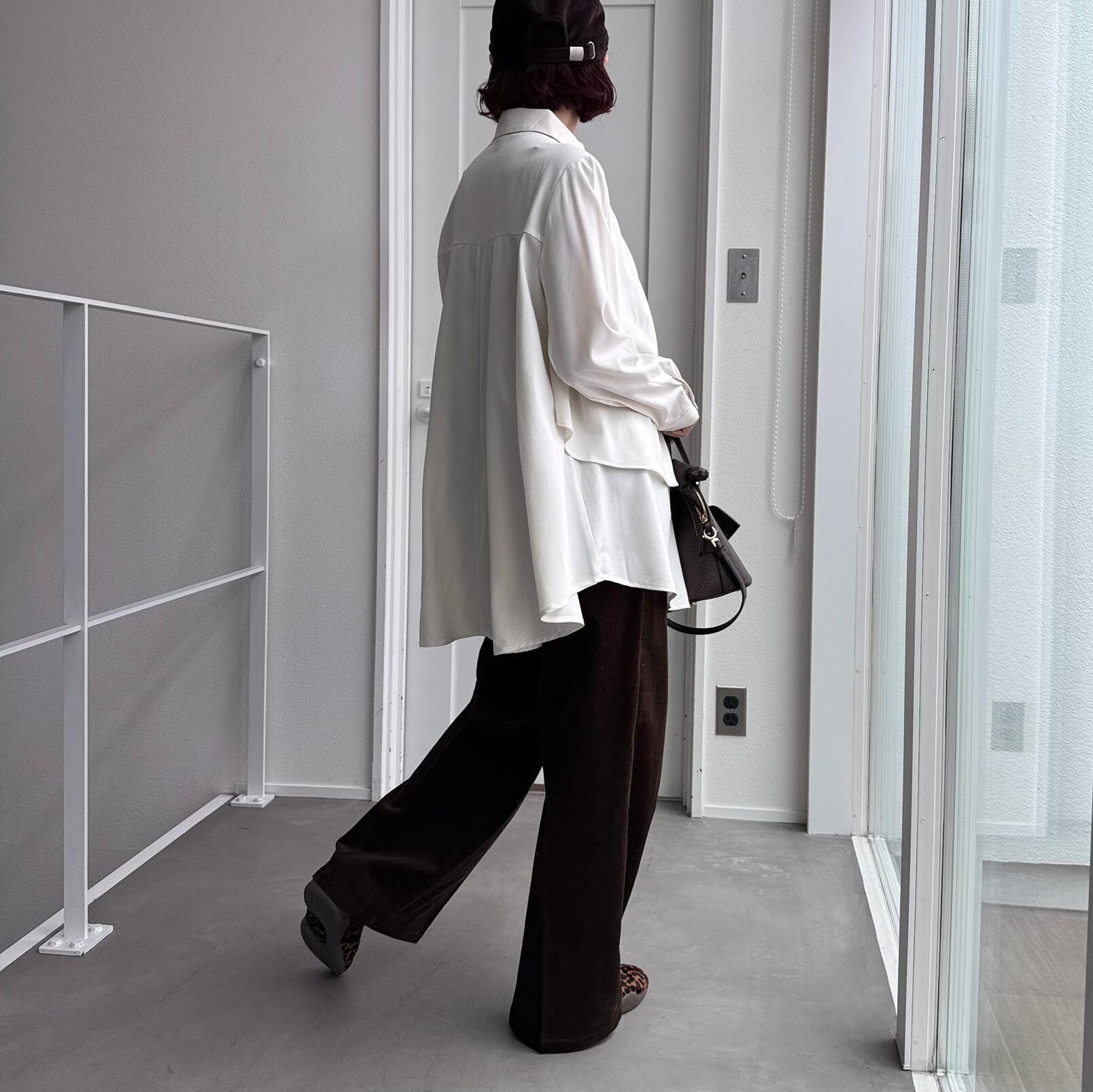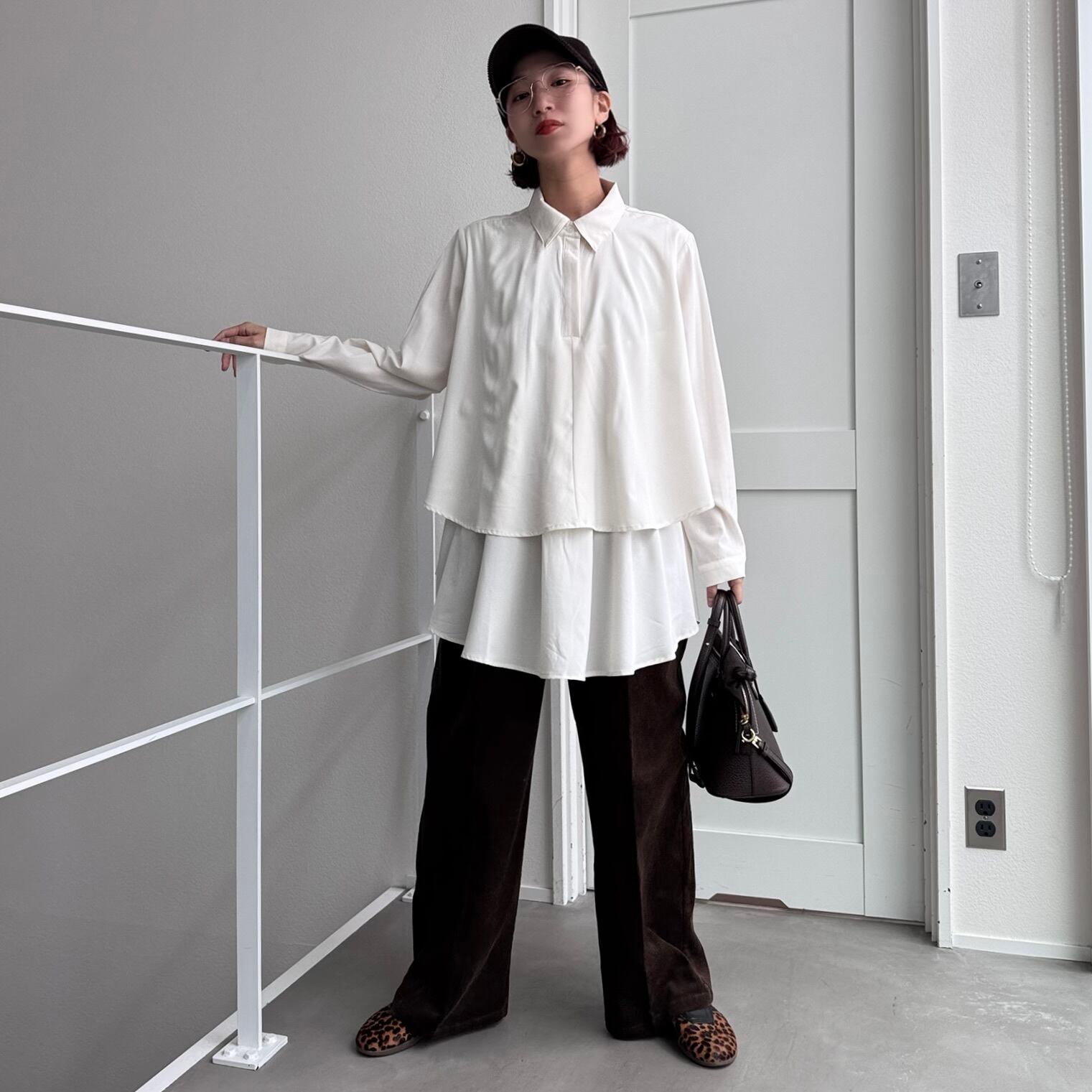 ウエスト下からの切り替えのレイヤードされたカッテイングが動きがありデザイン性のあるシャツ。裾はドレープのようになっていて華やかな雰囲気に。ジャケット等カチッとしたアウターに合わせるとオケージョンシーンにもおすすめの一枚。身幅たっぷりで体型カバーできるのも嬉しいポイント。