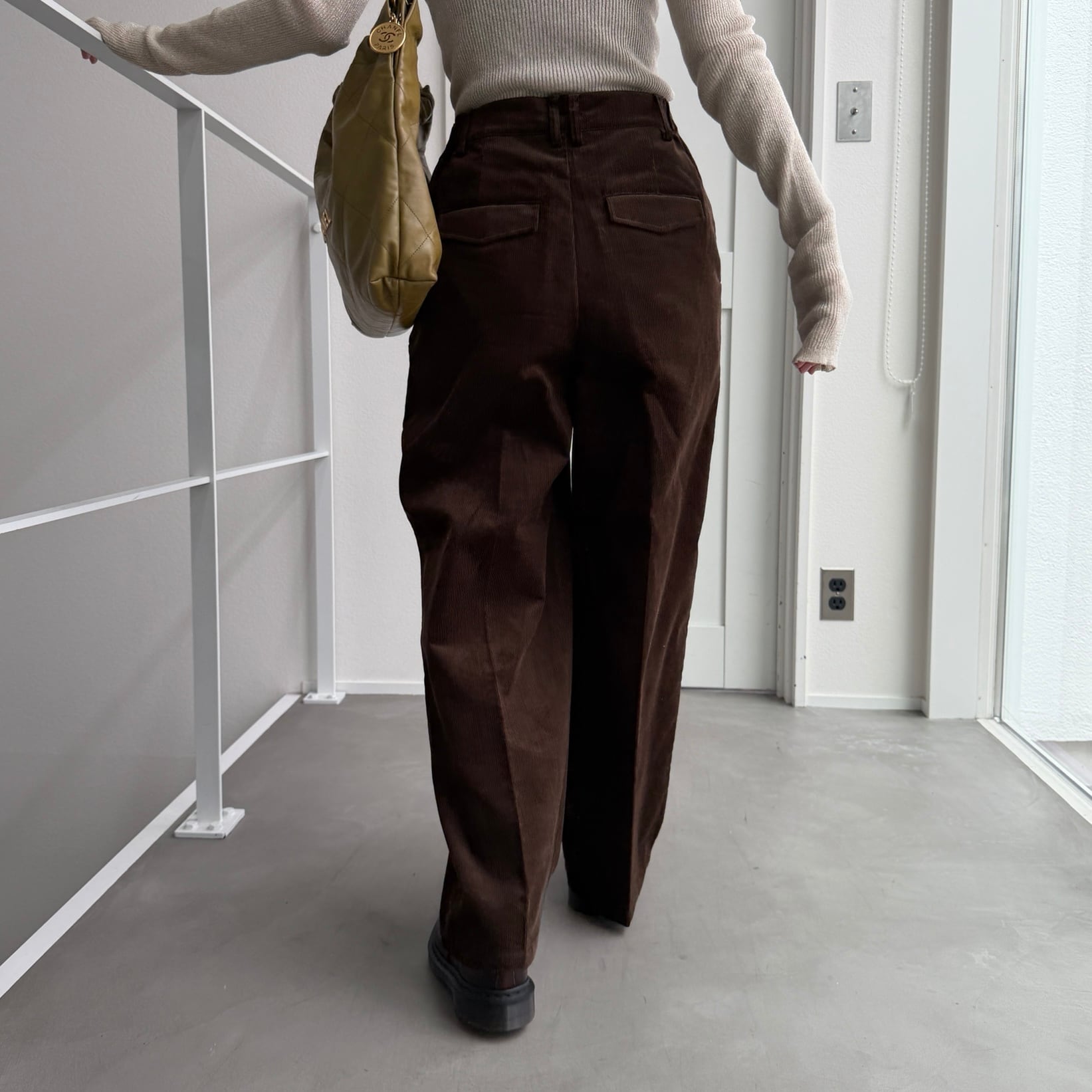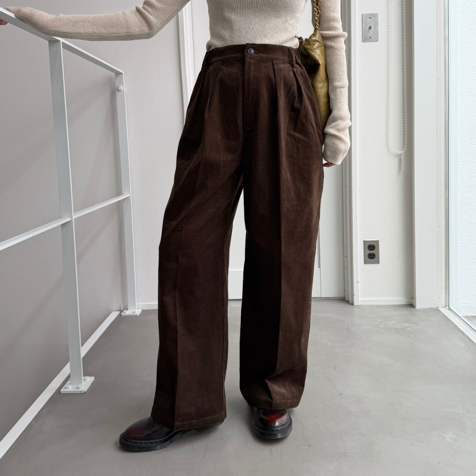 シーズンモード高まる見た目もあたたかみのあるヴィンテージライクな質感細コールパンツ。程よくゆとりのあるワイドシルエットです。ウエストにはサイドゴム入りで、ストレスフリーな履き心地もポイント。フロント、バックポケット付きで機能性も充実したアイテム。デイリー使いにも合わせやすくトップスを選びません。