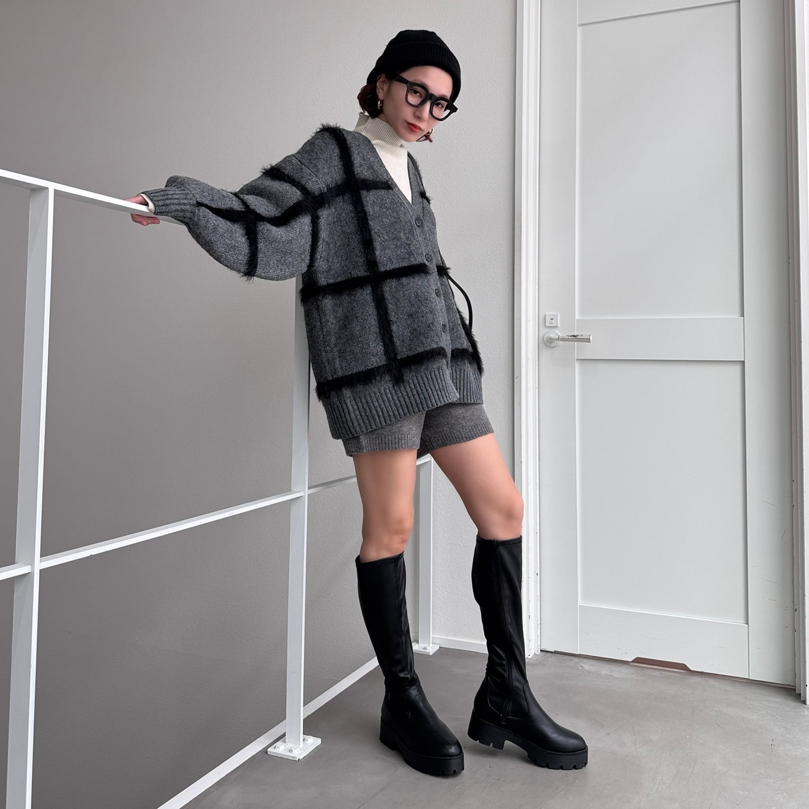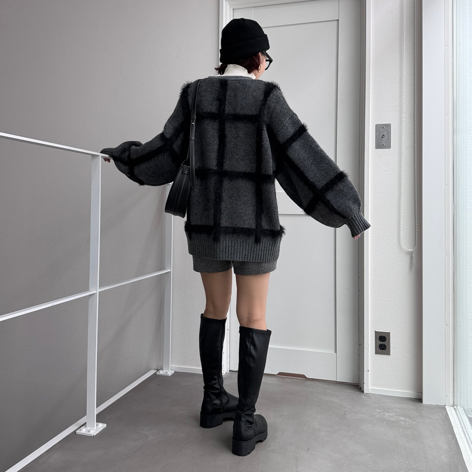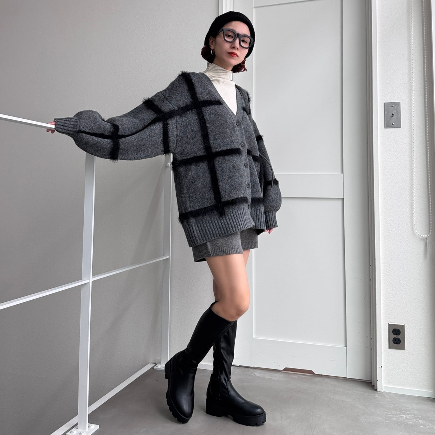 cardigan:ラージチェックニットCD/チャコール
