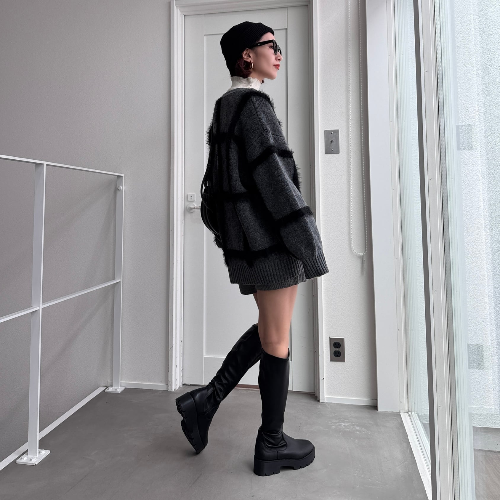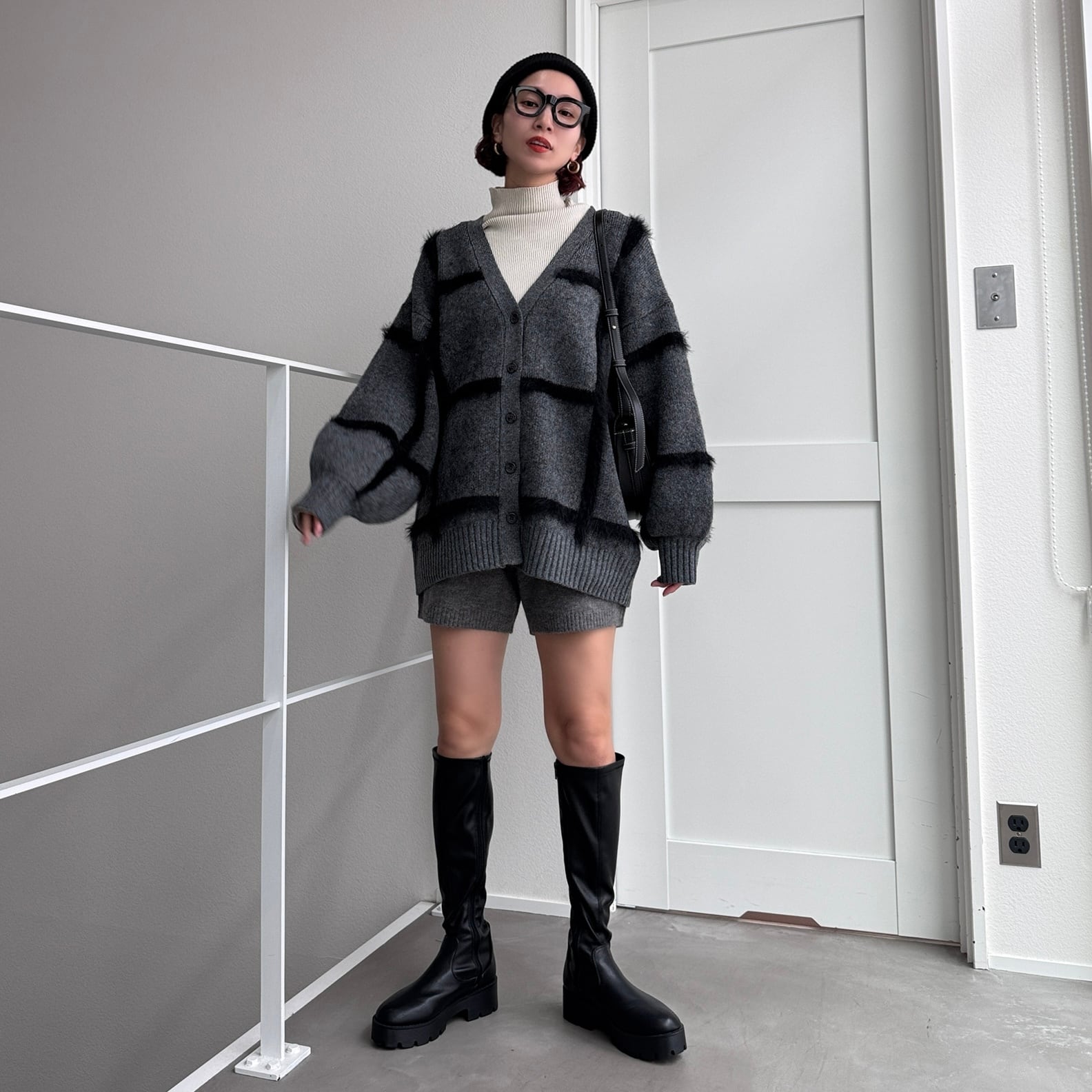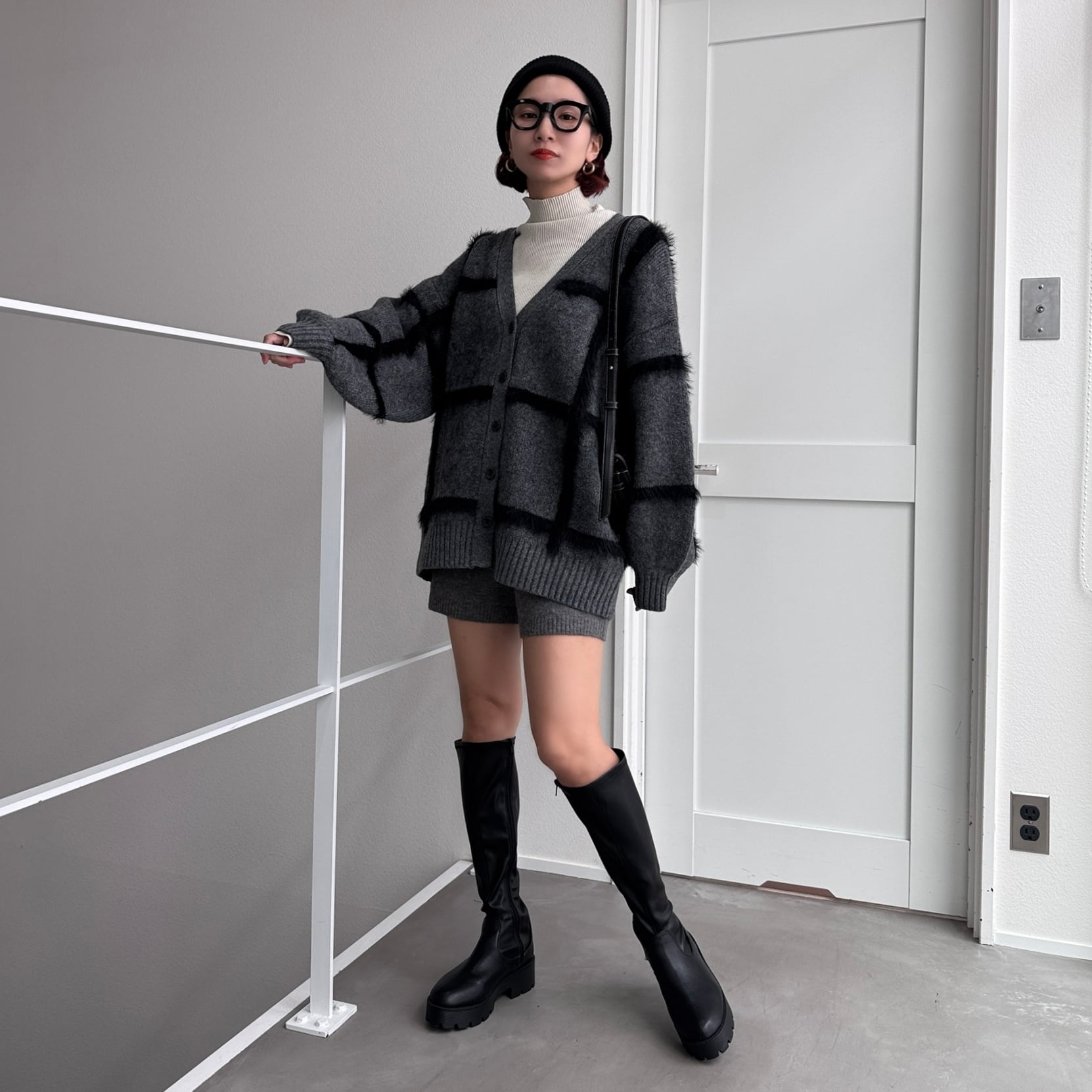 cardigan:ラージチェックニットCD/チャコール