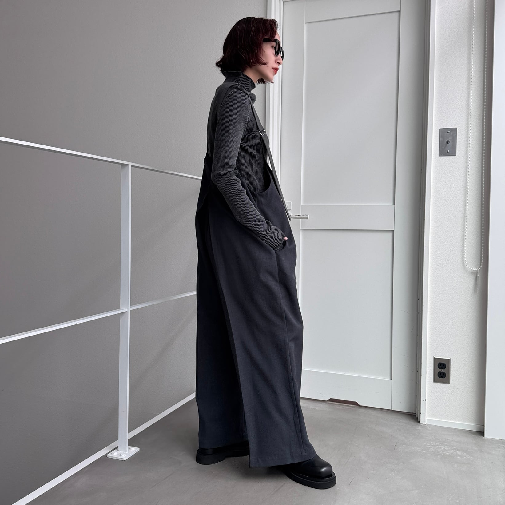 落ち感のある美しいIラインシルエットで魅せるタックサロペットパンツ。フロントにもタックデザインを施し、バックにも抜かりなく美しいタックを落とし込んだマニッシュな雰囲気の一枚。ストラップテープとの配色合わせがお洒落に決まります。絶妙なラフ感が、コンパクトなトップスと合わせるだけで大人の余裕を感じさせるスタイリングに。
