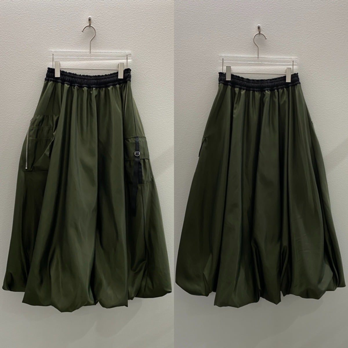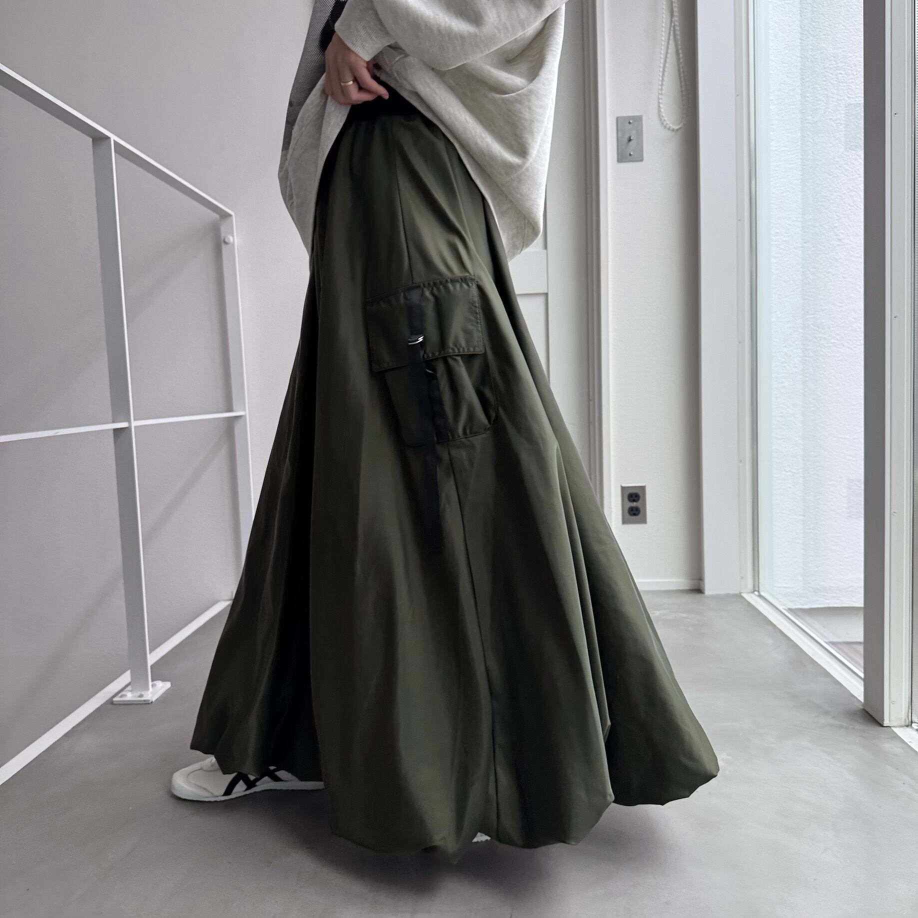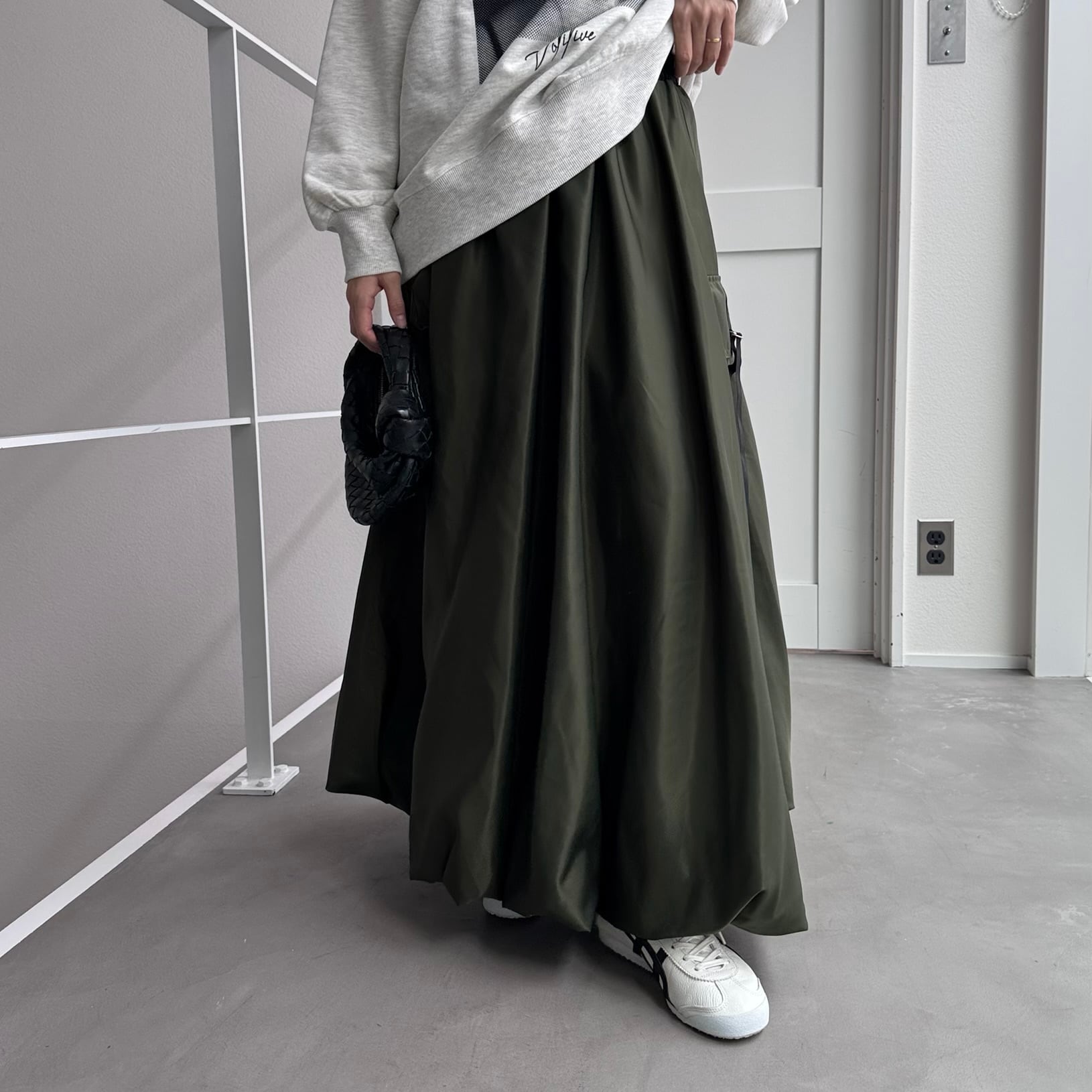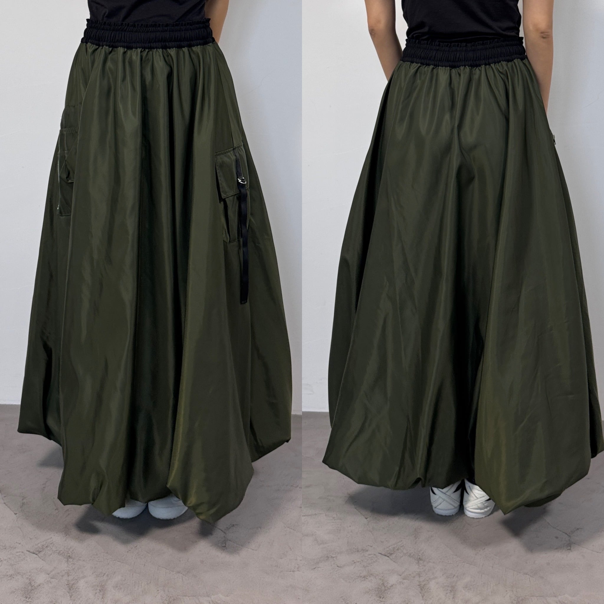 トレンドのバルーンシルエットにボリュームたっぷりのナイロンスカート。MA-1調のナイロン素材とポケットディテールを使用しておりモードなコーデからカジュアルコーデまで幅広くご使用いただけます。ウエストはゴム仕立てになっており内側には紐でサイズ調節可能なのでサイズは問いません。立体的なシルエットなので体型カバーしつつ動くたびにふんわりと揺れ大人可愛い女性を演出します。