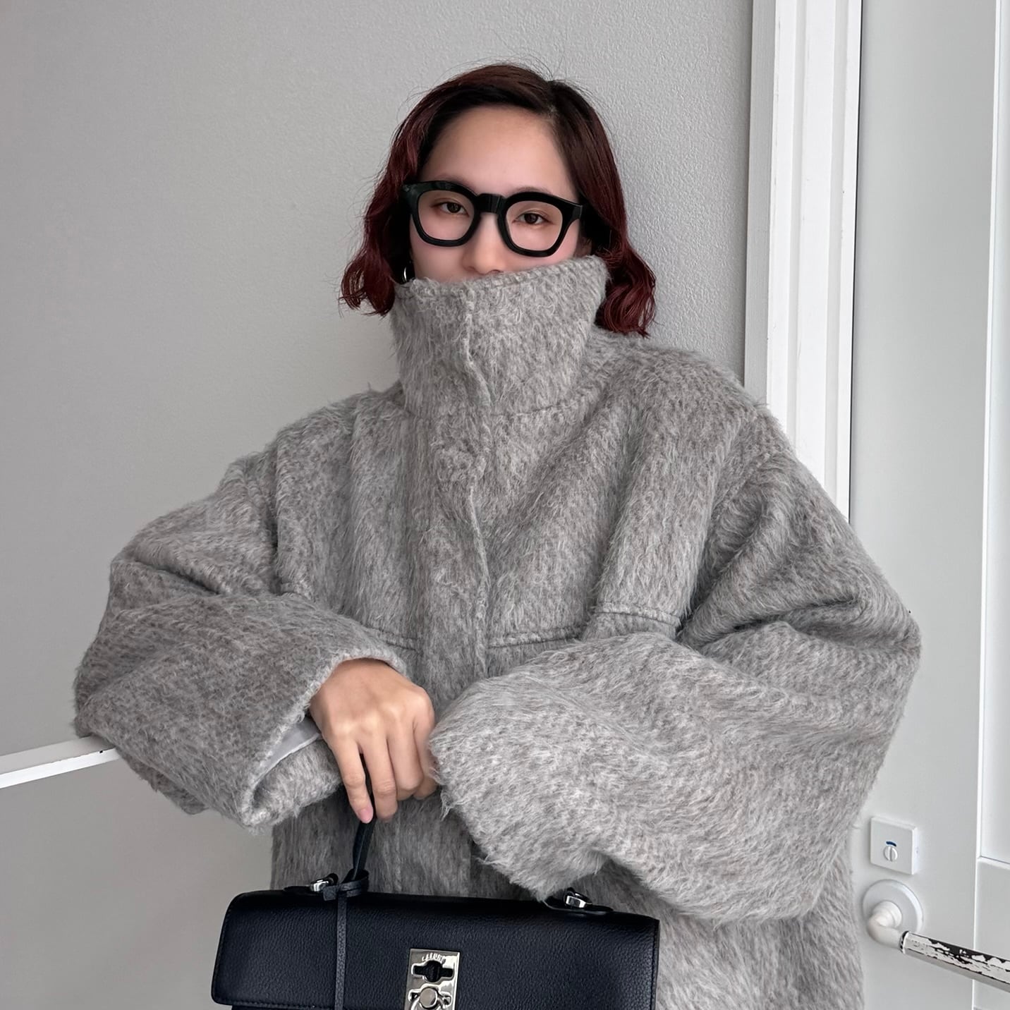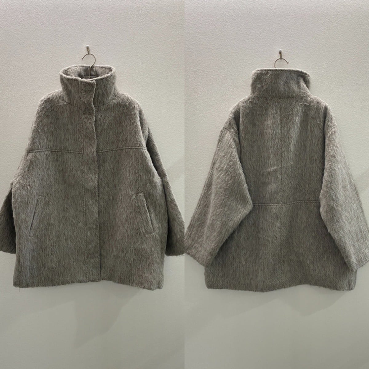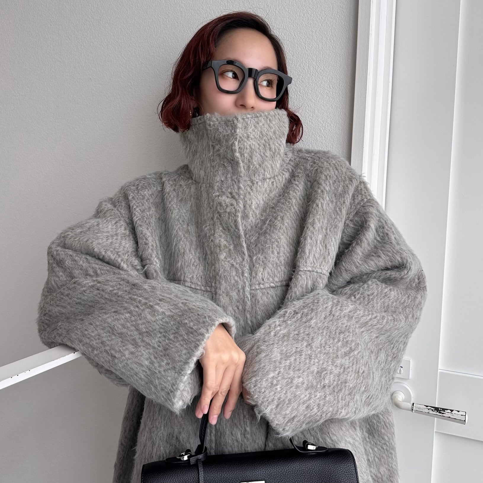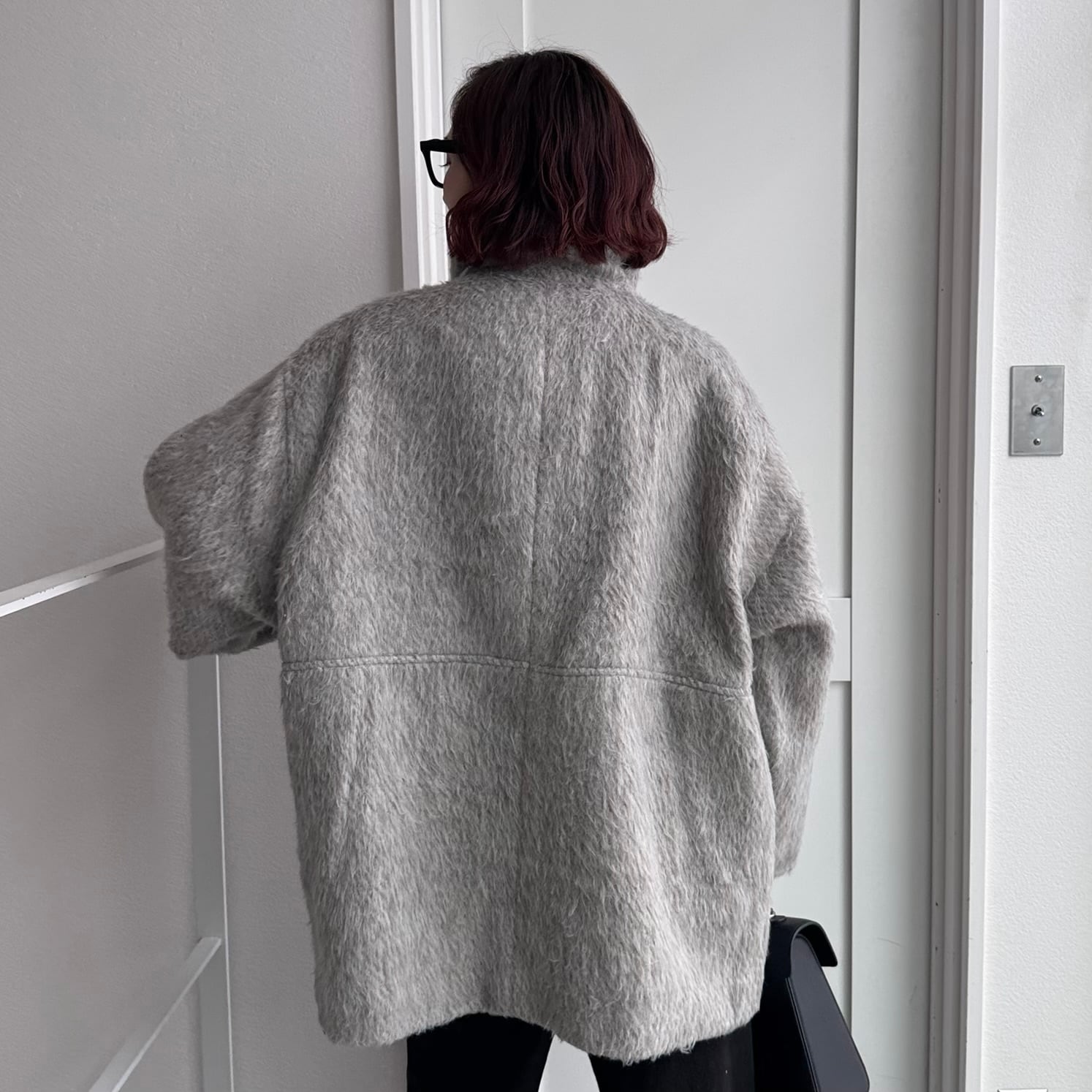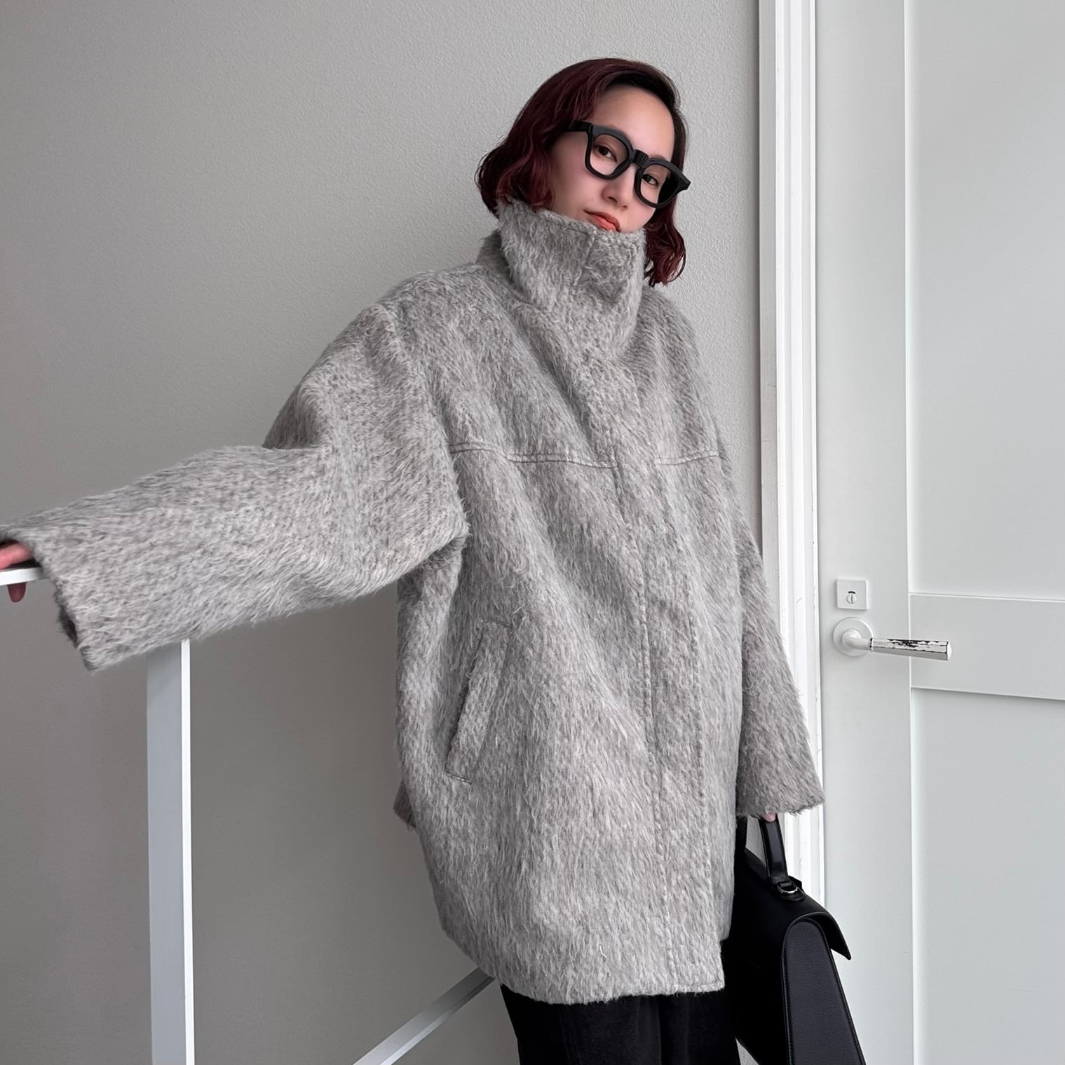毛足の長いエアリーな素材感が上品なスタンドカラーミドルコート。ゆったりしたオーバーシルエットなので、中にニットを着込んでもごわつくことなく着ていただけます。スタンドカラーとして着用すればマニッシュでシックな印象に。防寒にもオススメです。スナップ釦仕様は、簡単に開閉がしやすく、表からは見えないのでスッキリとした印象で着用いただけます。パンツやスカートどちらにも合わせやすいミドル丈で、ヒップまで隠れる丈感が嬉しいポイント。