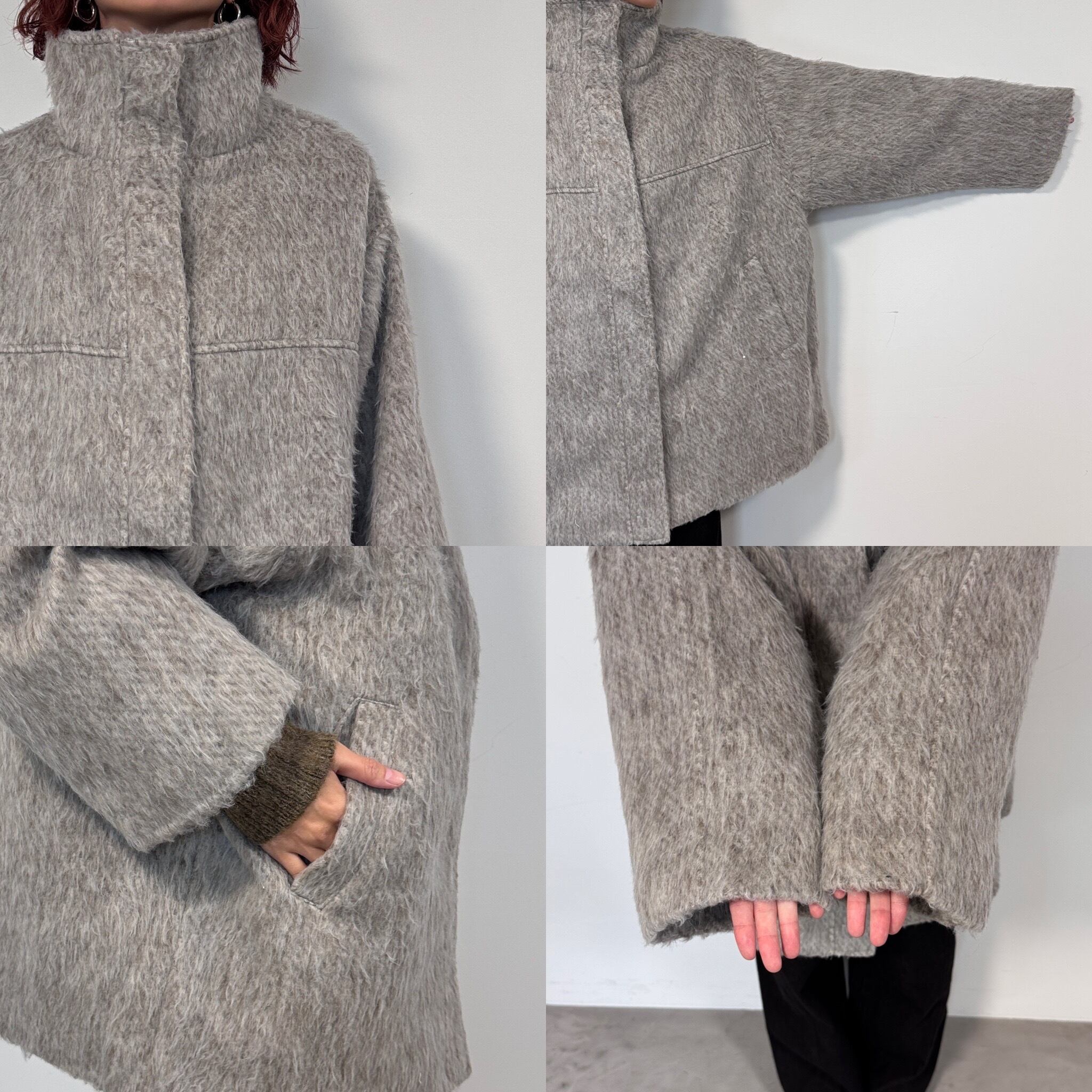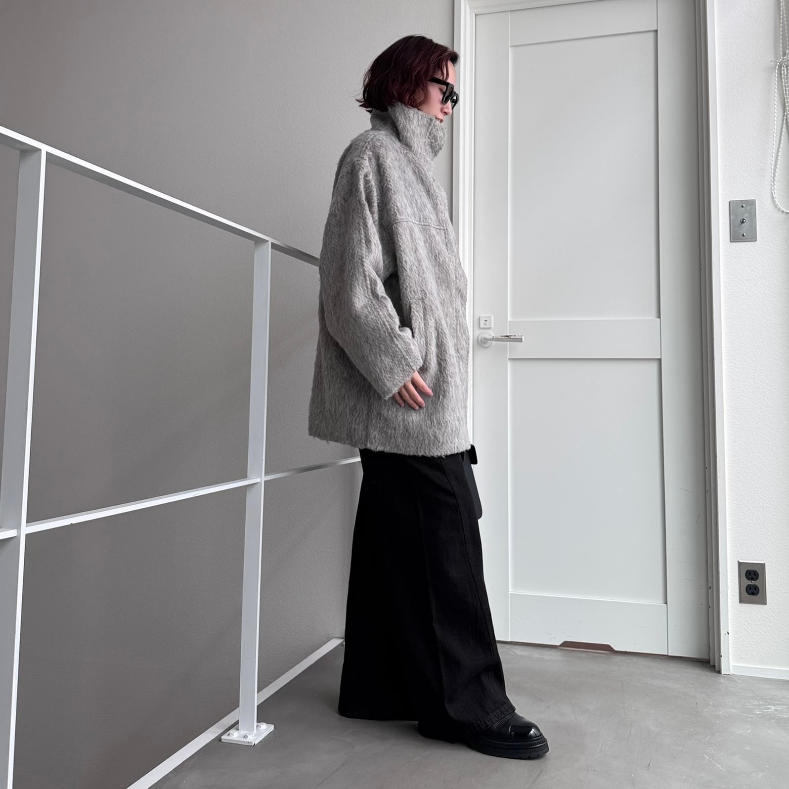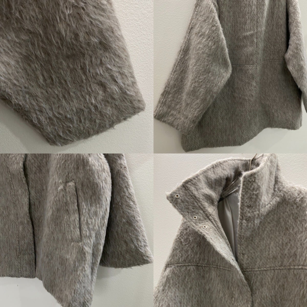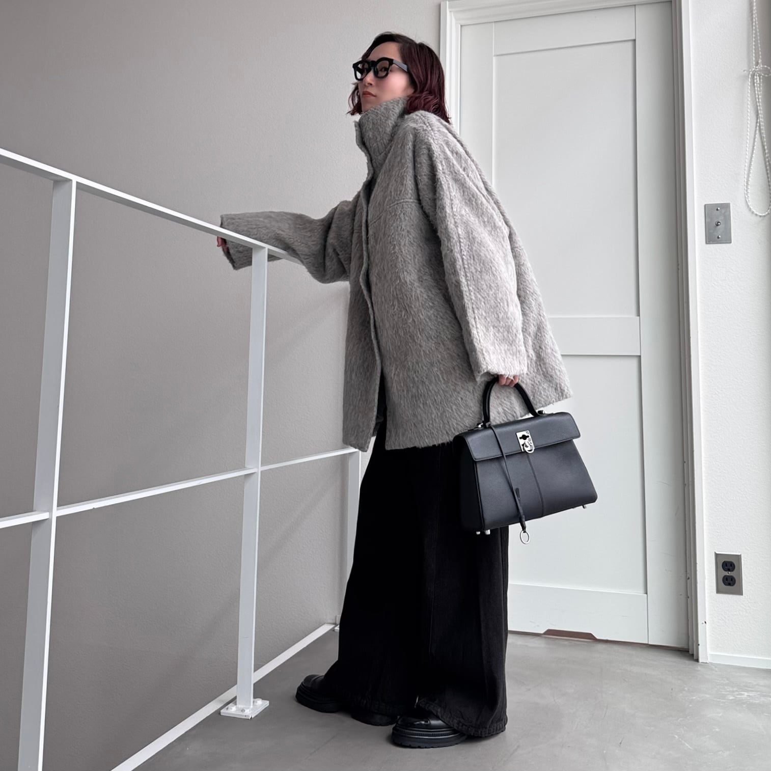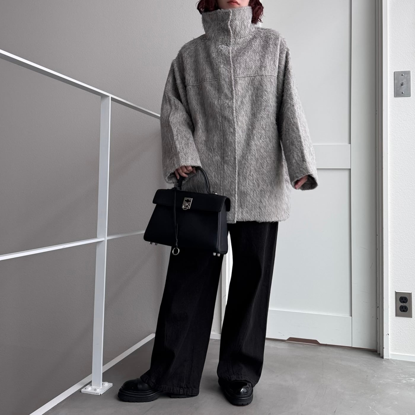 毛足の長いエアリーな素材感が上品なスタンドカラーミドルコート。ゆったりしたオーバーシルエットなので、中にニットを着込んでもごわつくことなく着ていただけます。スタンドカラーとして着用すればマニッシュでシックな印象に。防寒にもオススメです。スナップ釦仕様は、簡単に開閉がしやすく、表からは見えないのでスッキリとした印象で着用いただけます。パンツやスカートどちらにも合わせやすいミドル丈で、ヒップまで隠れる丈感が嬉しいポイント。