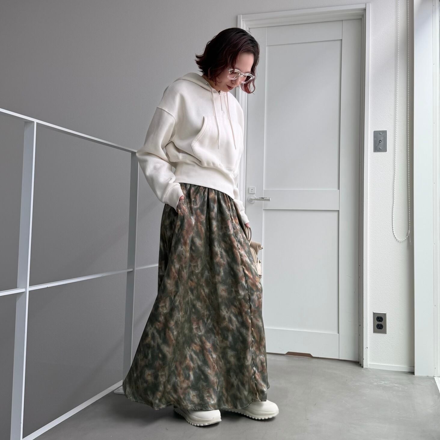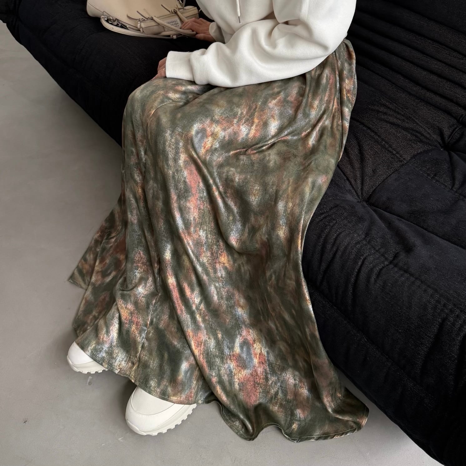 目を惹くアート柄がコーデの主役になるAラインスカート。総柄のデザインですがメタリック生地なのでモードな雰囲気も兼ね備えています。また生地をたっぷり使用しているのでよりふんわりとした動きのあるデザインに。ウエストもゴム仕立てなのでリラクシーな着心地です。