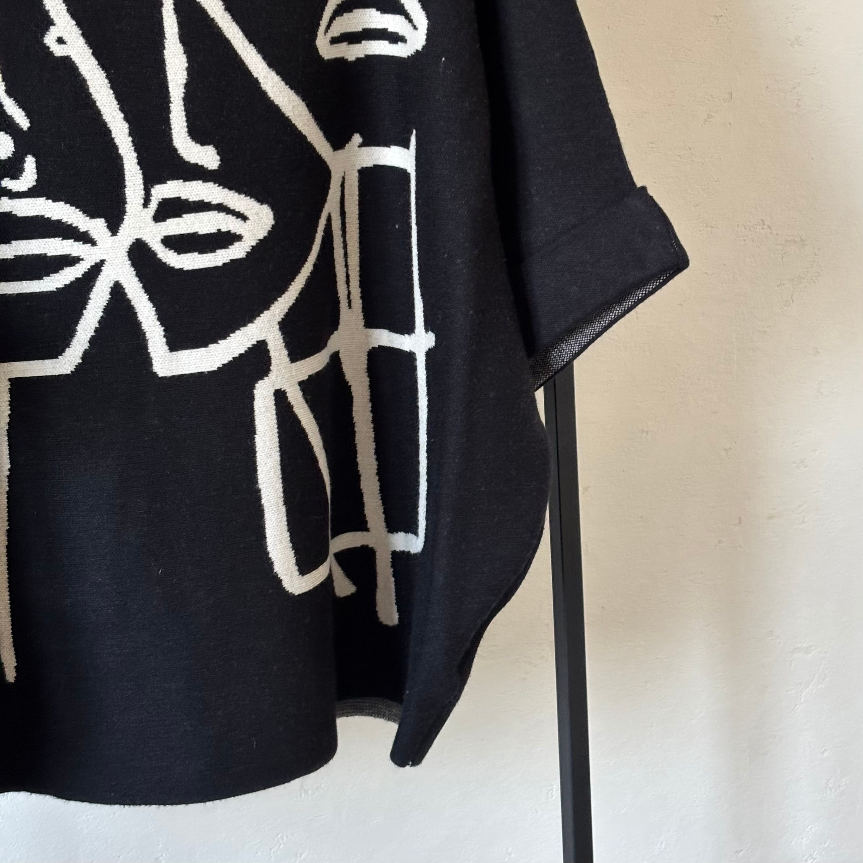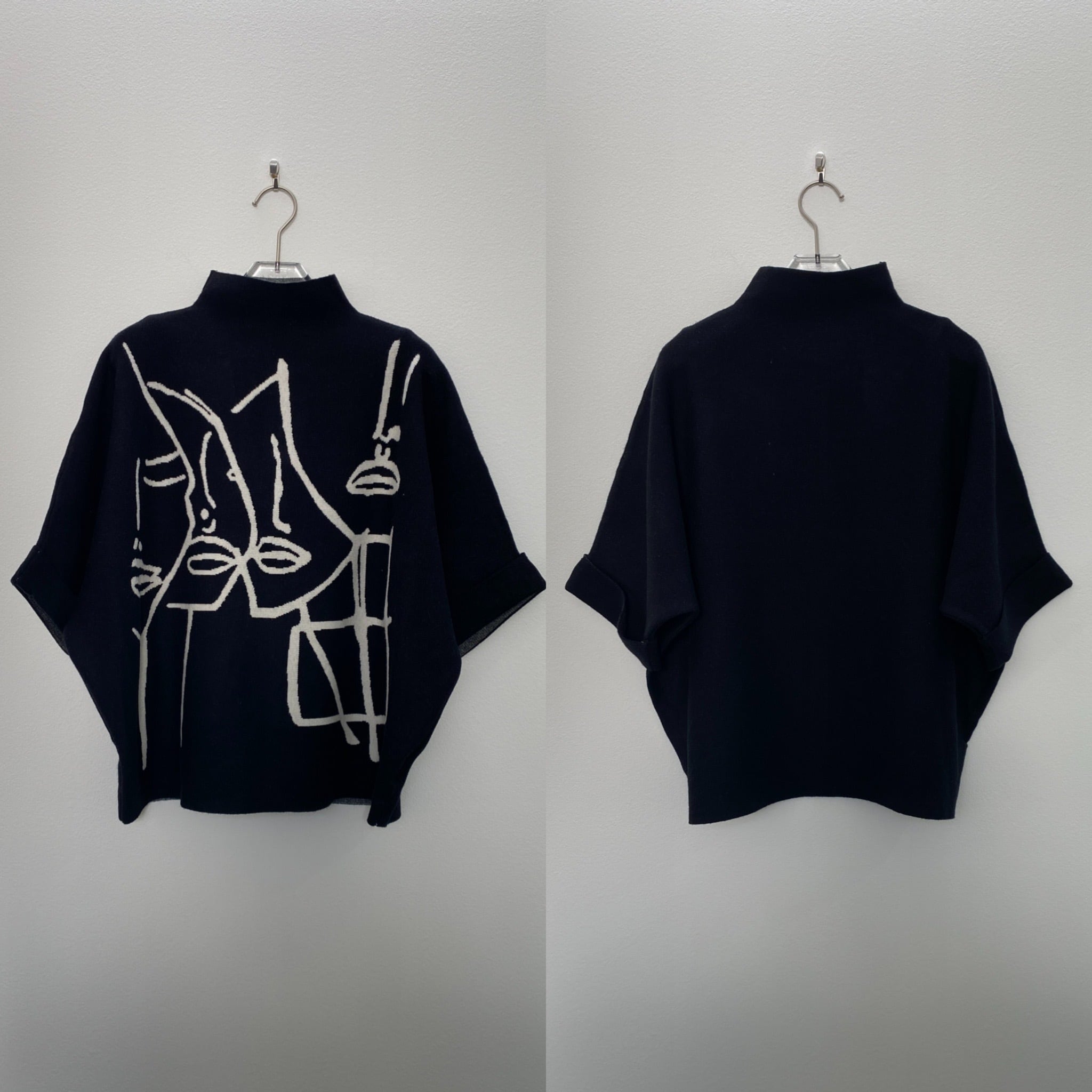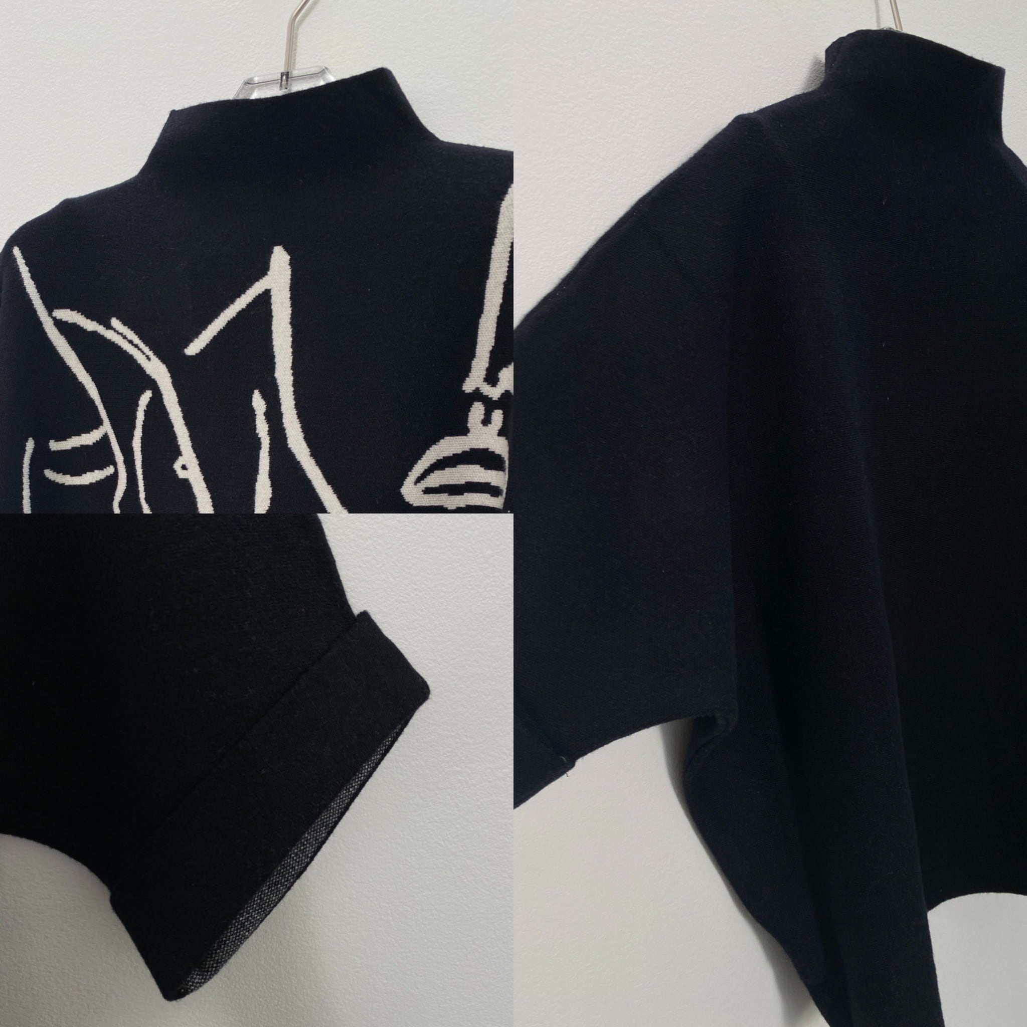 インパクトのあるアートデザインがコーデのポイントになるドルマンニット。ボンディングニットのようなもっちりとした着心地です。ハイネックもきれいに首に沿ってくれるデザインなので苦しくなく小顔効果も。肱が隠れる5部丈ニットは1枚ではもちろんタイトなニットやシアートップスをインしたコーデもおススメです。