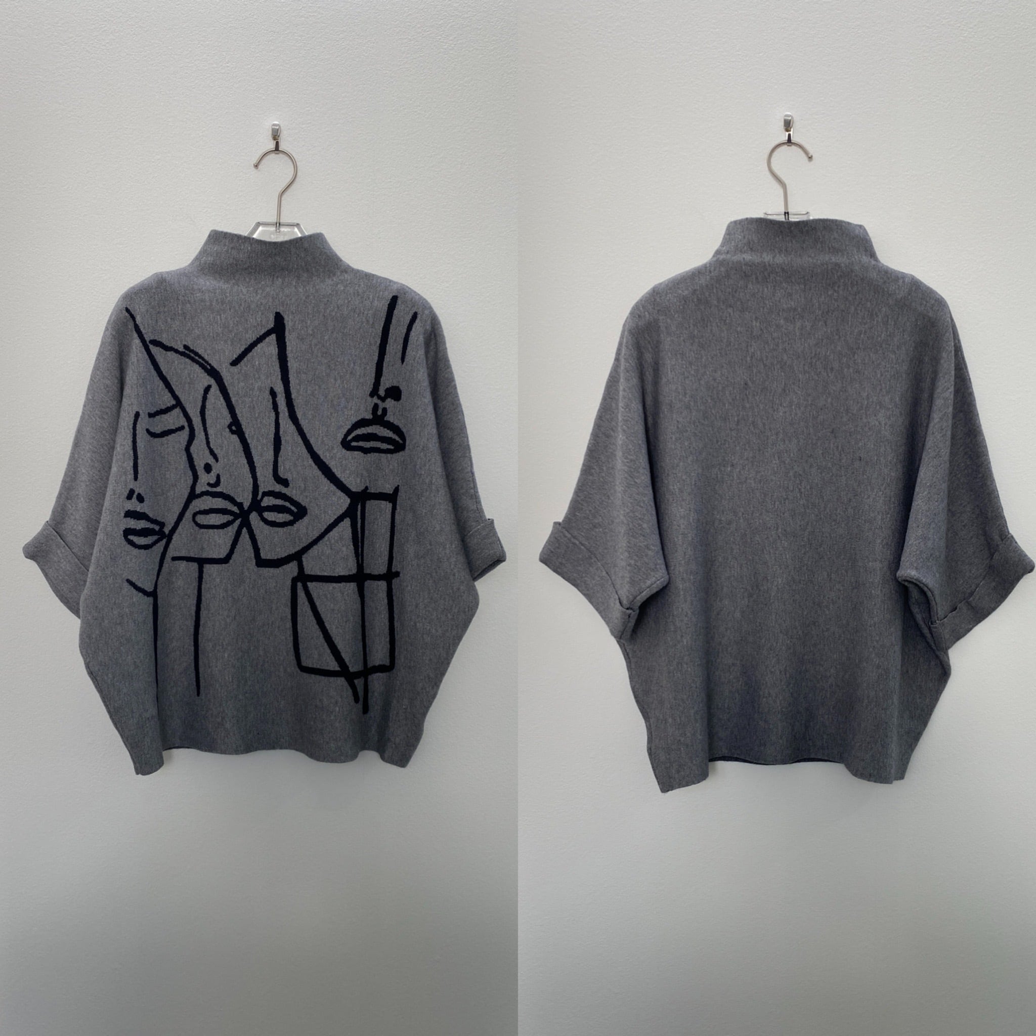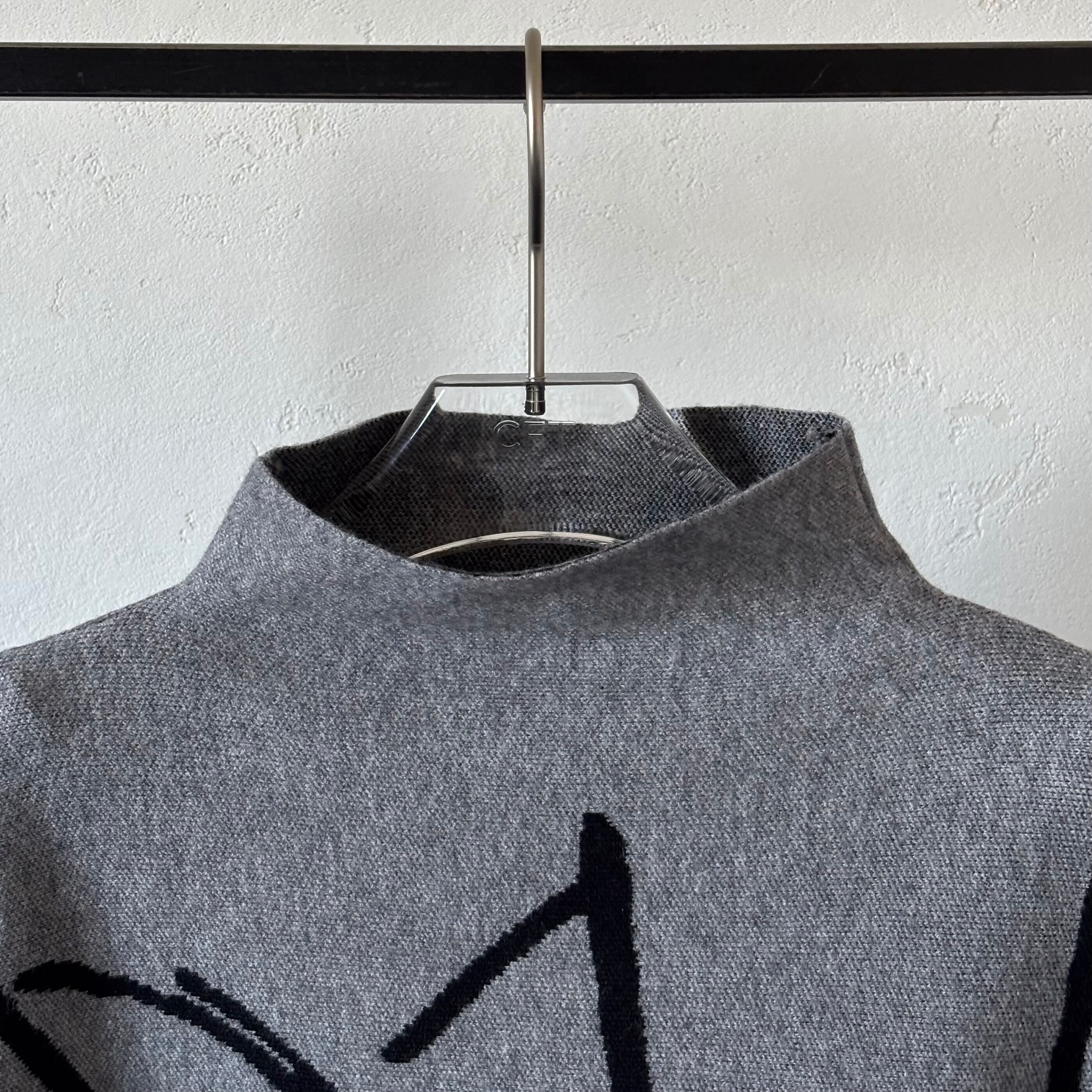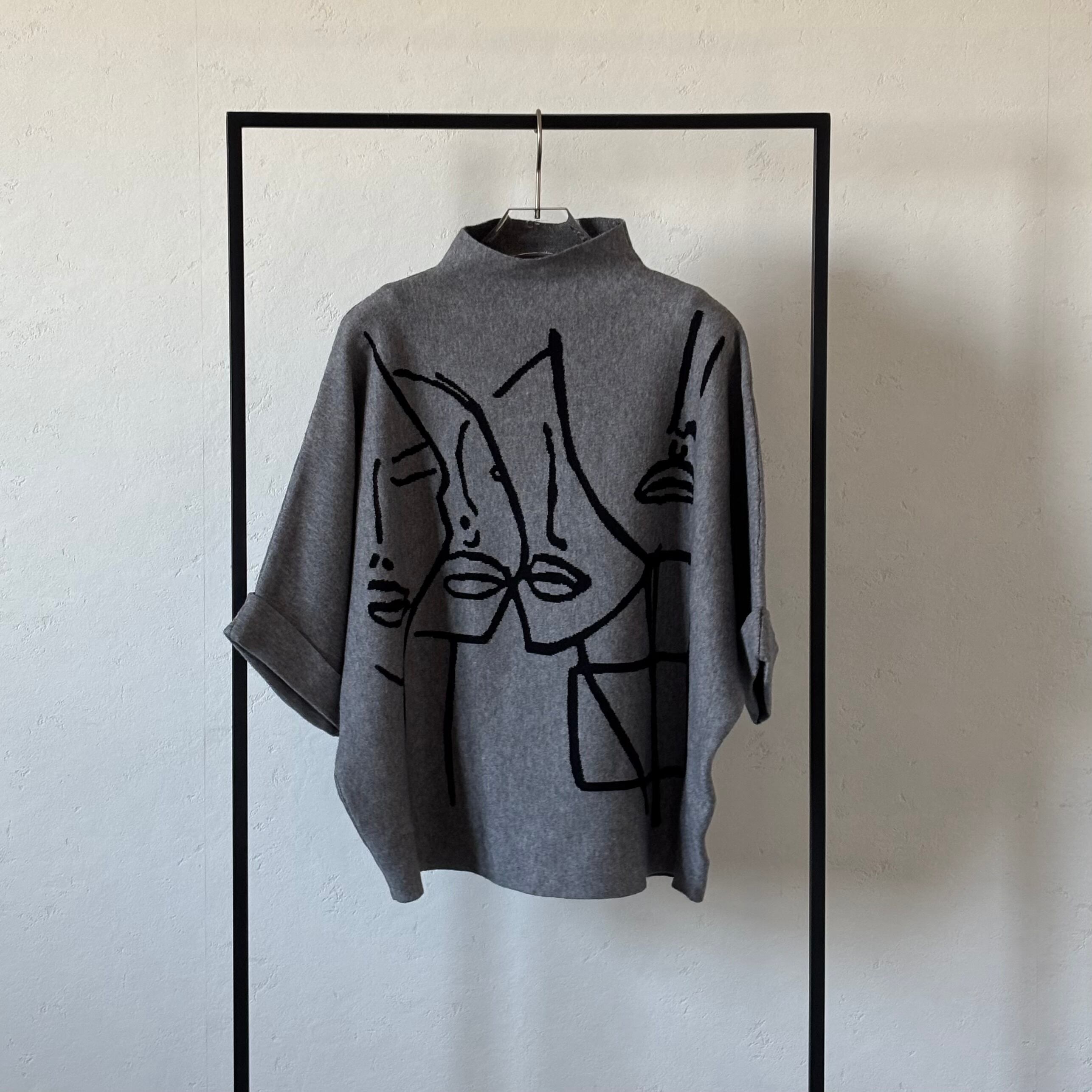 インパクトのあるアートデザインがコーデのポイントになるドルマンニット。ボンディングニットのようなもっちりとした着心地です。ハイネックもきれいに首に沿ってくれるデザインなので苦しくなく小顔効果も。肱が隠れる5部丈ニットは1枚ではもちろんタイトなニットやシアートップスをインしたコーデもおススメです。