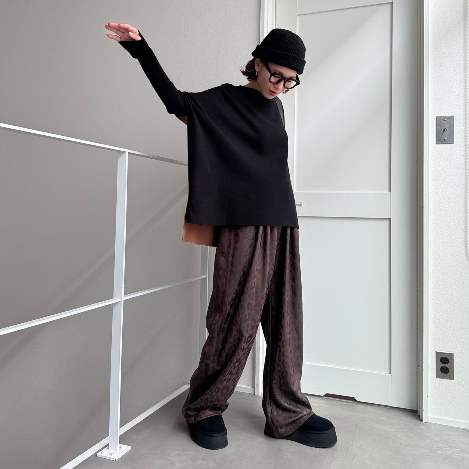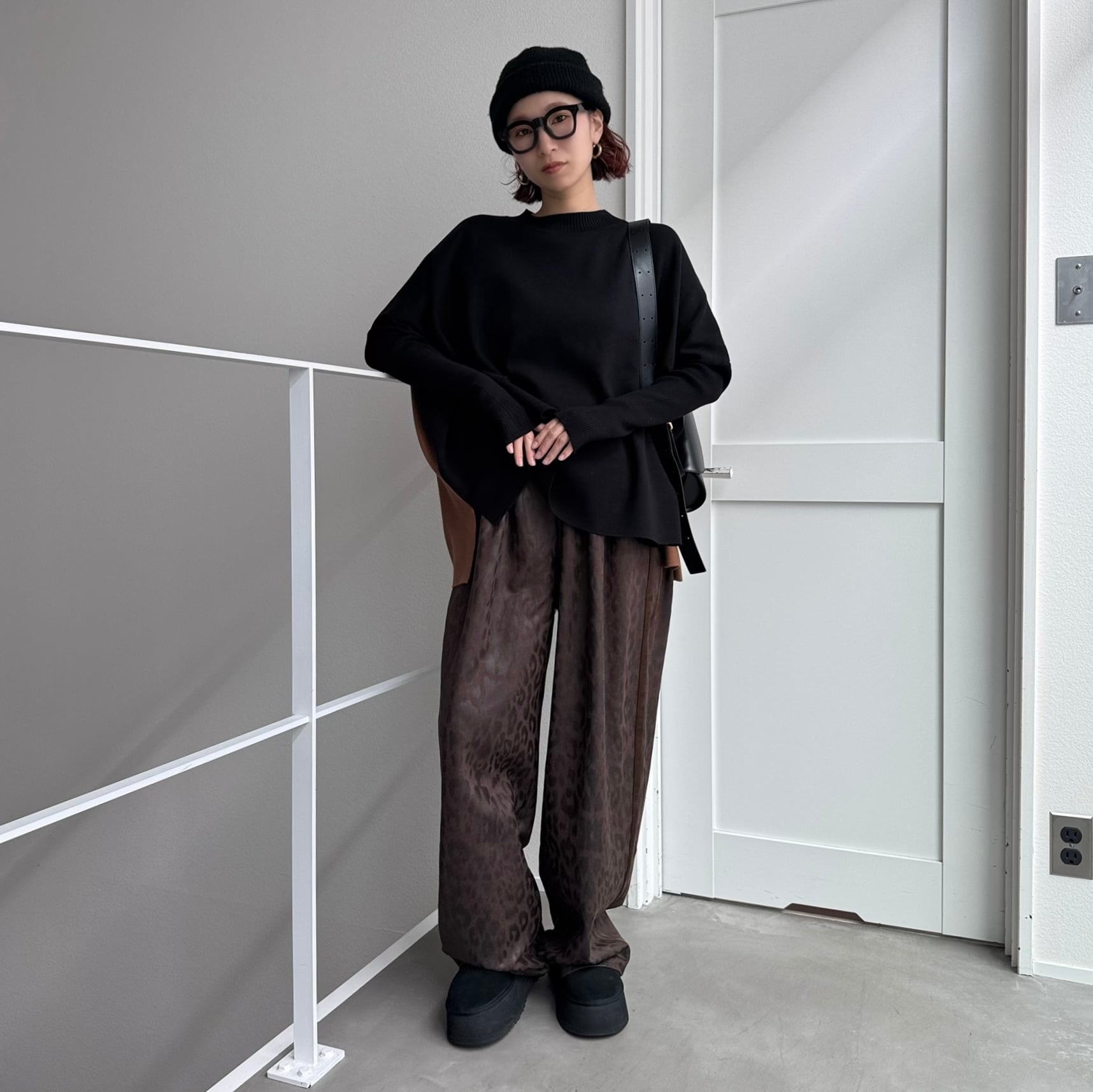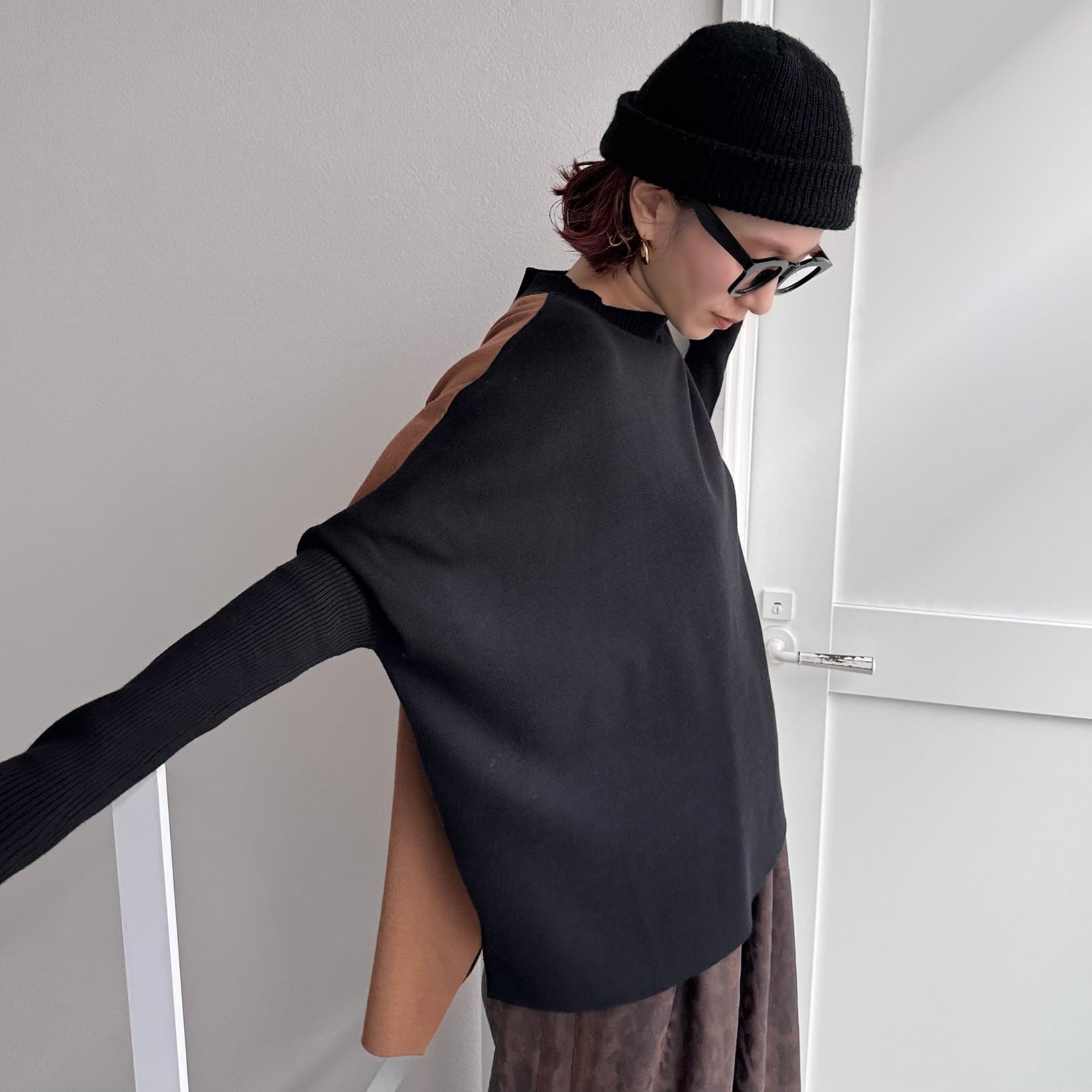 バイカラーのドルマンニットプルオーバー。大人なカラーリングが魅力の一着となっております。リラックス感のあるシルエットでありながら、カフス部分はきゅっと細くなっているデザイン性の高いアイテムです。前後差のあるドルマンフォルムも特徴で、一枚でオシャレに決まります。着丈は程良く長めなので体型カバーも◎