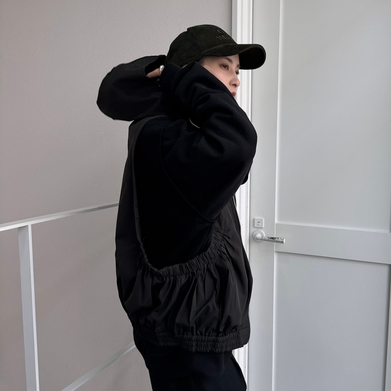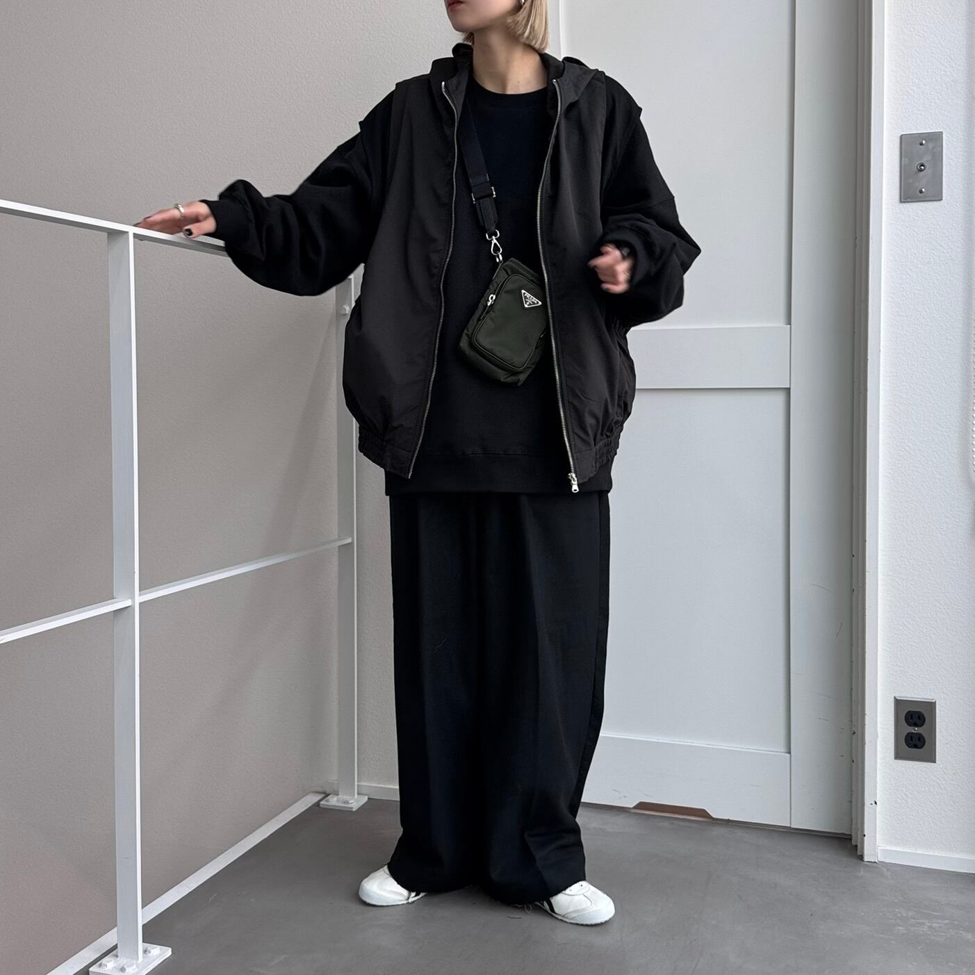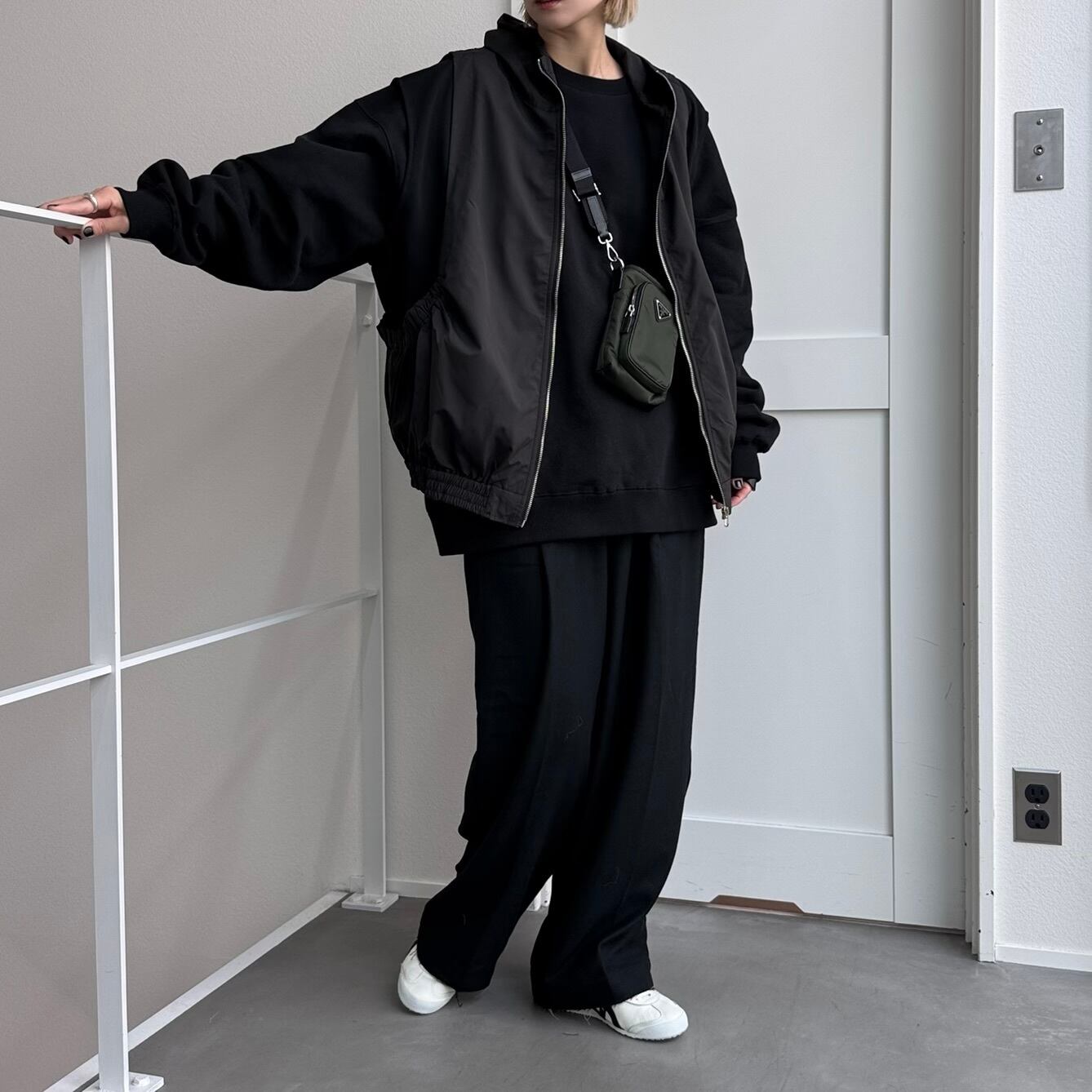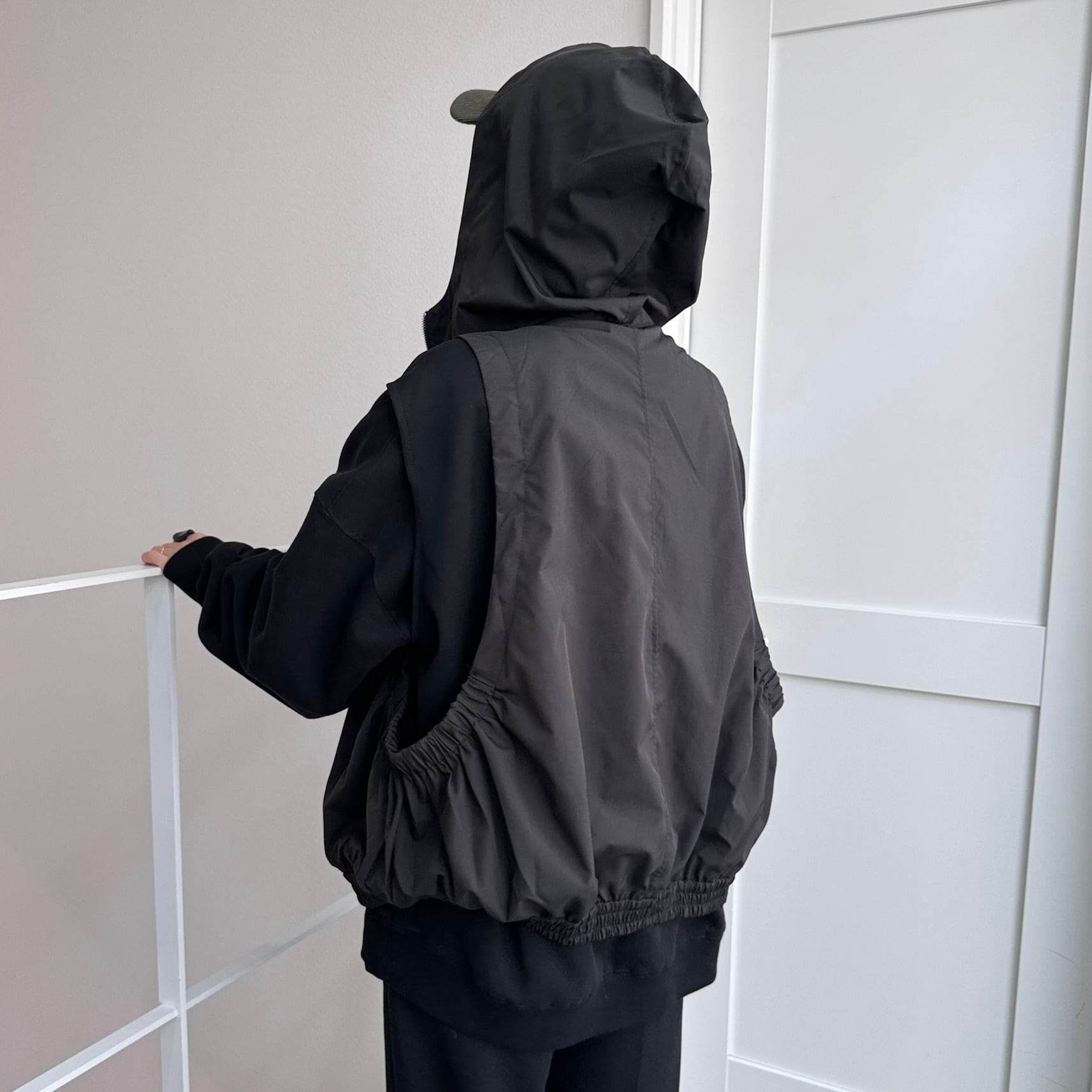 ナイロンベストにスウェット生地がドッキングされたフード付き異素材ベスト。着丈が長いデザインで、腰回りもしっかりカバーしつつ、裾ゴムをお好きな位置で調整してコンパクトにもご着用いただけます。今の季節からロングシーズン着用できる素材感。立体感のあるフード付きで、メンズライクはもちろん、アームホールにギャザーが施されているのでスカートとの合わせも◎タートルニット等ともレイヤードしやすいアイテムです。