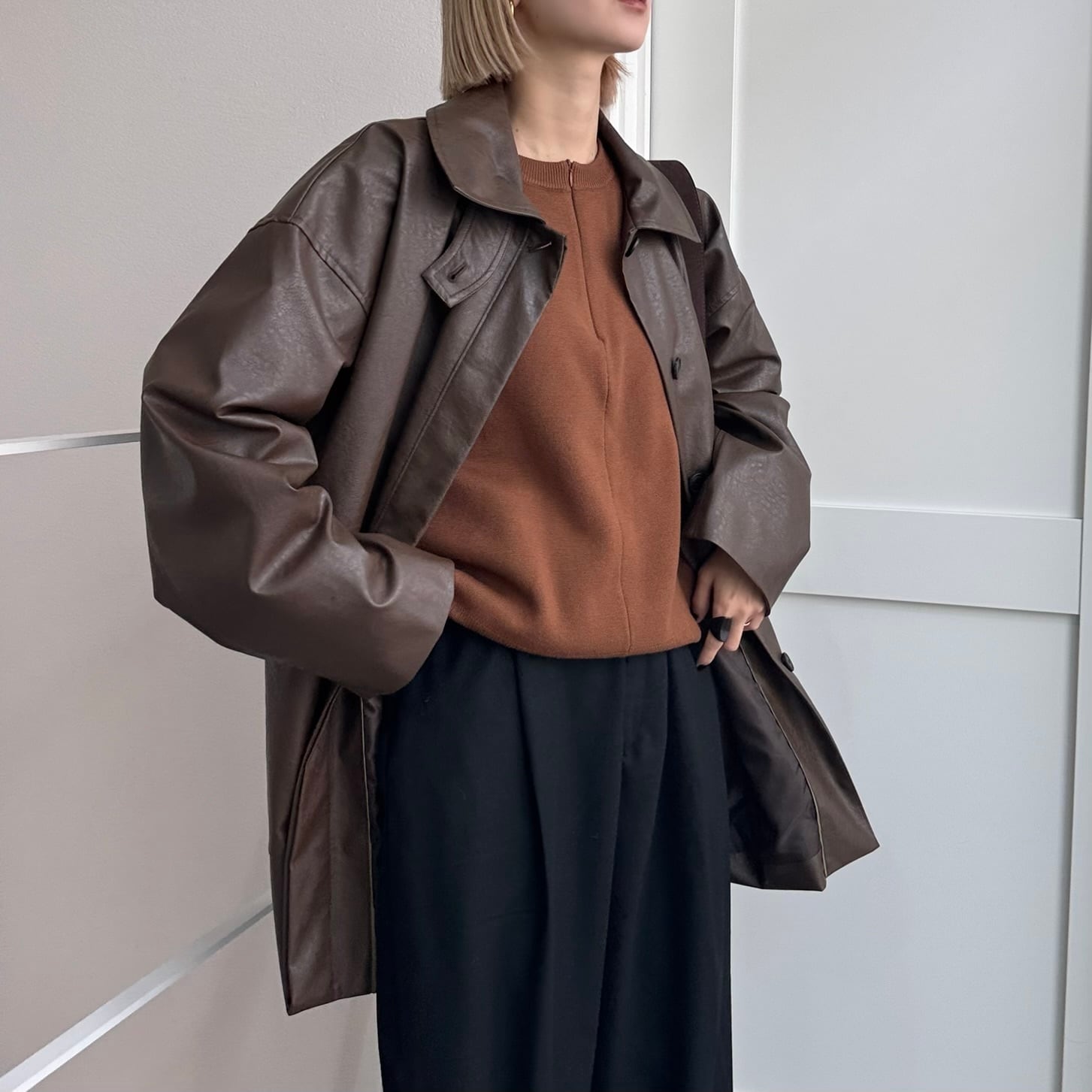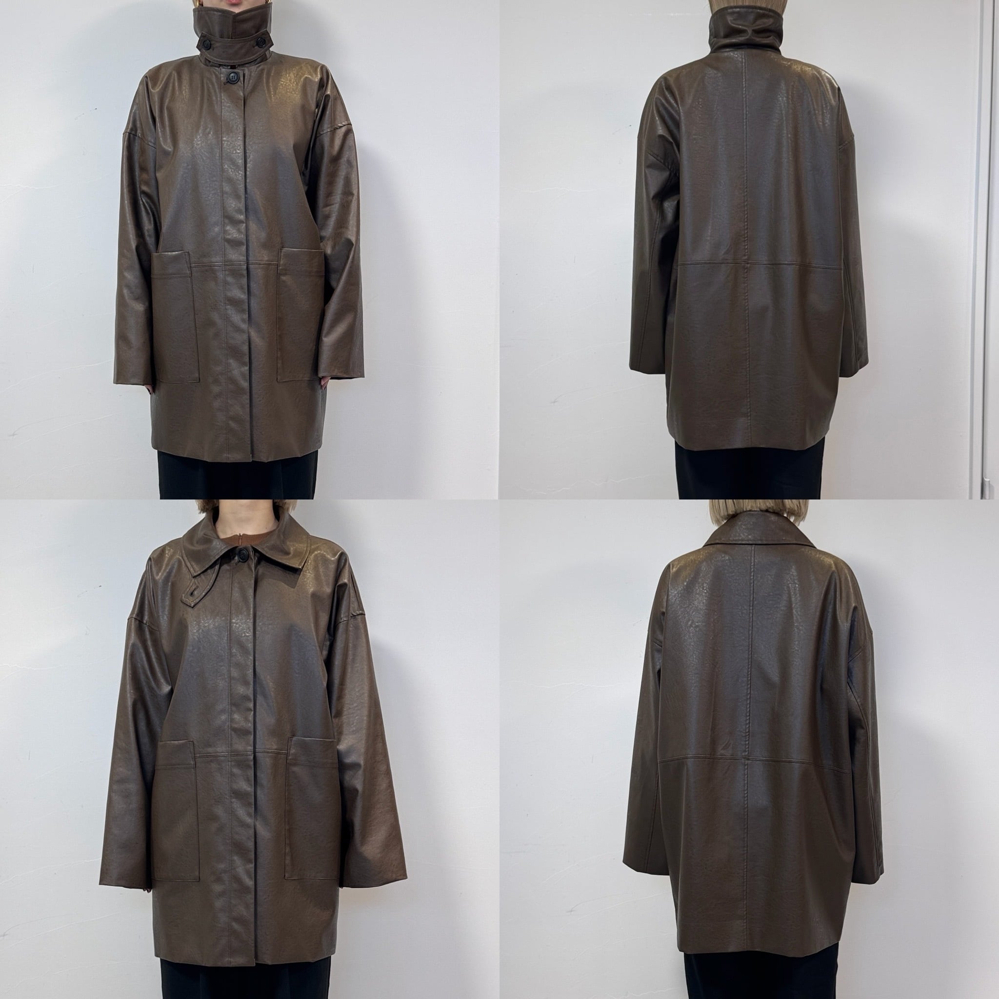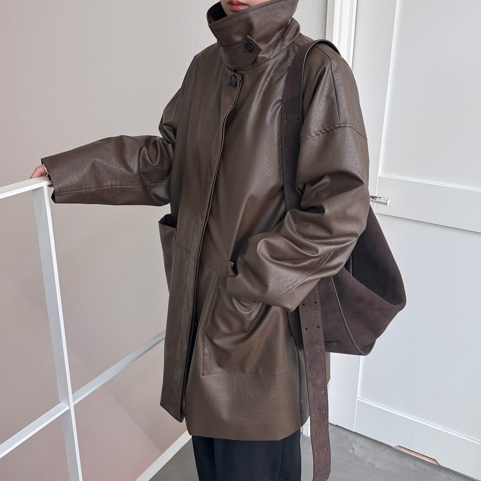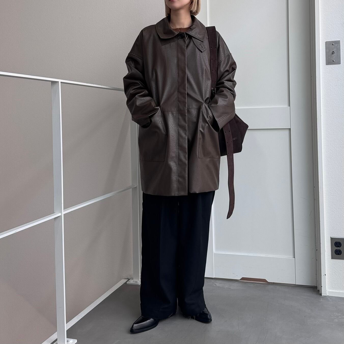 オーバーサイズシルエットでヴィンテージライクな雰囲気が楽しめるフェイクレザーコート。長めにデザインされたミドル丈で、気になる腰回りもカバー◎パンツスタイルはもちろん、ワンピースやスカートに合わせてもコーディネートを引き締めてくれます。フロントの大きめのポケットもポイントで、襟はステンカラー・スタンドカラーの2way仕様。長時間着用しても気にならないライトアウターとしてデイリーに取り入れやすく、ロングシーズン着用できる万能アイテムです。