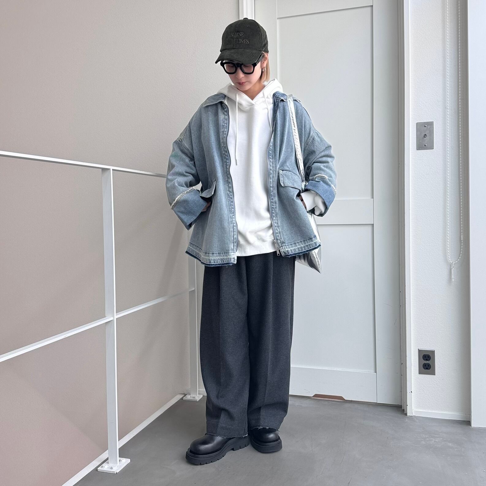 裾のフリンジツイルがポイントのデニムオーバージャケット。広めの袖口はお好みでロールアップして調整するデザインで、綿100%のやわらかな肌触りながらユーズド加工を含むヴィンテージ感を楽しめるアイテム。Wジップ仕様で着こなしの幅も広がります。身幅たっぷりなので厚手のニットや、春先にはシアーアイテムとのレイヤードもおすすめ。デニム特有の重さは軽減されこれからの時期のライトアウターとして大活躍します。