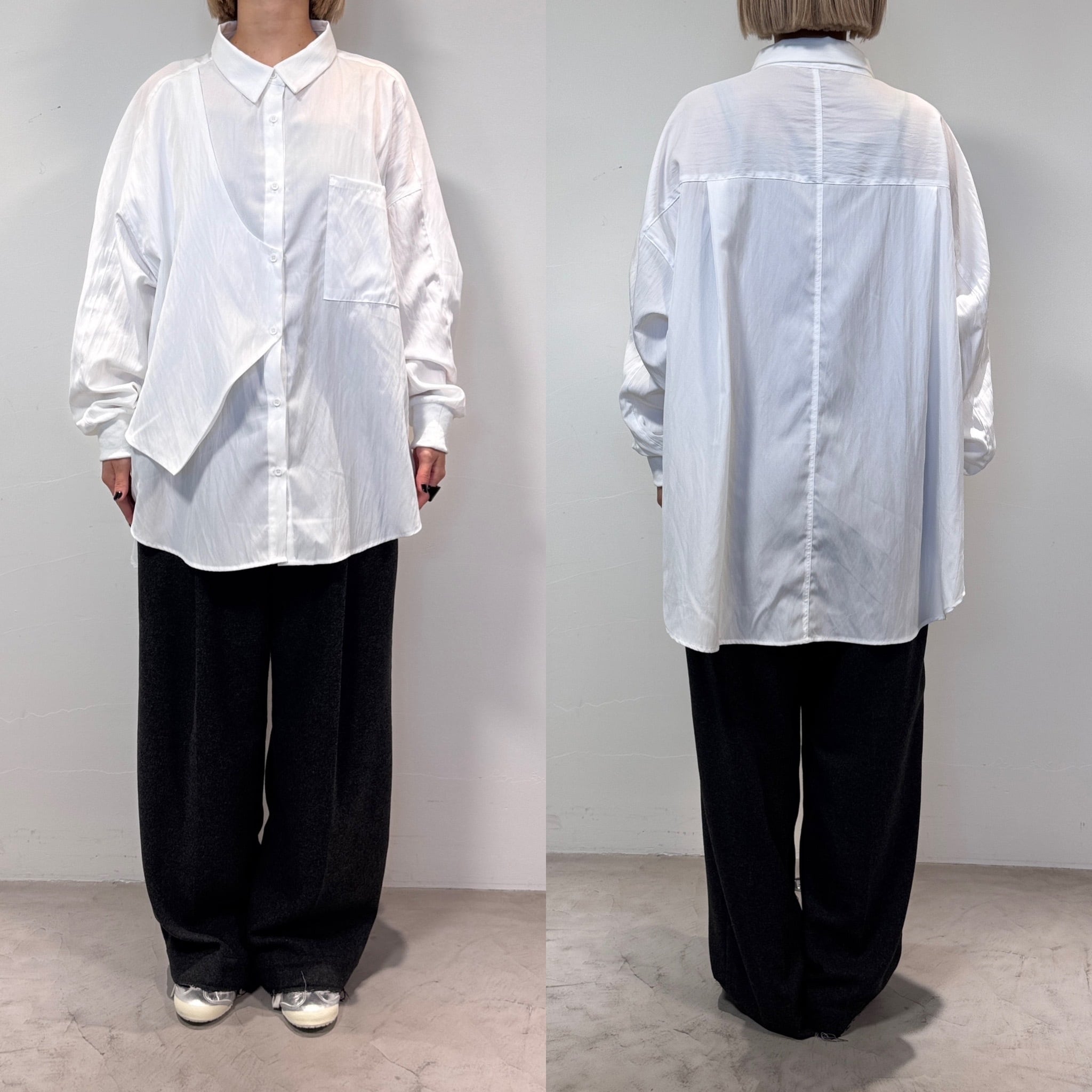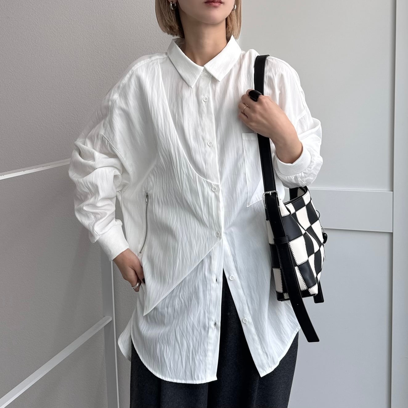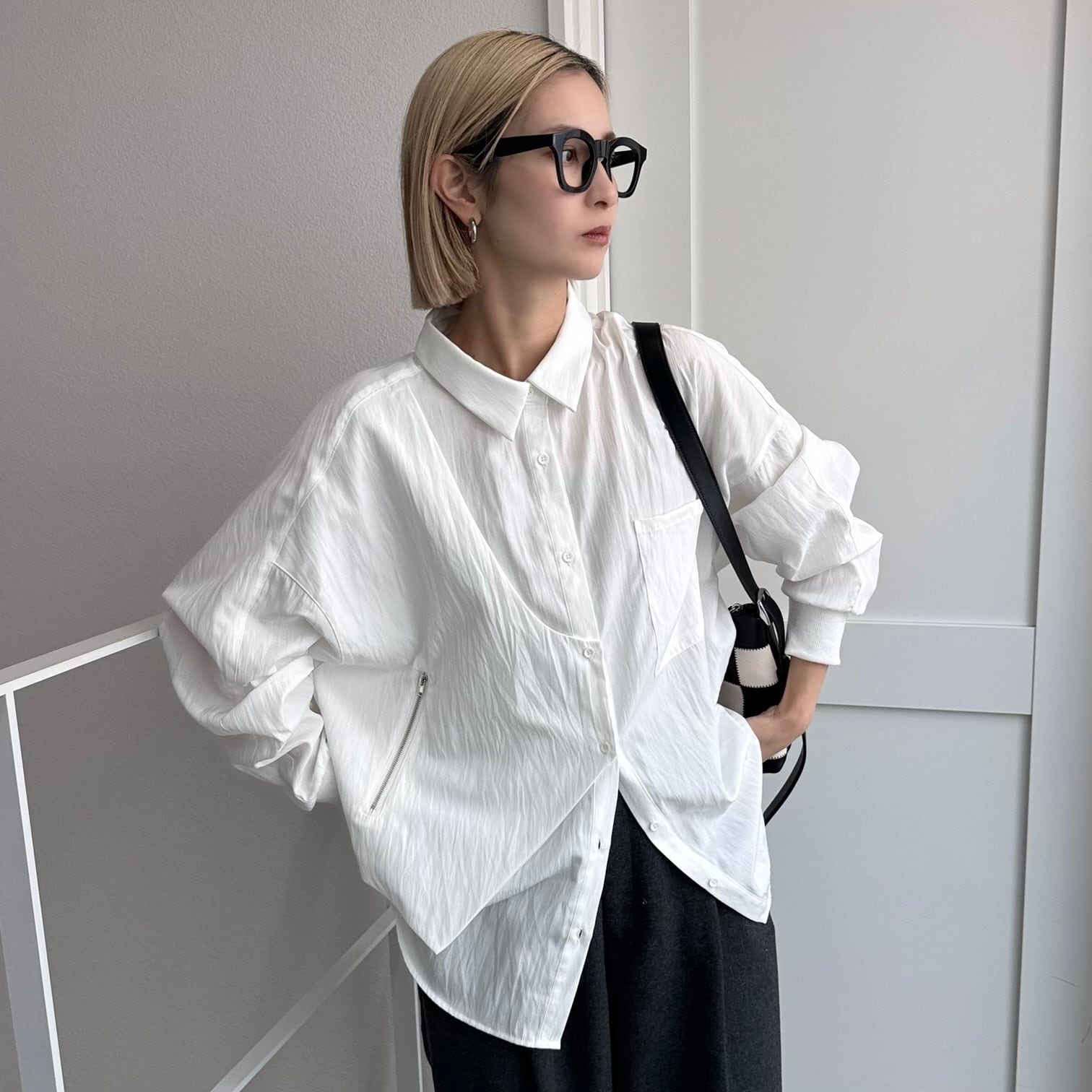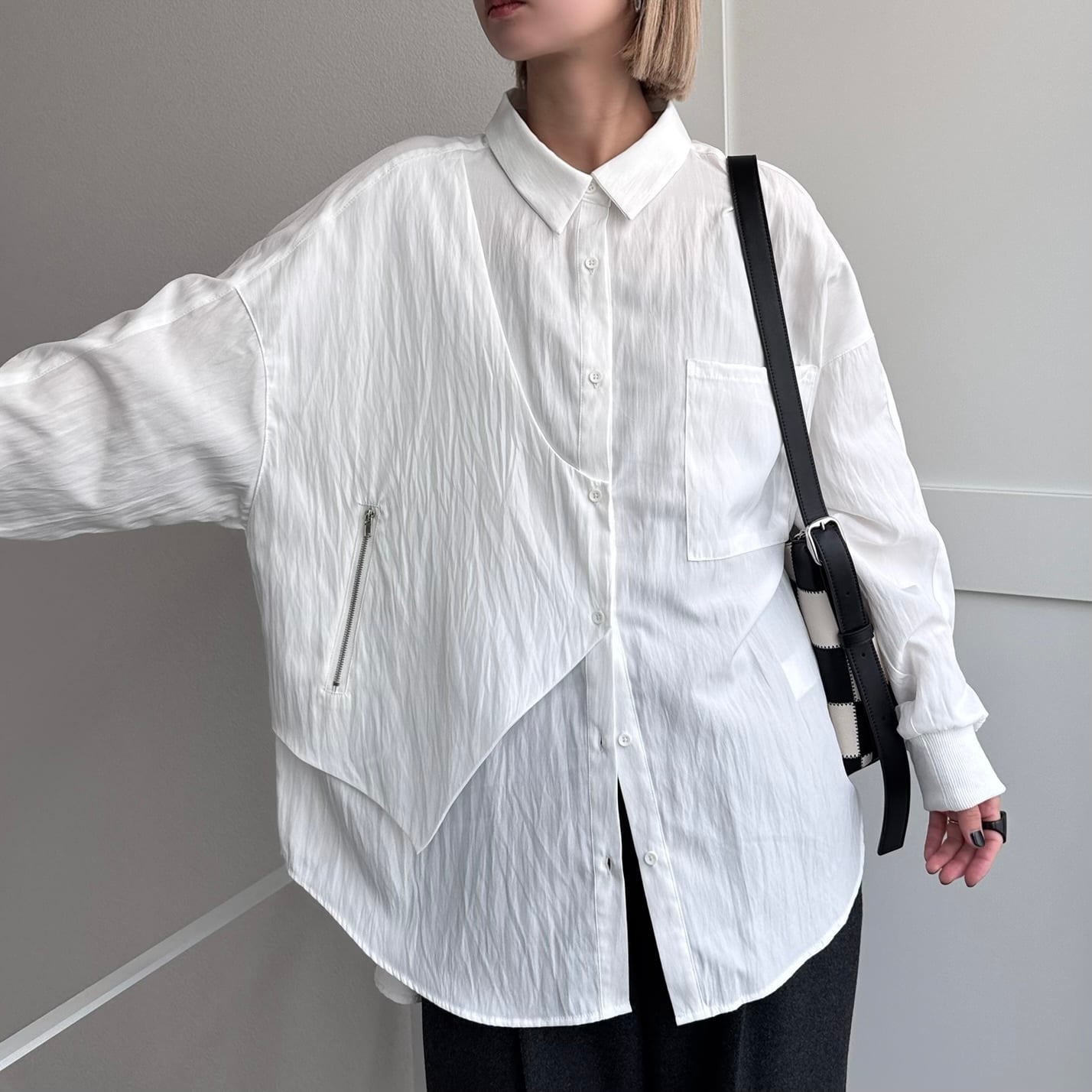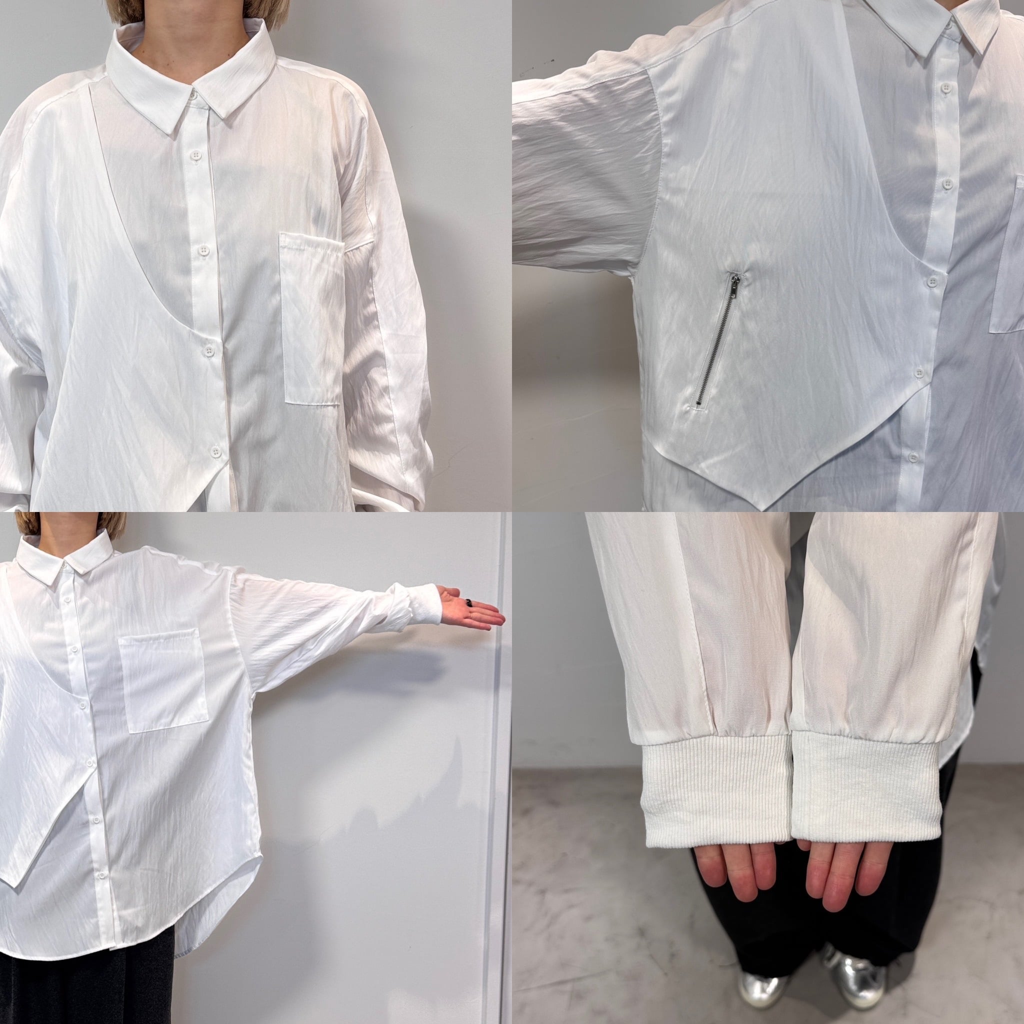 ジップ付きのベストのようなパネルがドッキングされたレイヤード風オーバーシャツ。ほんのり光沢感としわ加工が施されたようなテクスチャ。さらに袖リブ仕様で動きやすさをプラス。オーバーサイズでゆったりとしたシルエットでありながら、カジュアルモードな雰囲気を演出。ボトムは選ばないので、どんなコーディネートにも合わせやすいです。
