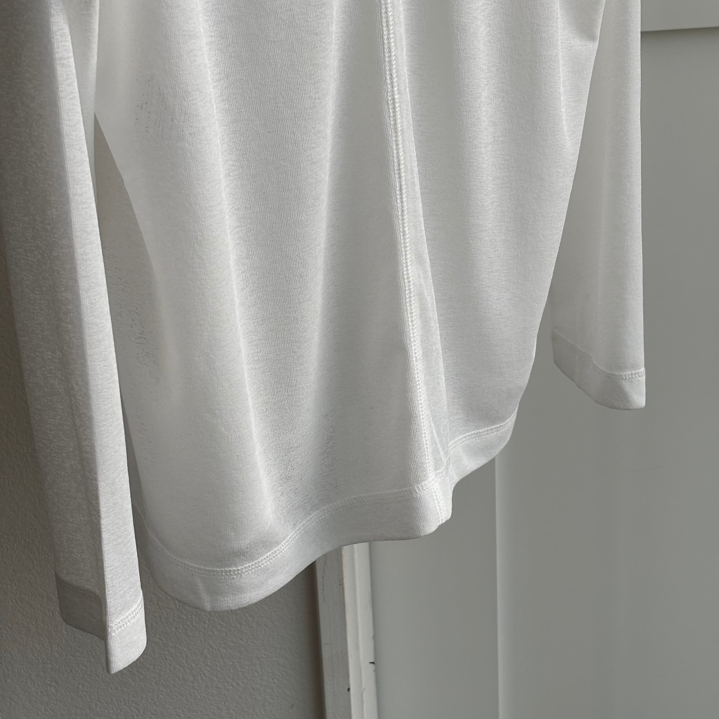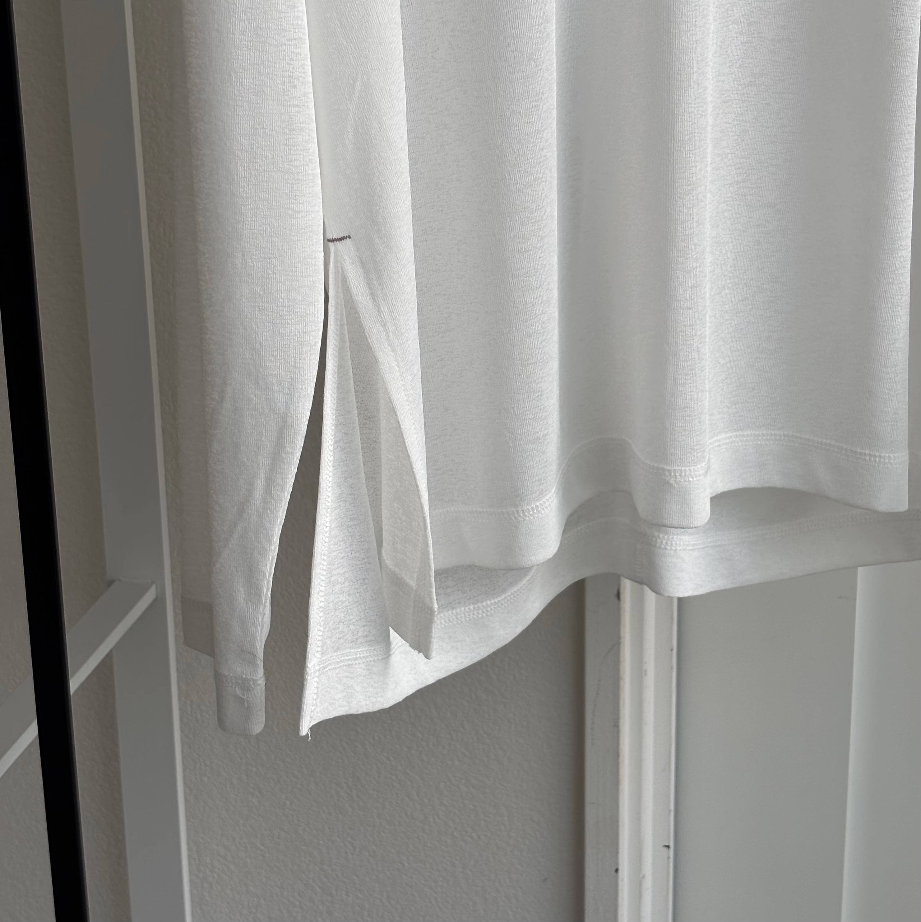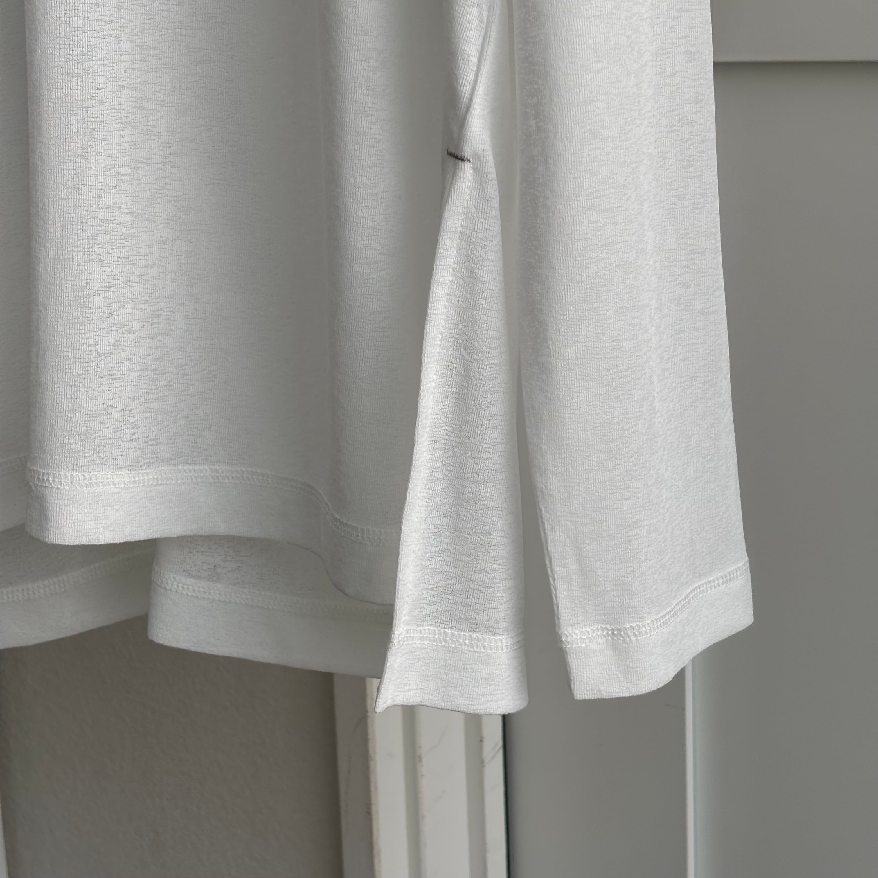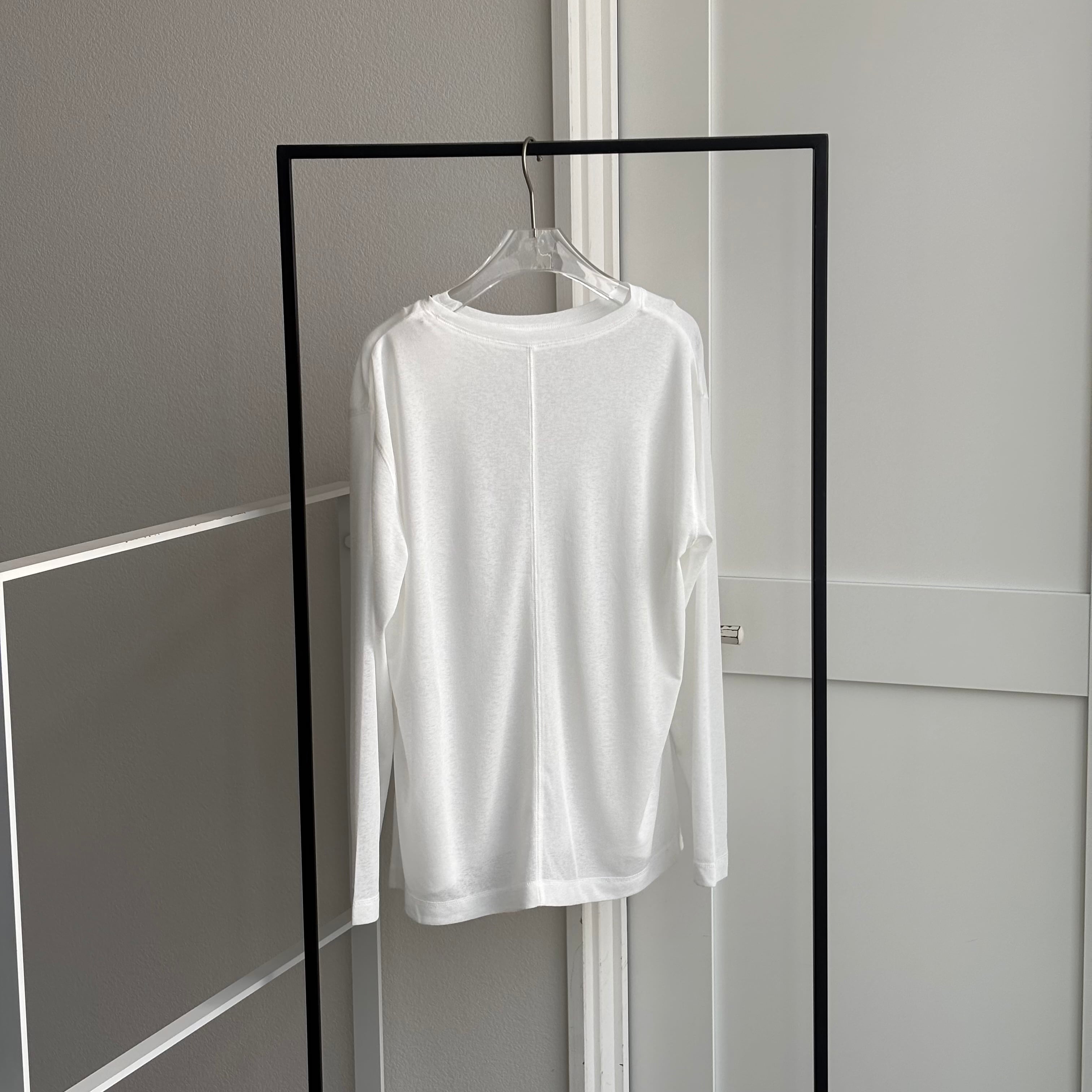 やわらかい肌触りのシアーカットソー。ゆとりのあるサイズ感でシンプルデザインでありながら深めのスリットが抜け感を感じさせ、リラクシーに着用いただけます。ロゴTにレイヤードしたり、スウェットの袖口から見せても◎タックインもしやすい素材なのでビスチェとの相性も抜群。トレンド感もあり、ロングシーズン着用できるアイテムです。