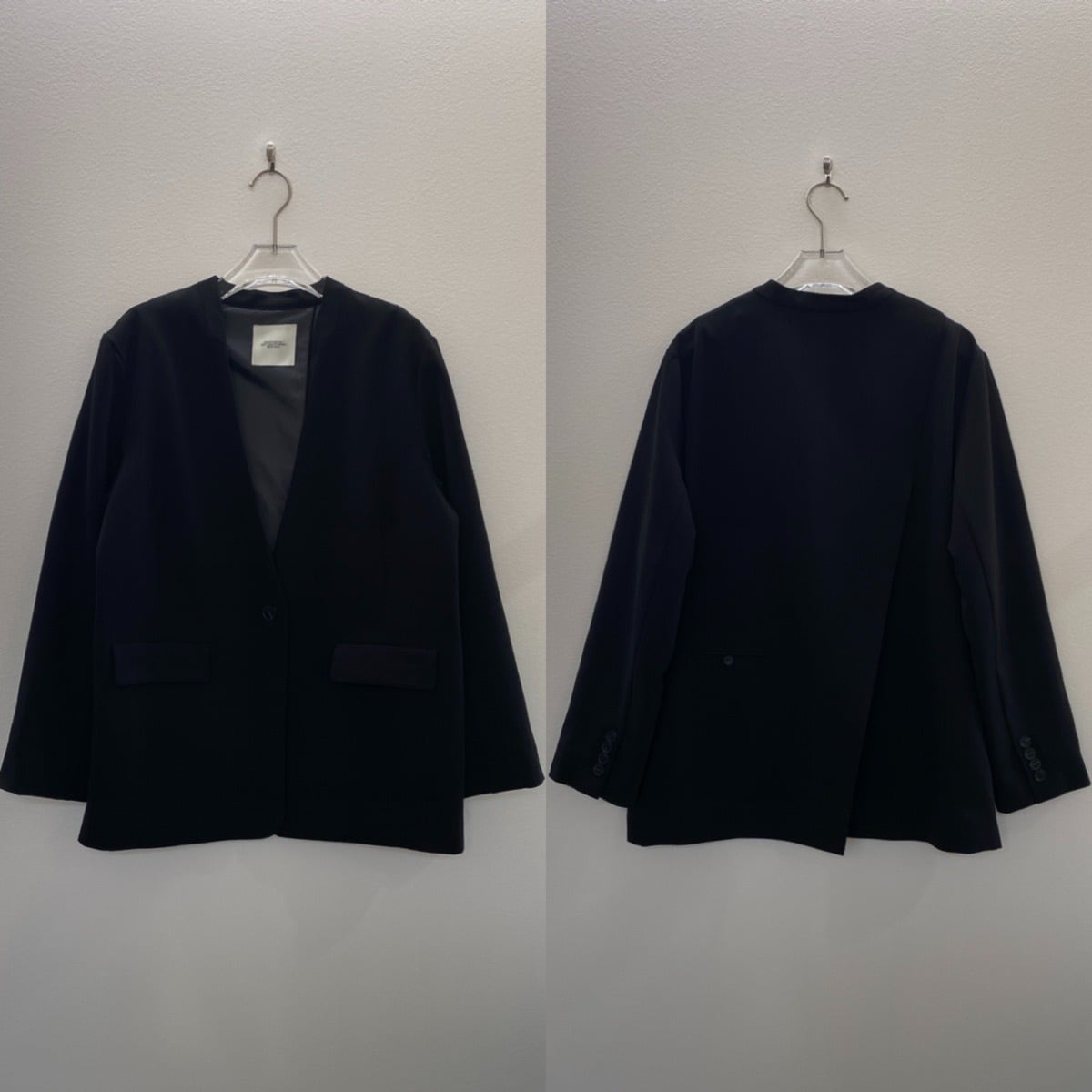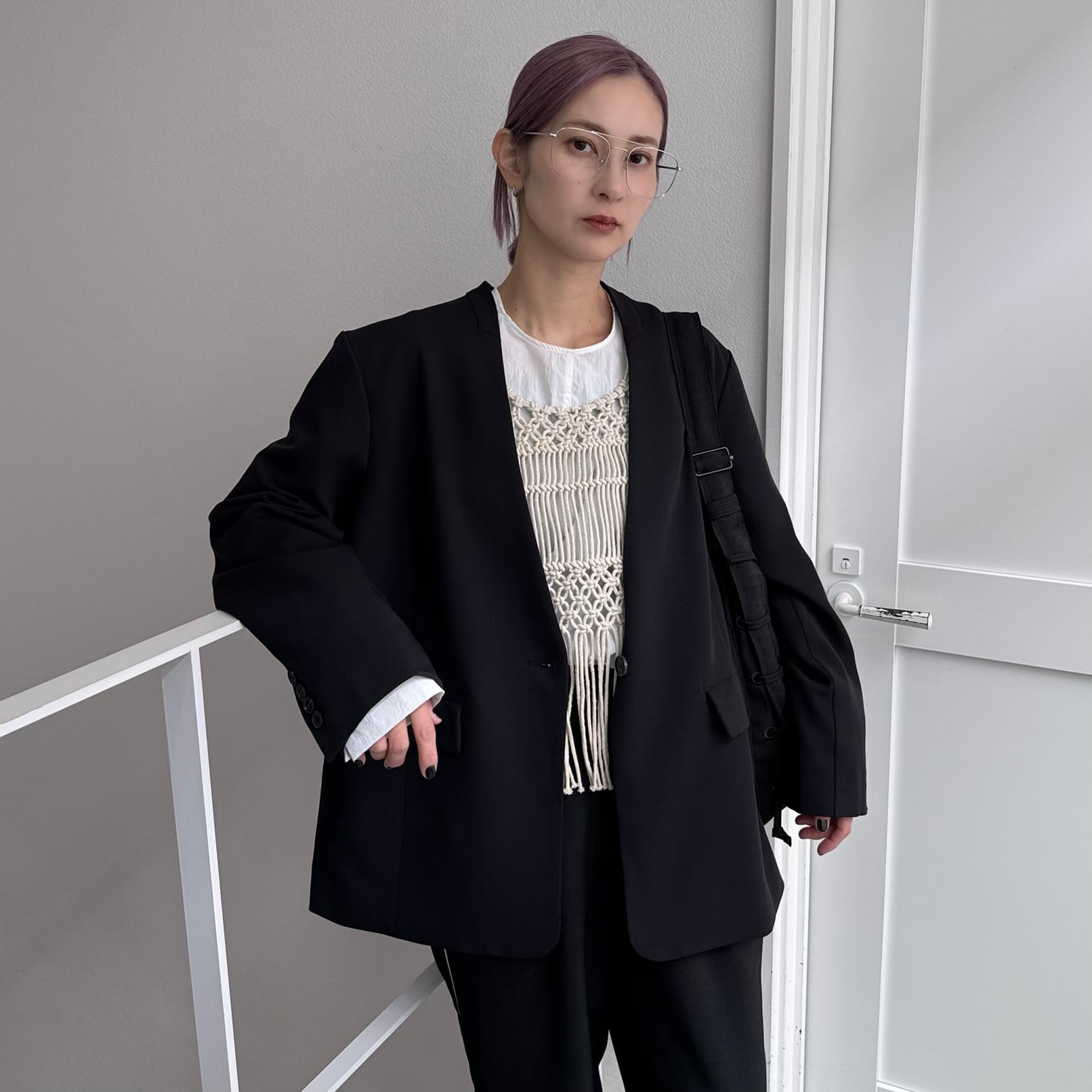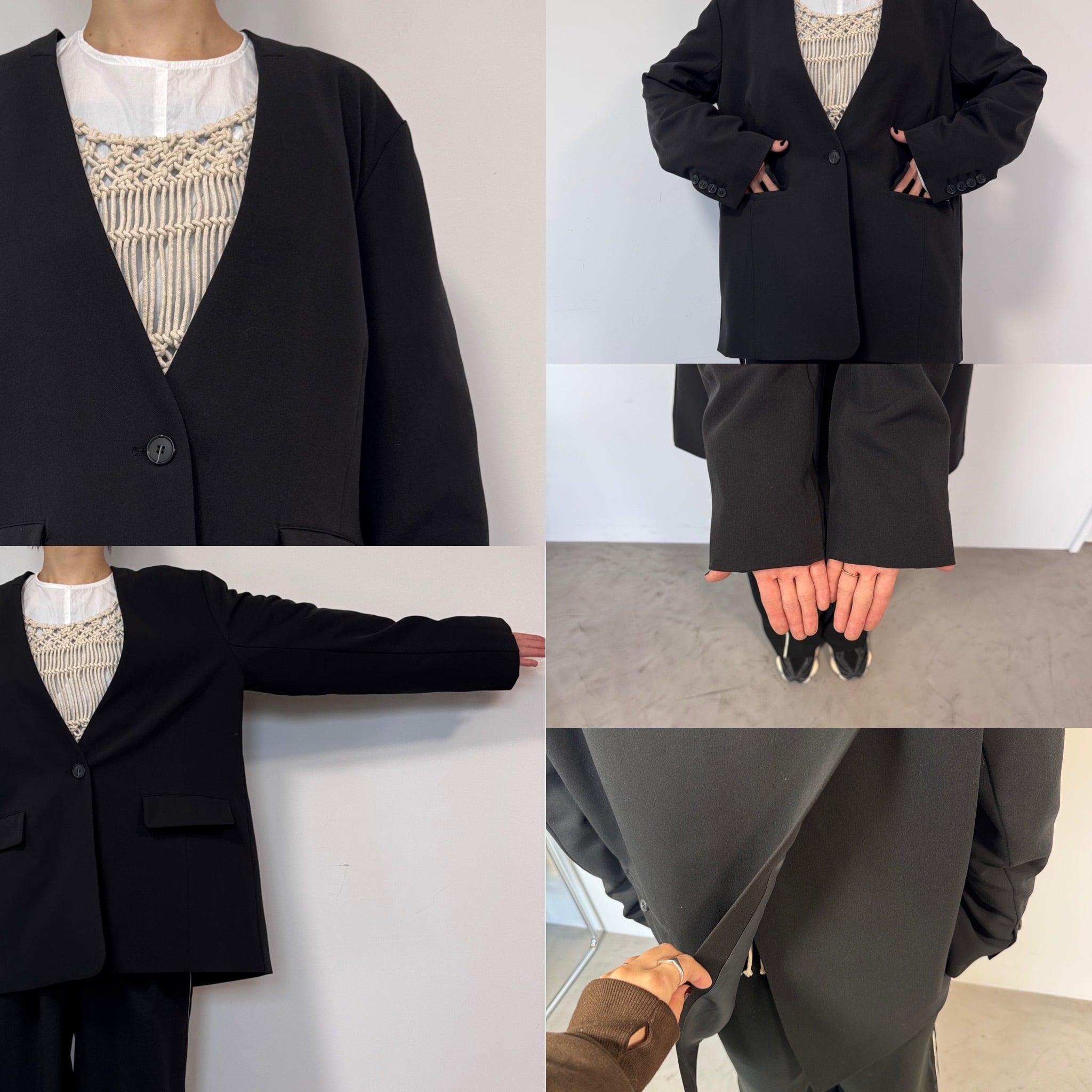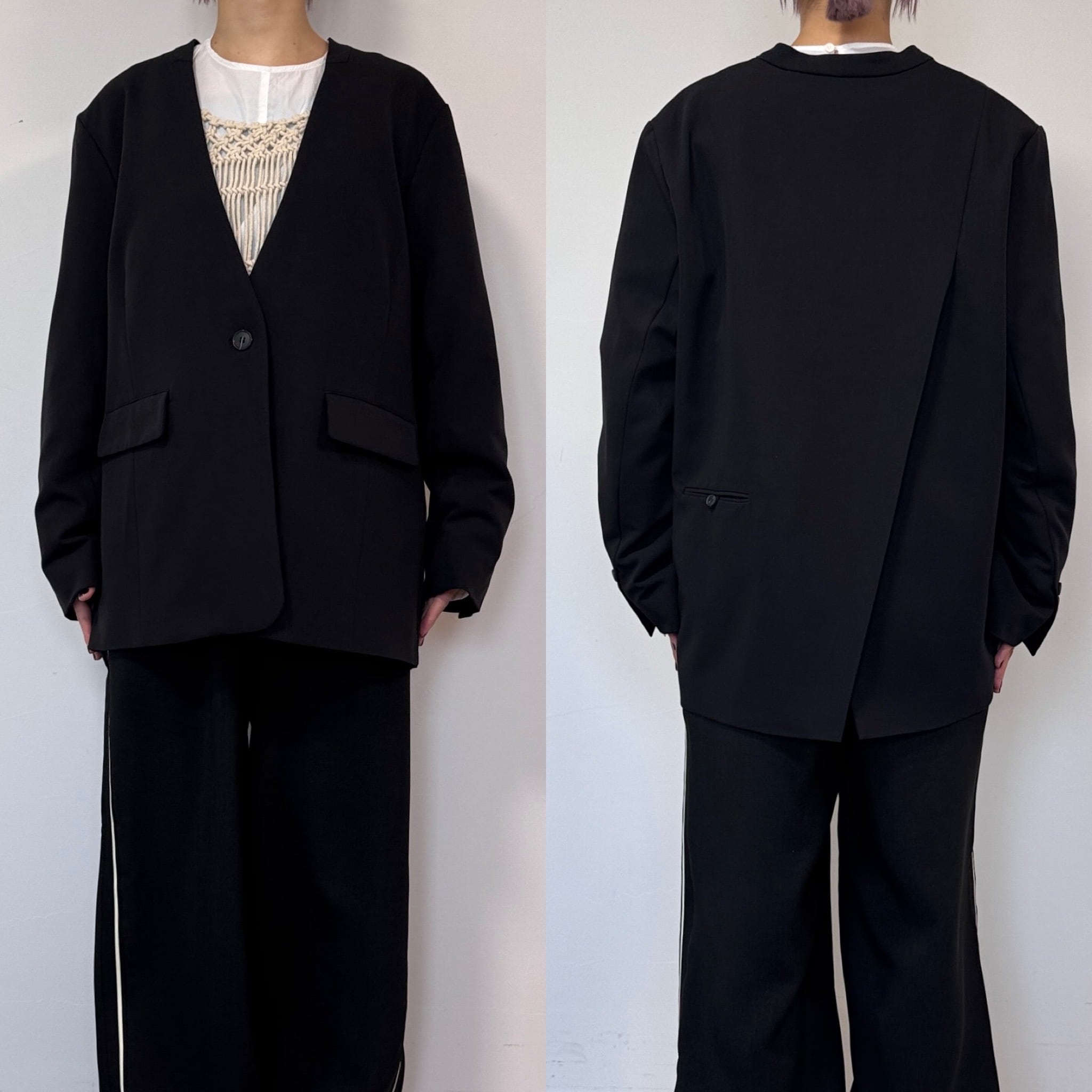バッグデザインがモード感を演出してくれるノーカラージャケット。生地が重なるようなバックスリットとポケットがプラスされたひと癖あるデザインでありながら、リラクシーなゆったりシルエットです。シンプルなインナーに羽織るだけで目を惹く洗練されたデザインです。写真映えにも◎