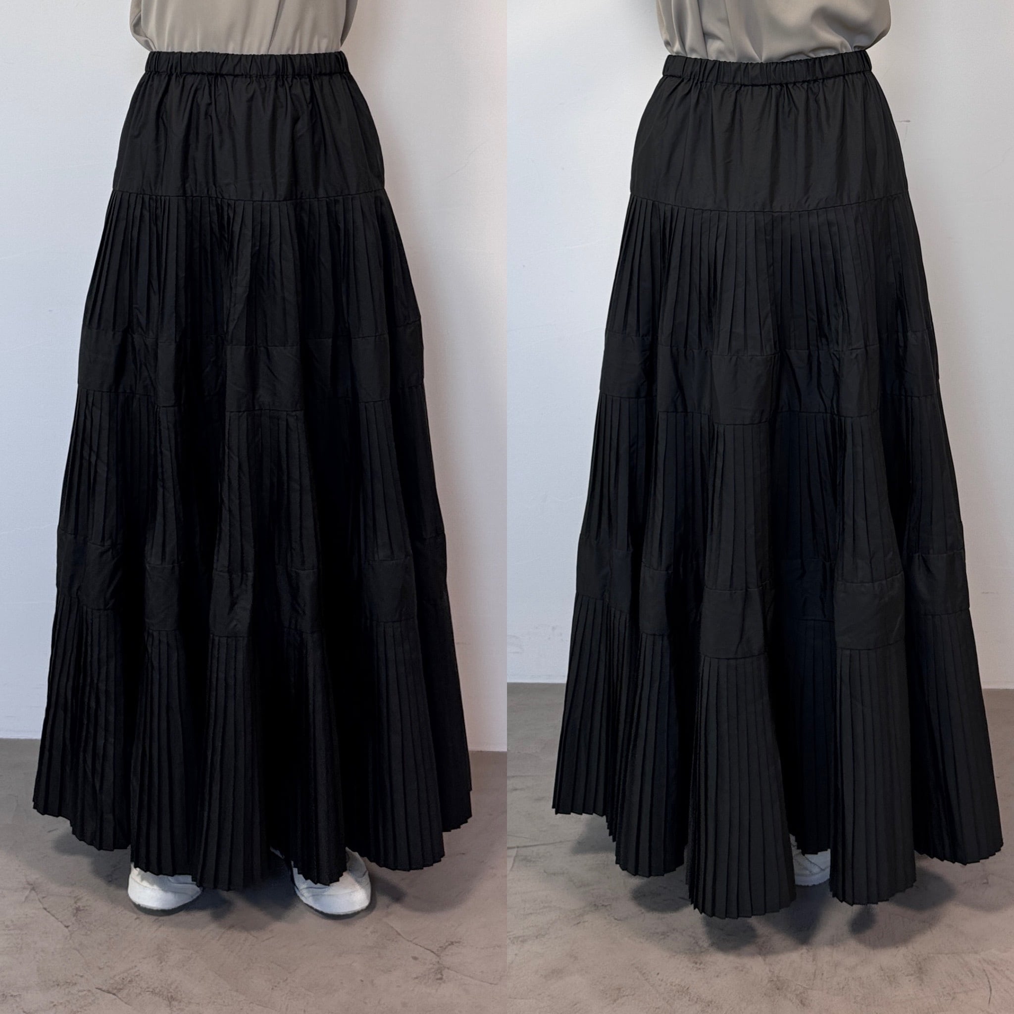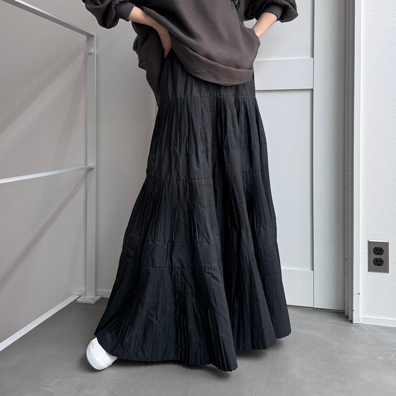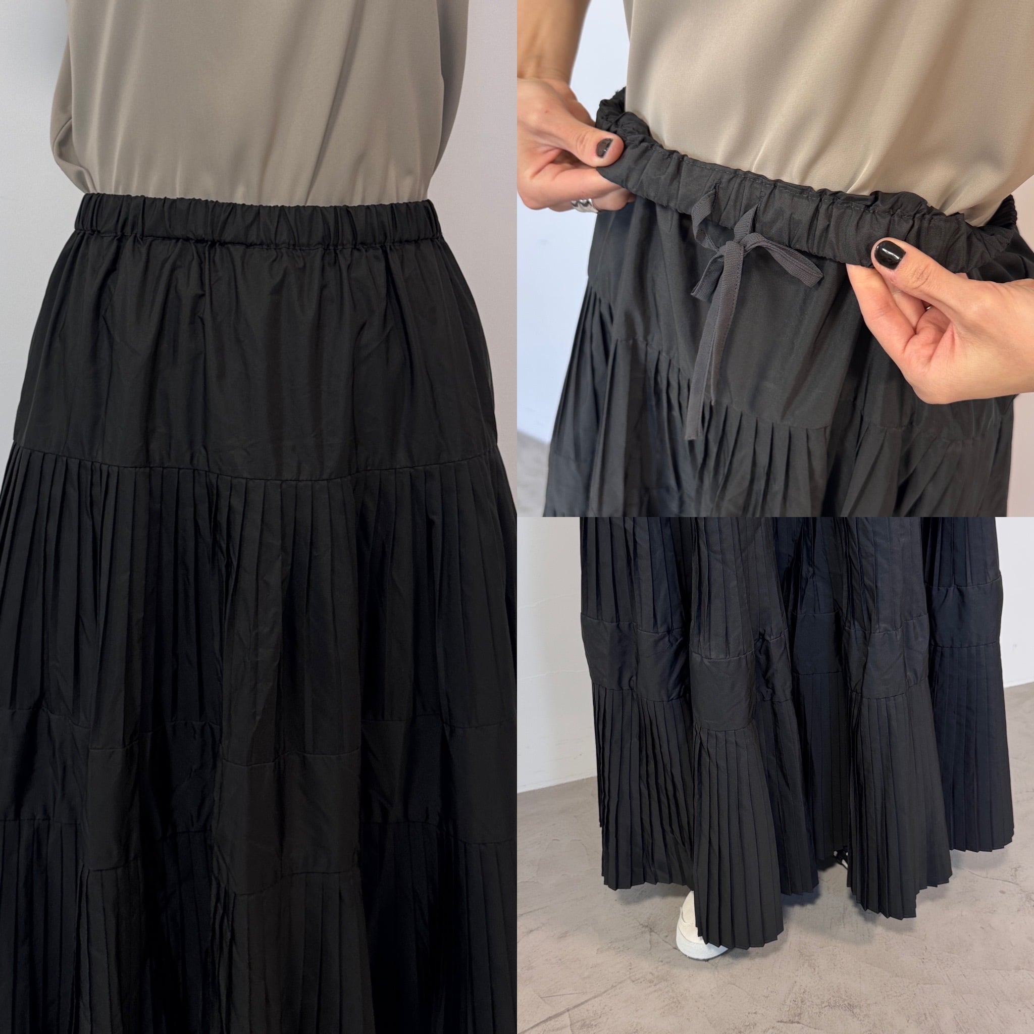 マットな光沢感のあるタフタを使用したティアードスカート。ウエストから段々と広がるプリーツデザインです。裾にかけボリュームを出しているのでスタイルアップして見えるのがポイント。ウエストは平ゴム+紐入りでサイズ調節も可。シンプルなTシャツ1枚でも存在感あるアイテムなのでバランスの良いコーディネートを楽しんでいただけます。
