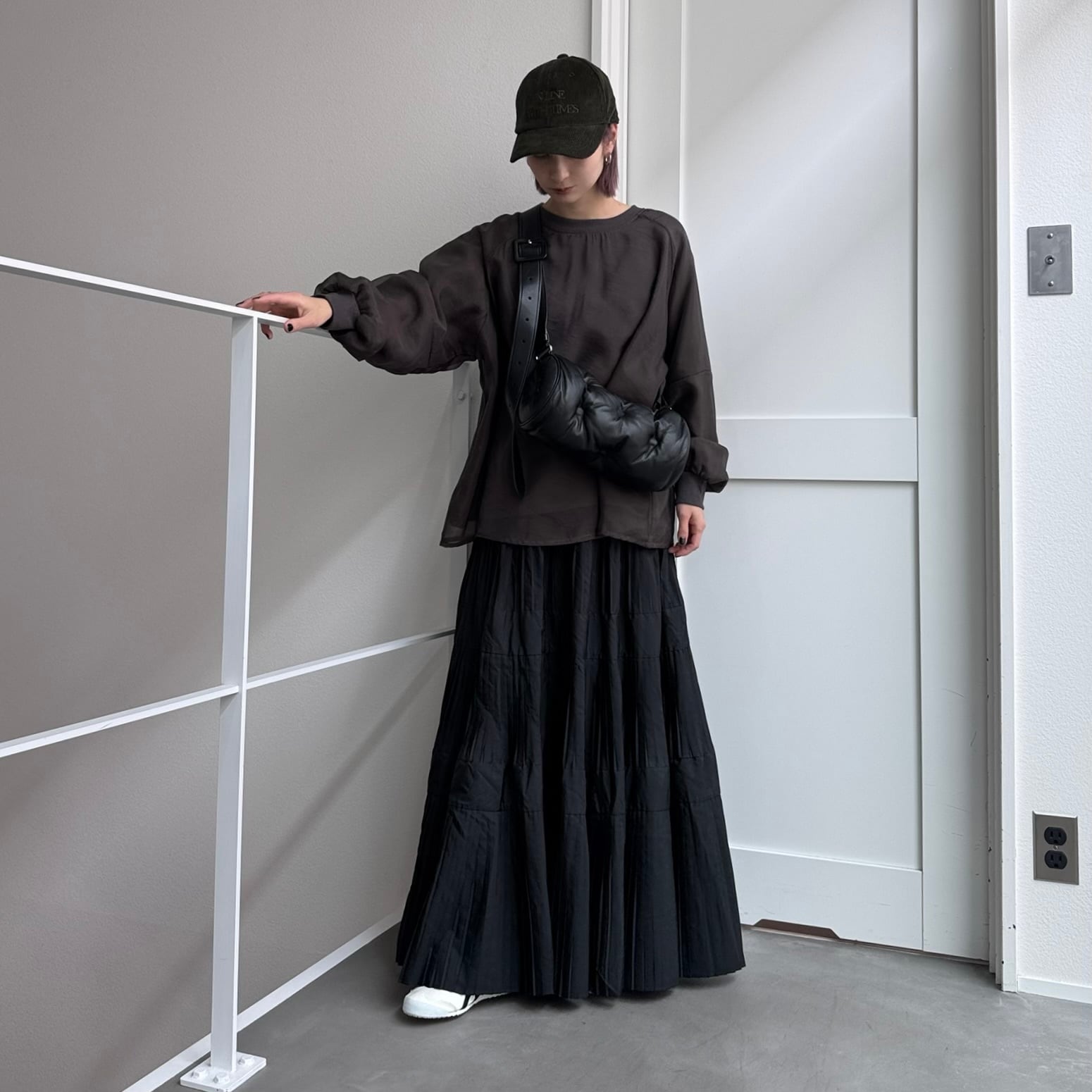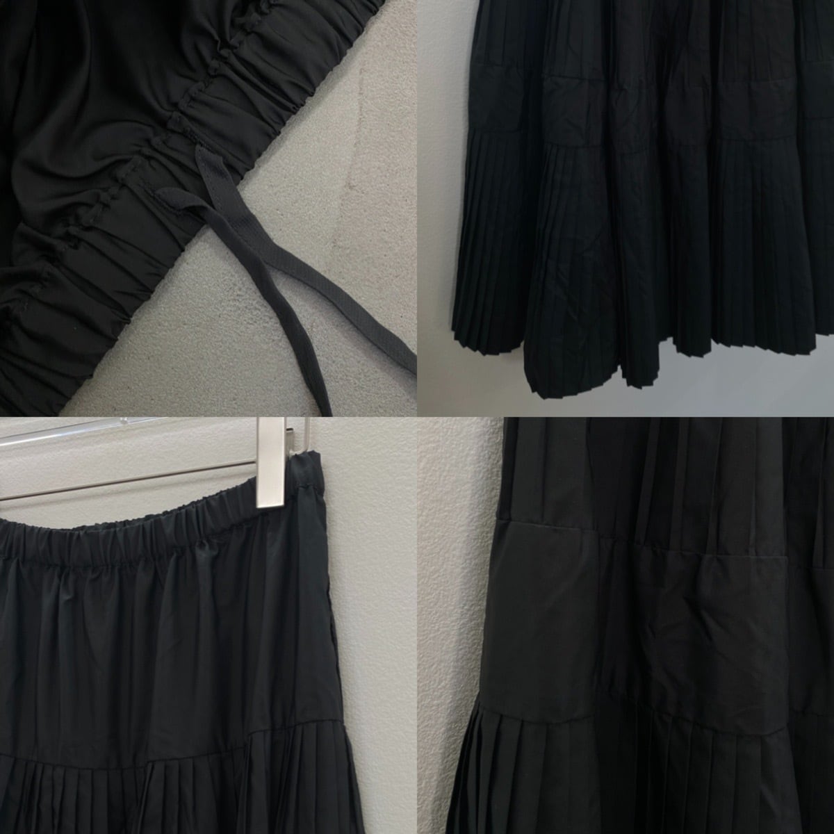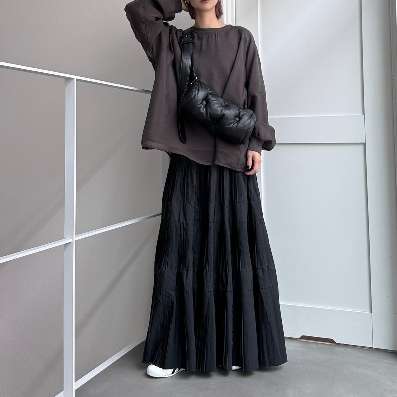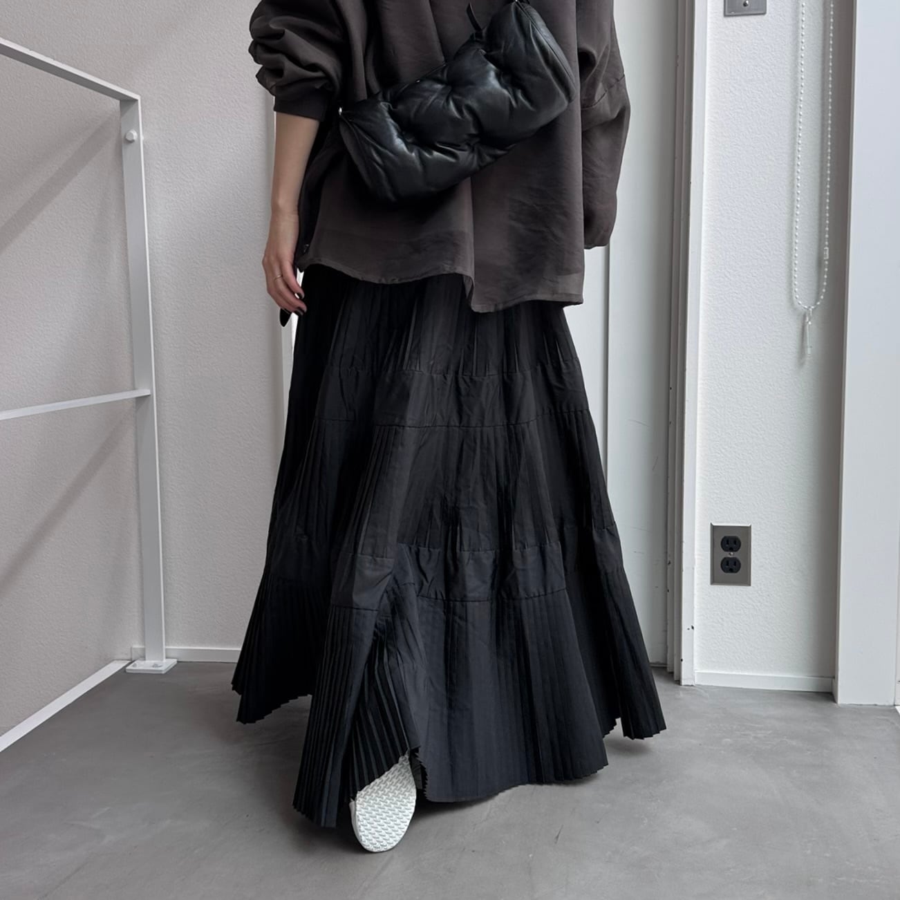 マットな光沢感のあるタフタを使用したティアードスカート。ウエストから段々と広がるプリーツデザインです。裾にかけボリュームを出しているのでスタイルアップして見えるのがポイント。ウエストは平ゴム+紐入りでサイズ調節も可。シンプルなTシャツ1枚でも存在感あるアイテムなのでバランスの良いコーディネートを楽しんでいただけます。