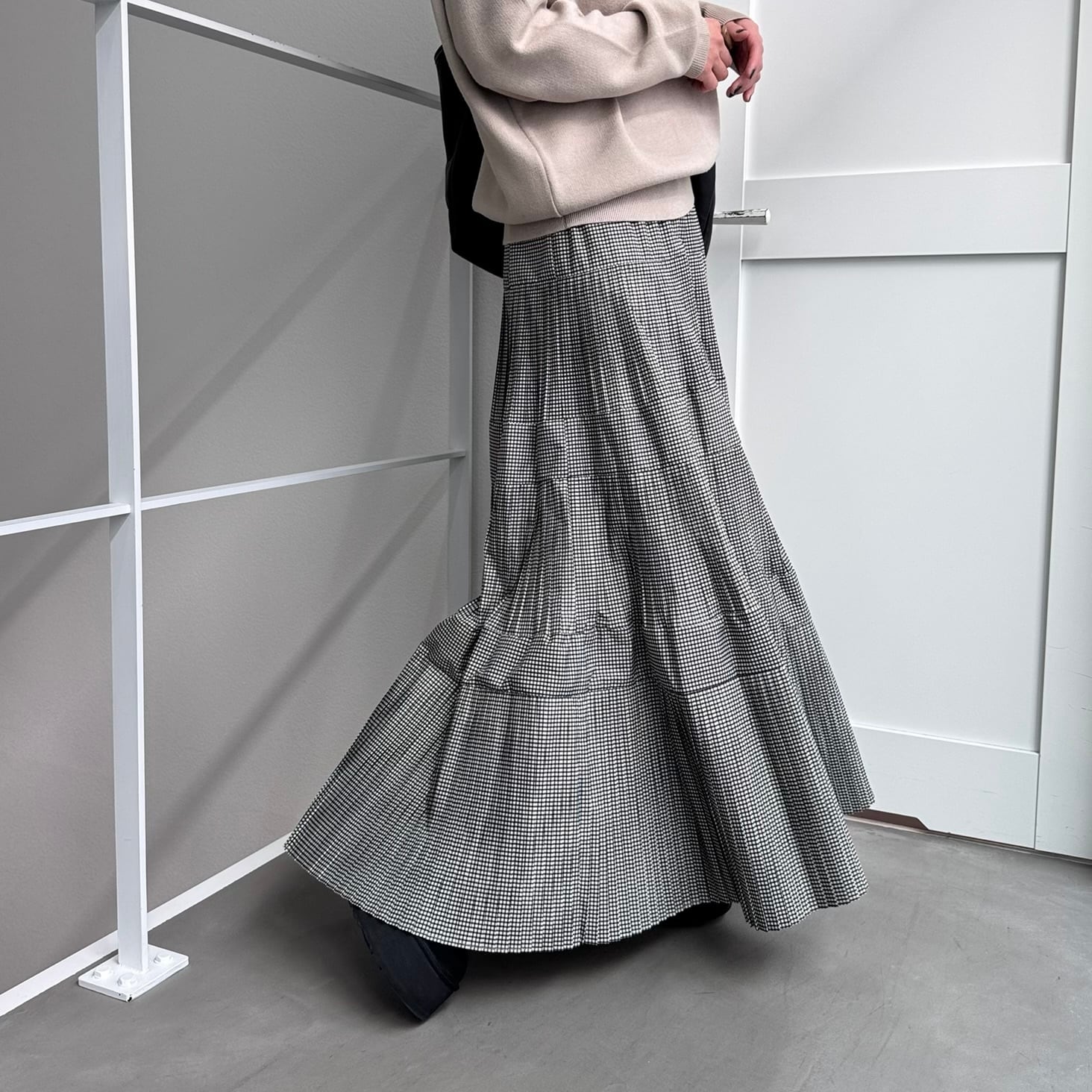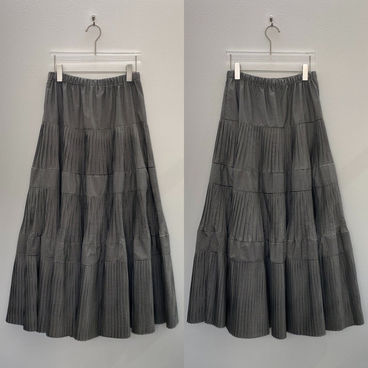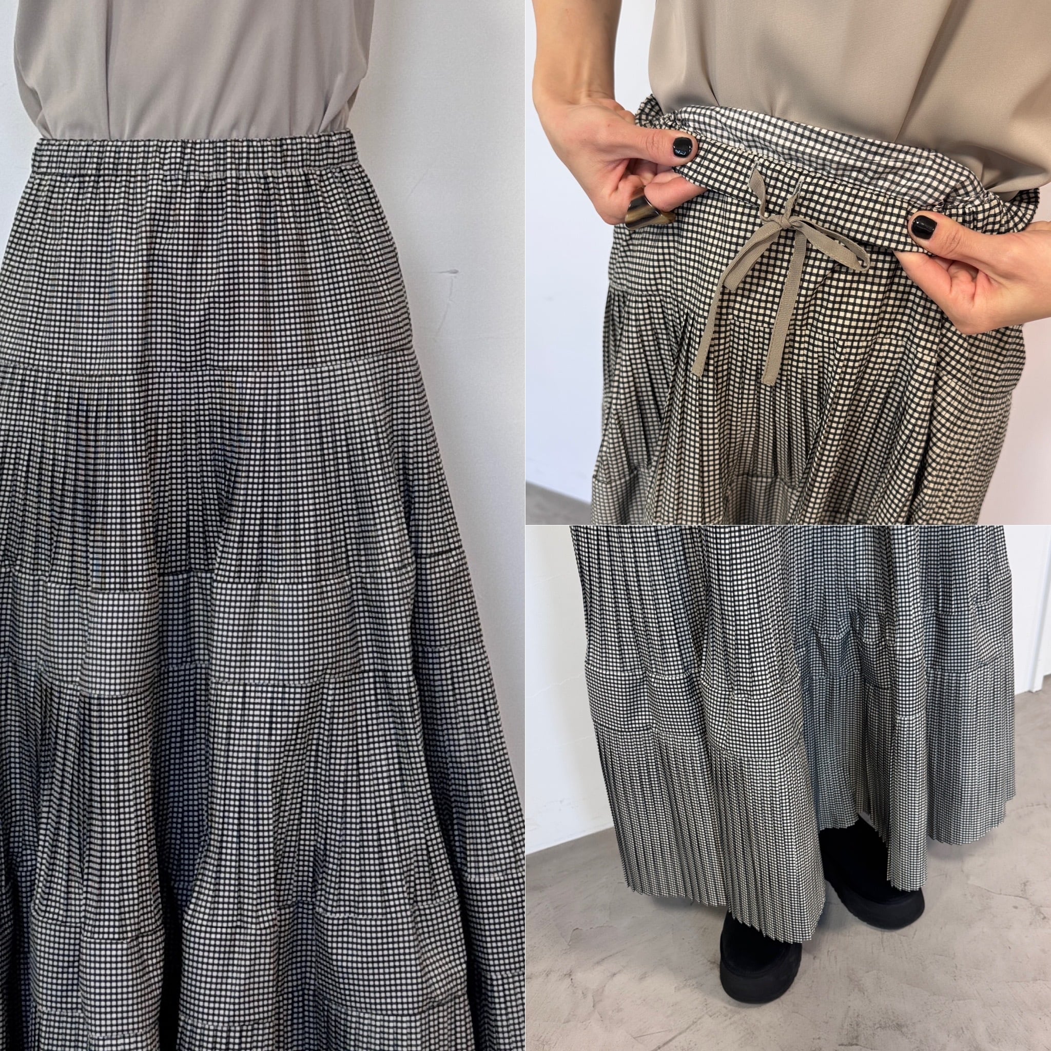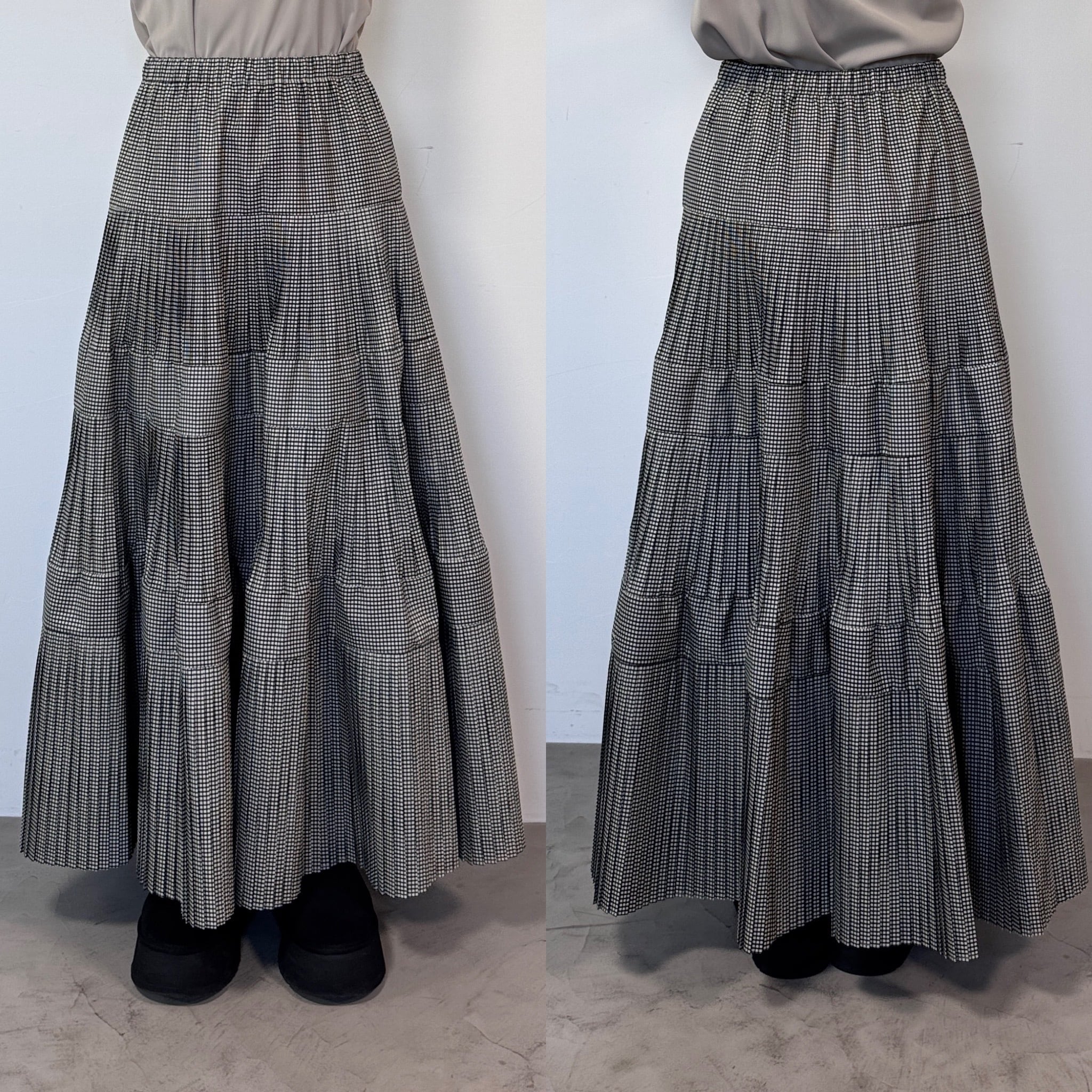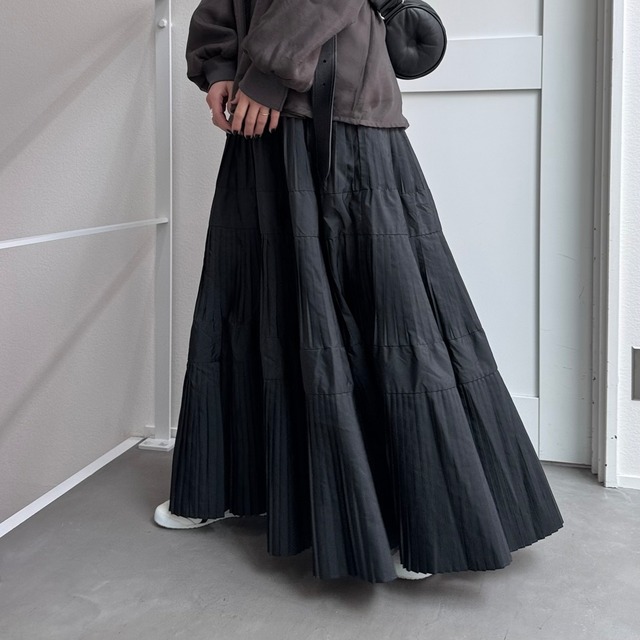 マットな光沢感のあるタフタを使用したティアードスカート。ウエストから段々と広がるプリーツデザインです。裾にかけボリュームを出しているのでスタイルアップして見えるのがポイント。ウエストは平ゴム+紐入りでサイズ調節も可。シンプルなTシャツ1枚でも存在感あるアイテムなのでバランスの良いコーディネートを楽しんでいただけます。