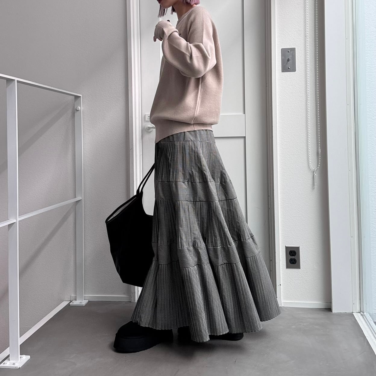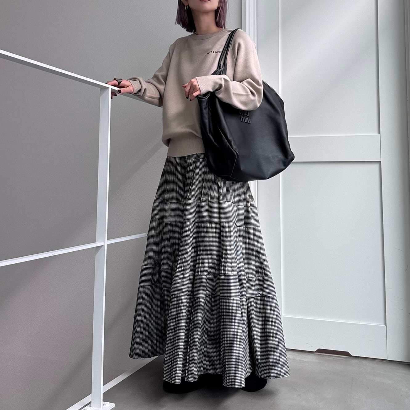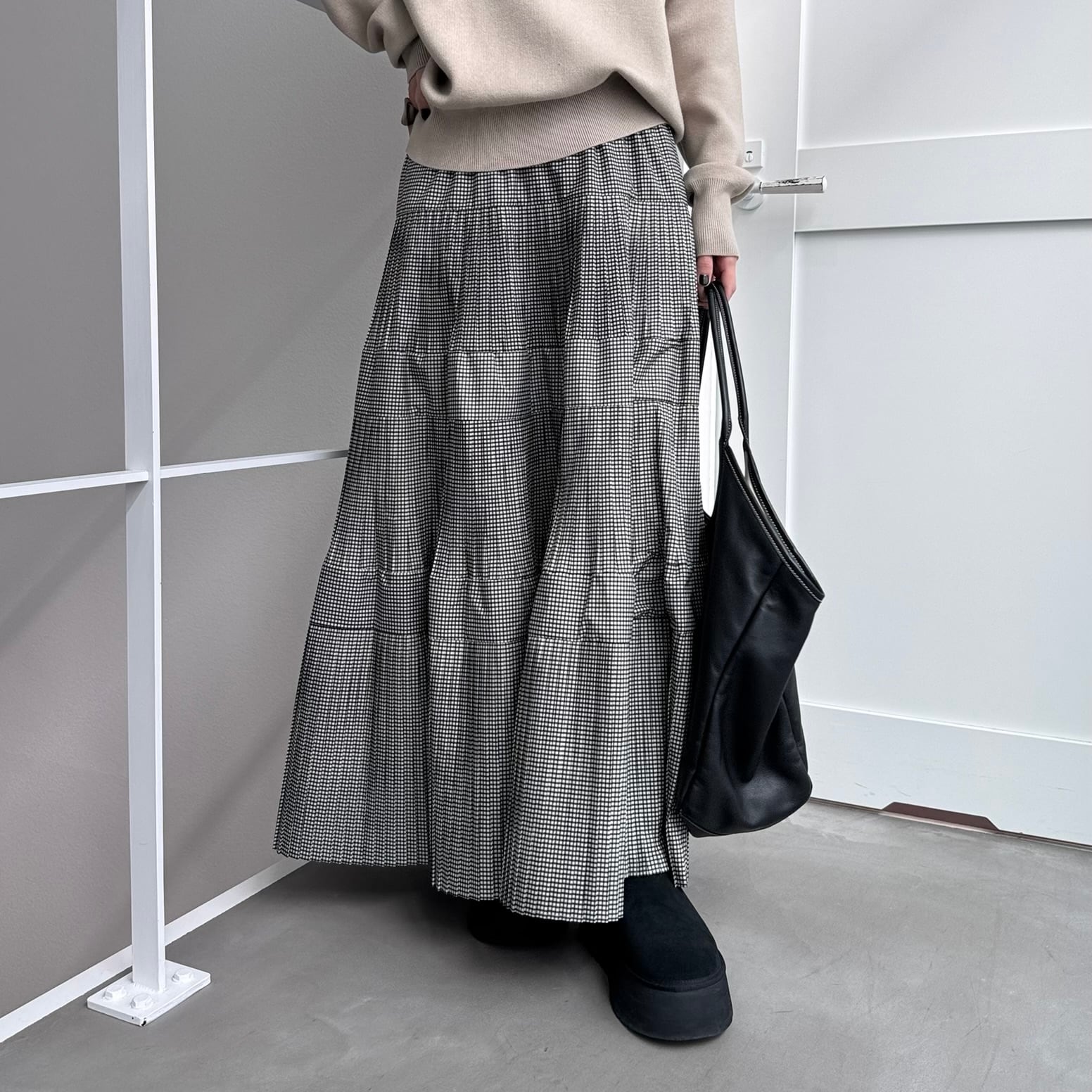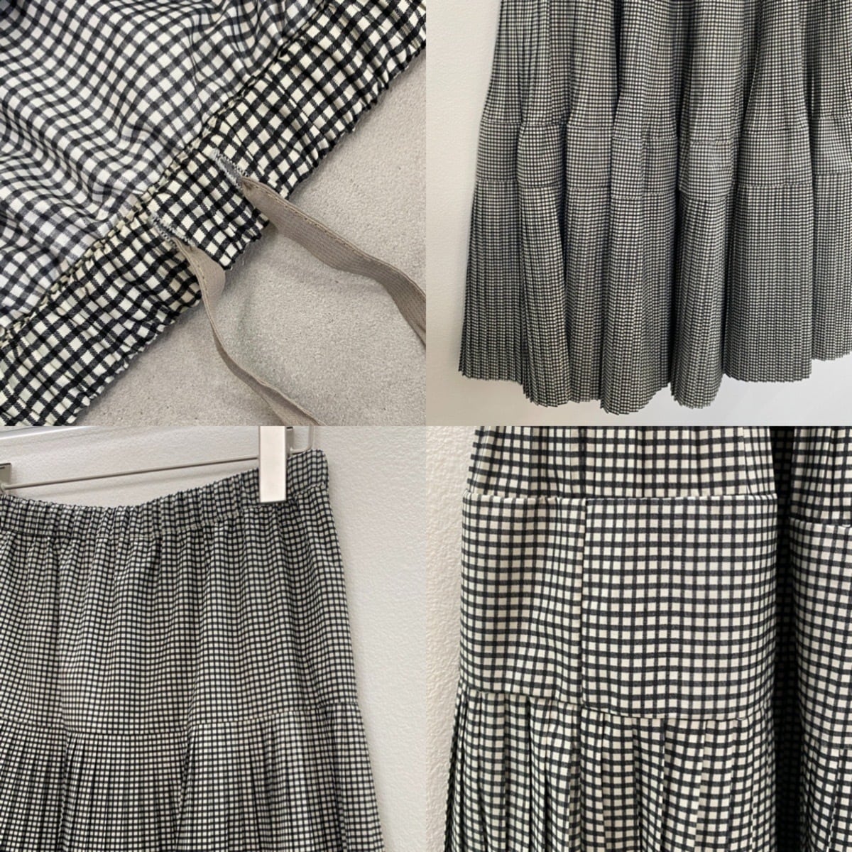 マットな光沢感のあるタフタを使用したティアードスカート。ウエストから段々と広がるプリーツデザインです。裾にかけボリュームを出しているのでスタイルアップして見えるのがポイント。ウエストは平ゴム+紐入りでサイズ調節も可。シンプルなTシャツ1枚でも存在感あるアイテムなのでバランスの良いコーディネートを楽しんでいただけます。
