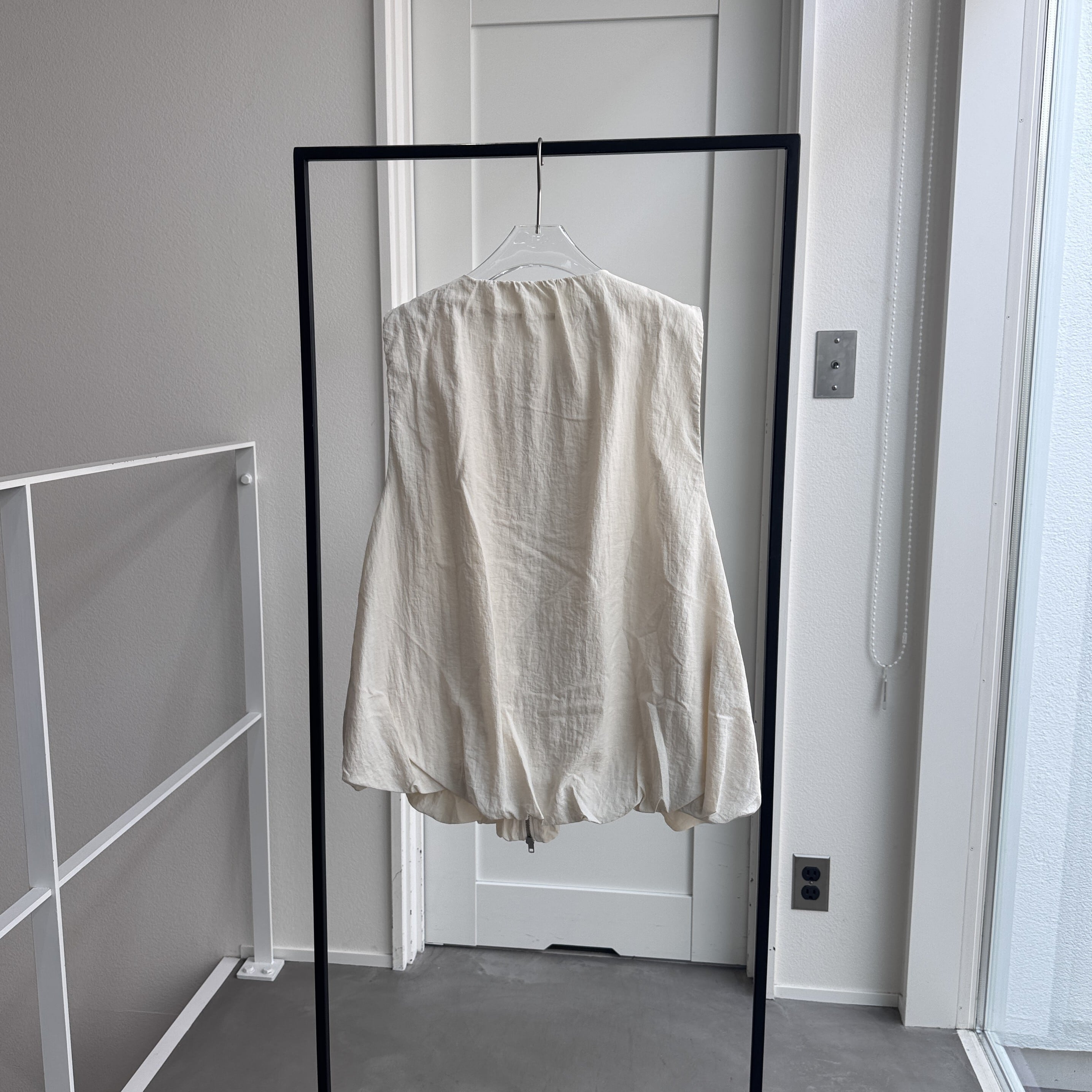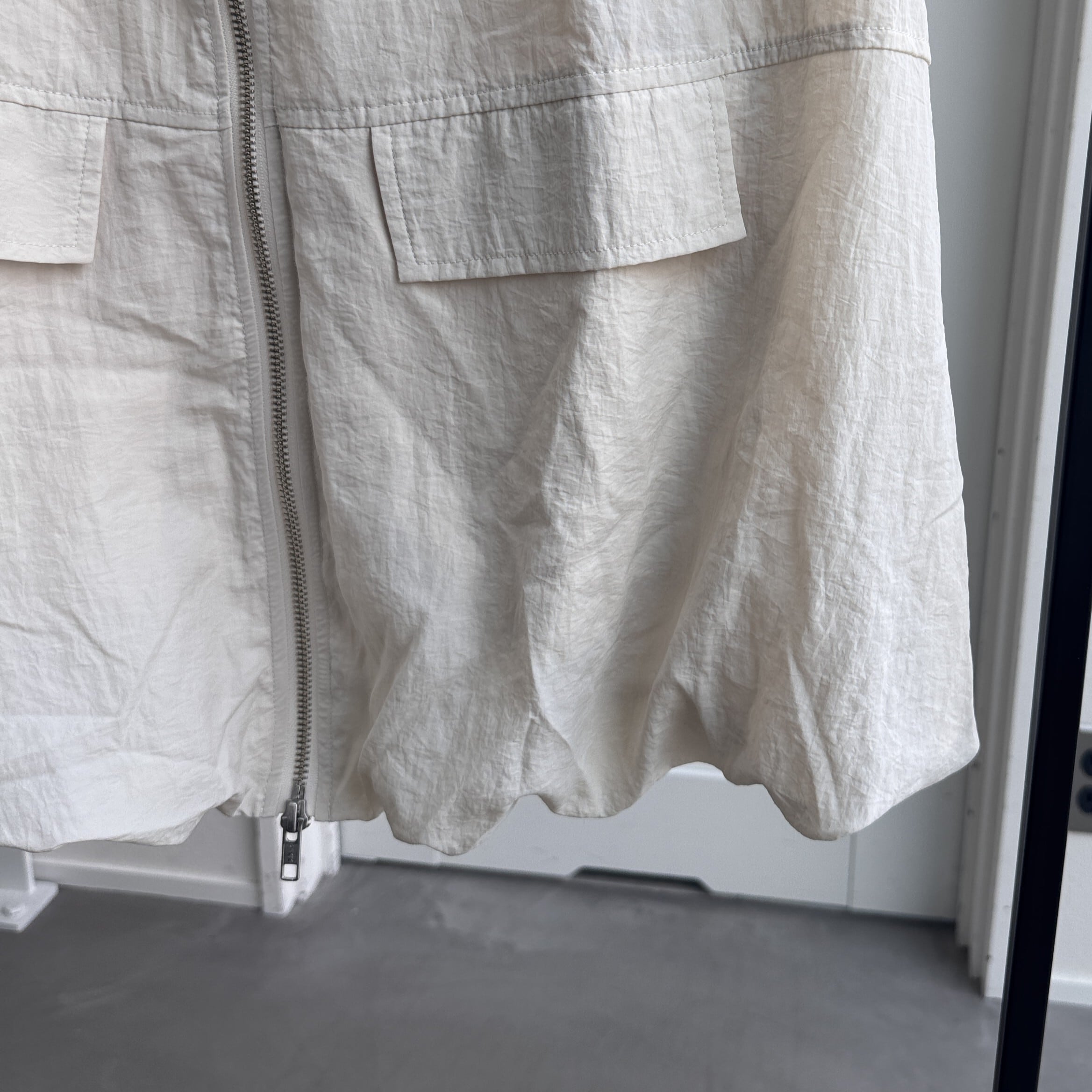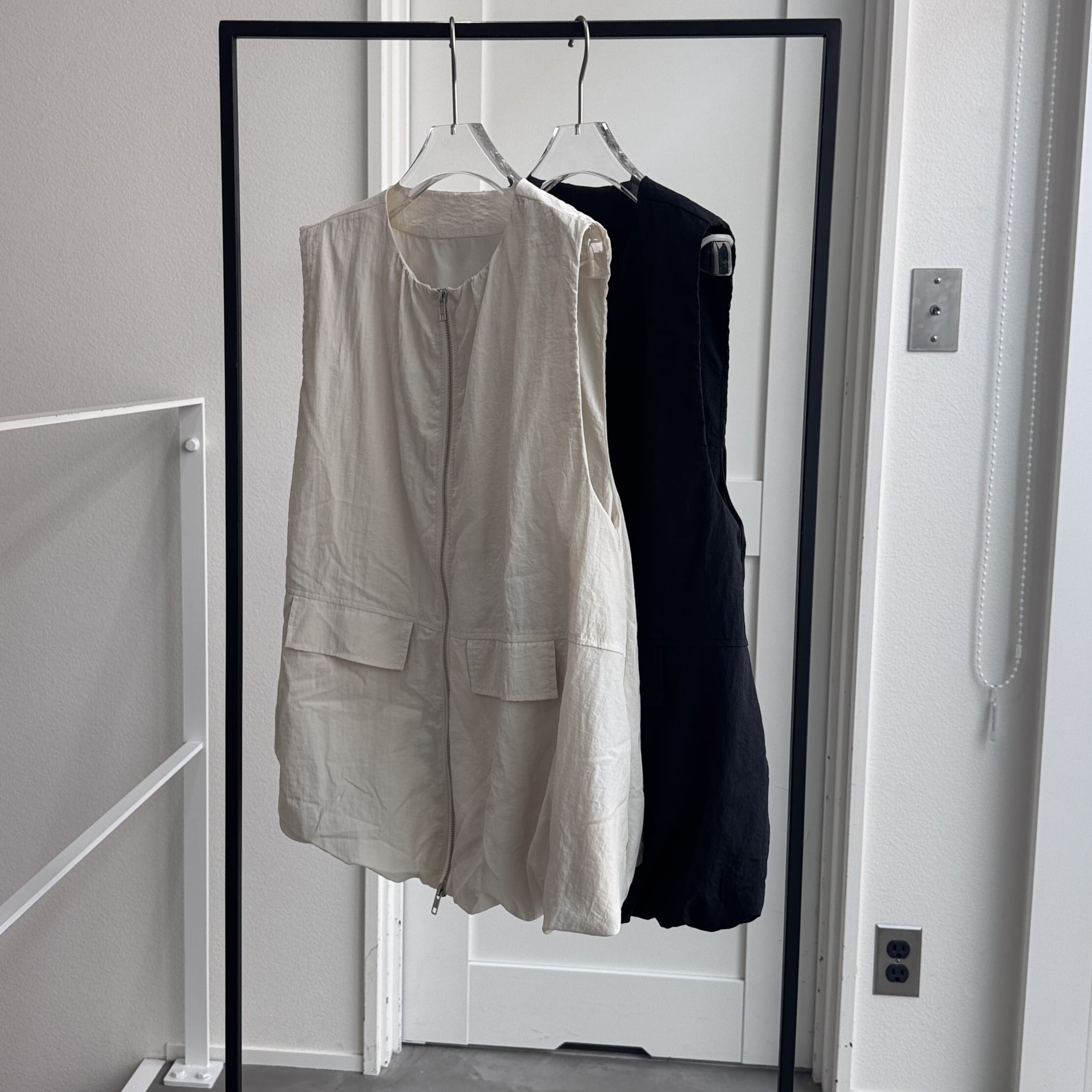 バルーンシルエットが女性らしさをアピールしながらも、ナイロン素材を使用することでモードな印象にもハマる1点。アームホールを広めに取っているので、スウェットや袖がバルーン仕様になったトップス等もインナーに着用できます。さらにWジップ仕様。ロンTee・ノースリーブ等でもレイヤードできロングシーズン活躍するアイテム。ポケット付きで機能性も◎