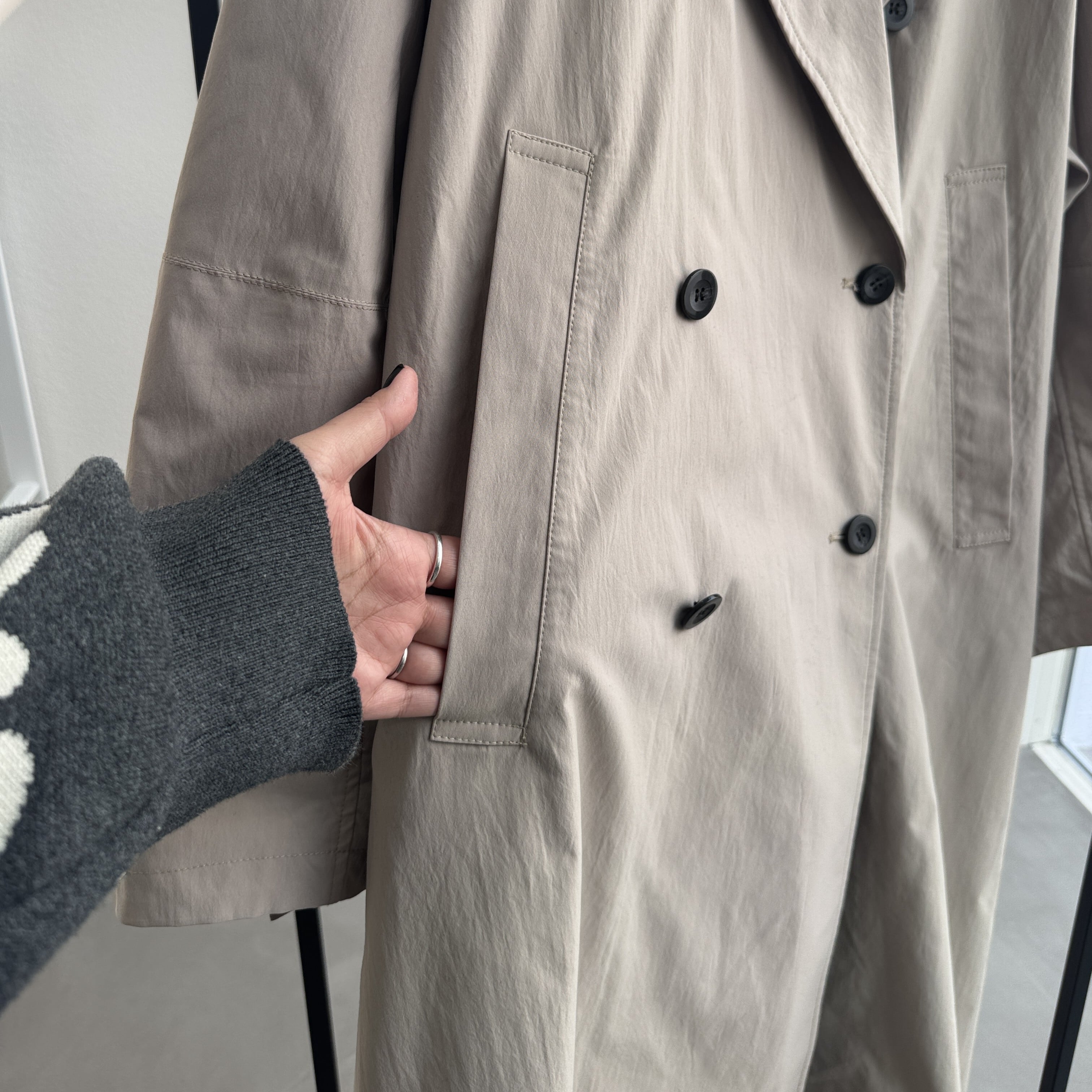ボリューミーなシルエットがこなれ感を演出してくれるスプリングコート。立体的な袖と、たっぷり身幅のあるシルエットがポイント。袖口内側には、さりげなくアイボリーカラーのヘリンボーン生地を使用し、袖口を少し折ることでポイントに。衿はタブ付きで、衿を立てて着用も可能。カジュアルにも、キレイめにもスタイリングできる万能ロングコートです。