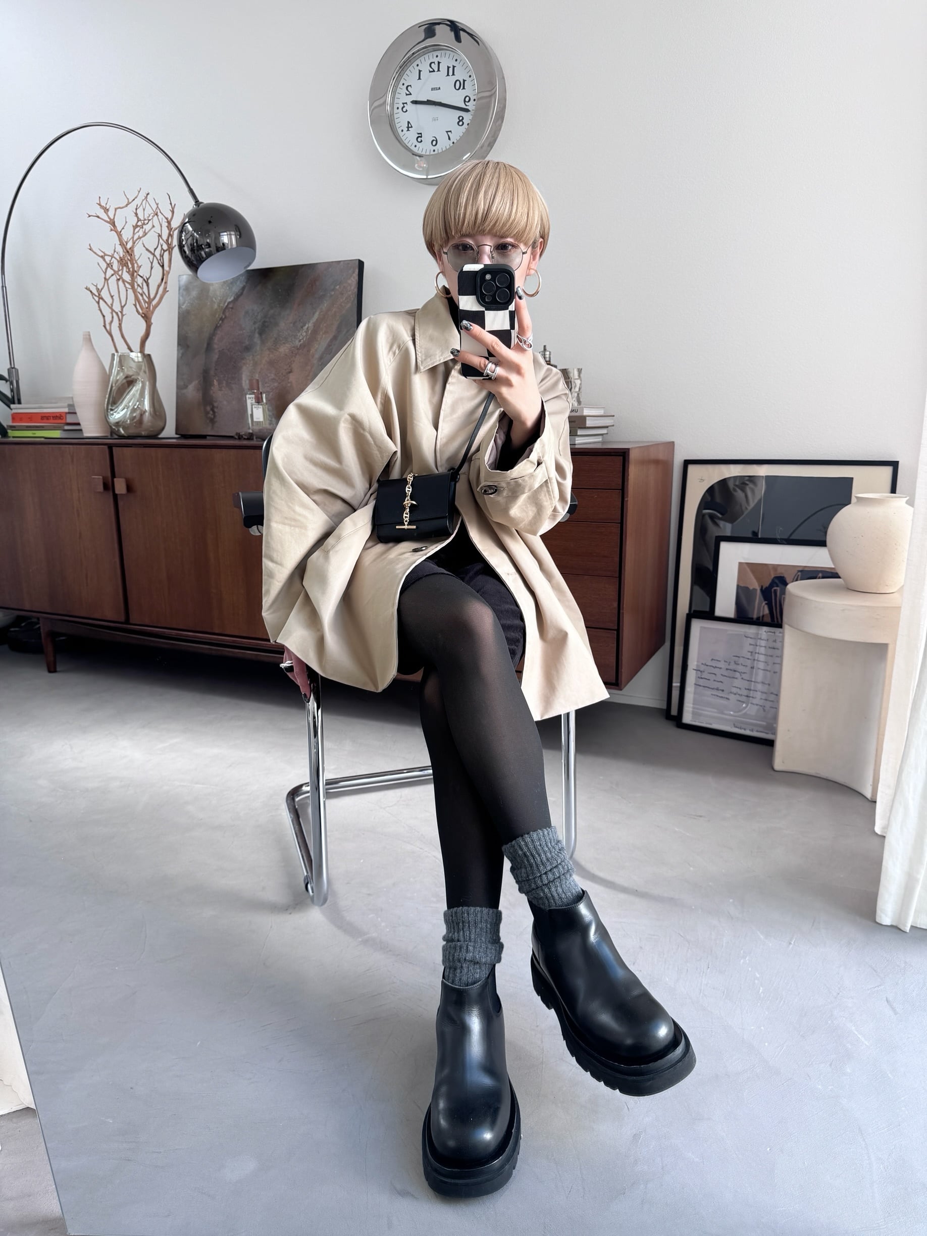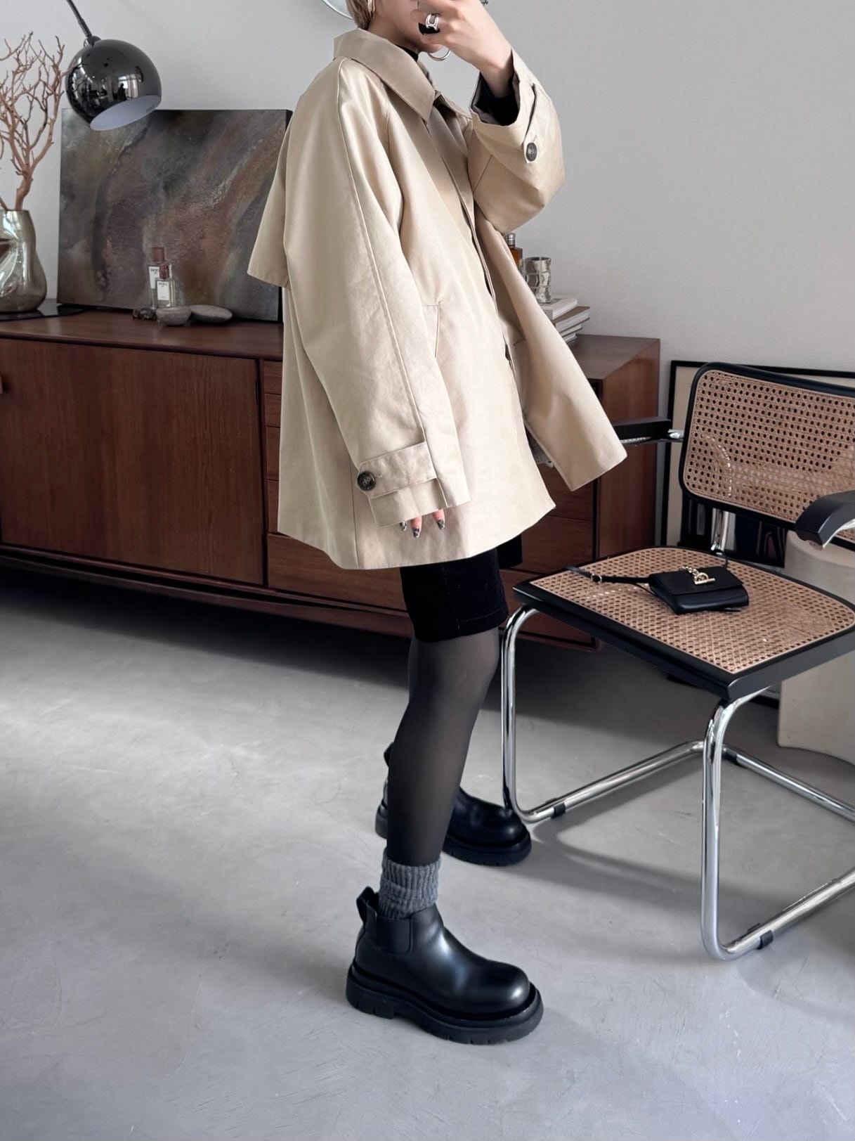 Aラインシルエットのミドル丈ジャケット。ハリのあるツイル素材を使用しています。程よく広がるバックスタイルが、動きに合わせて美しい立体感を演出。トレンチのディテールのヨークデザインと、顔まわりをすっきり見せるシャープな襟デザイン、ミニマルなフロントで大人らしい印象に。パンツにもスカートにも合わせやすく、デイリーからきれいめまで幅広く活躍する一着です。