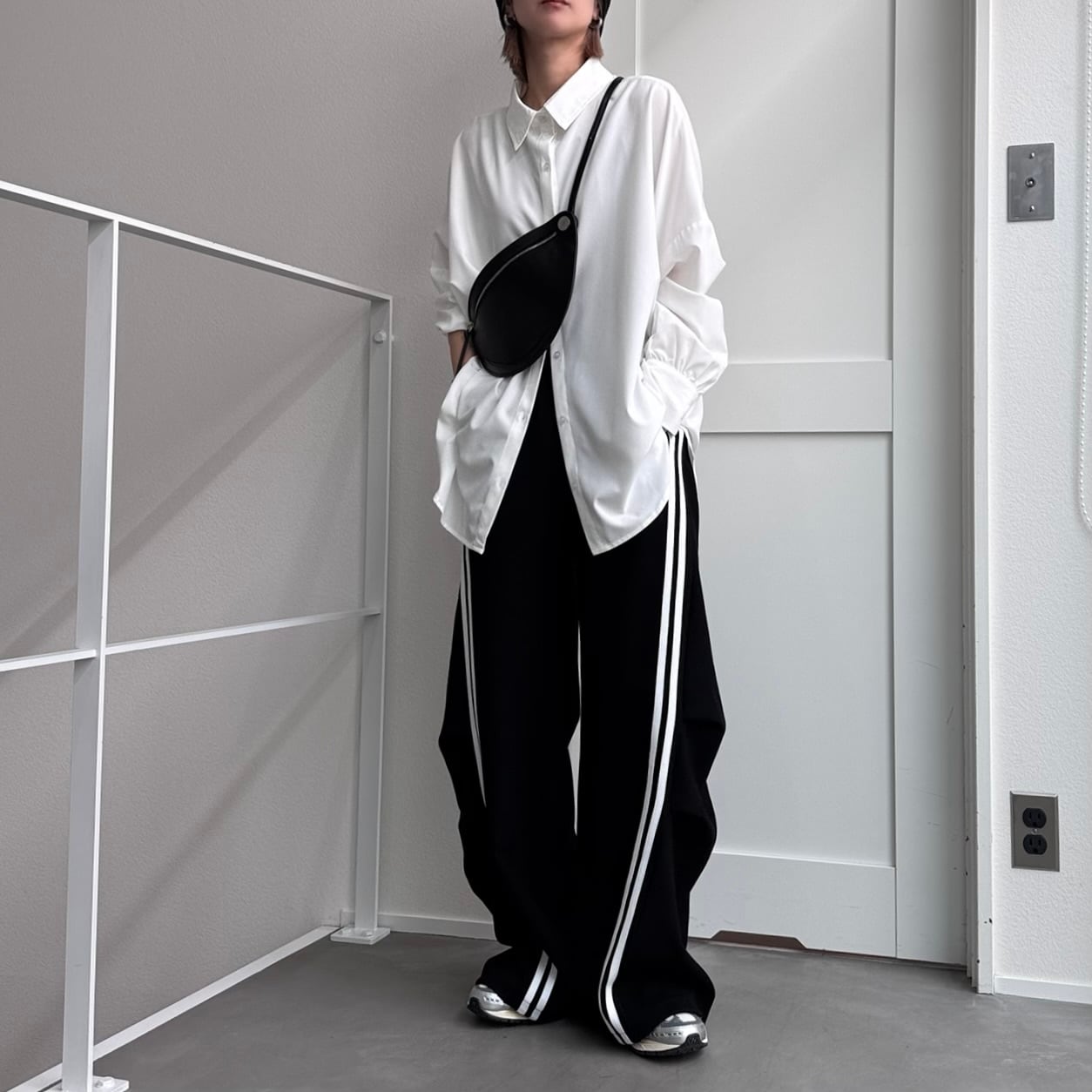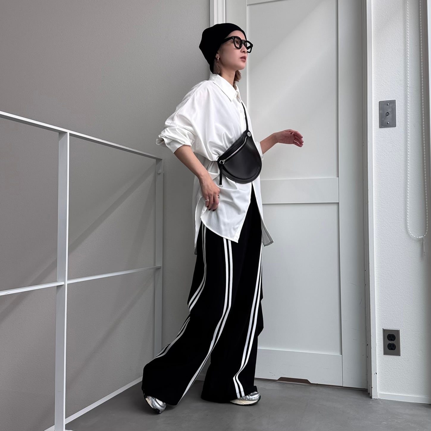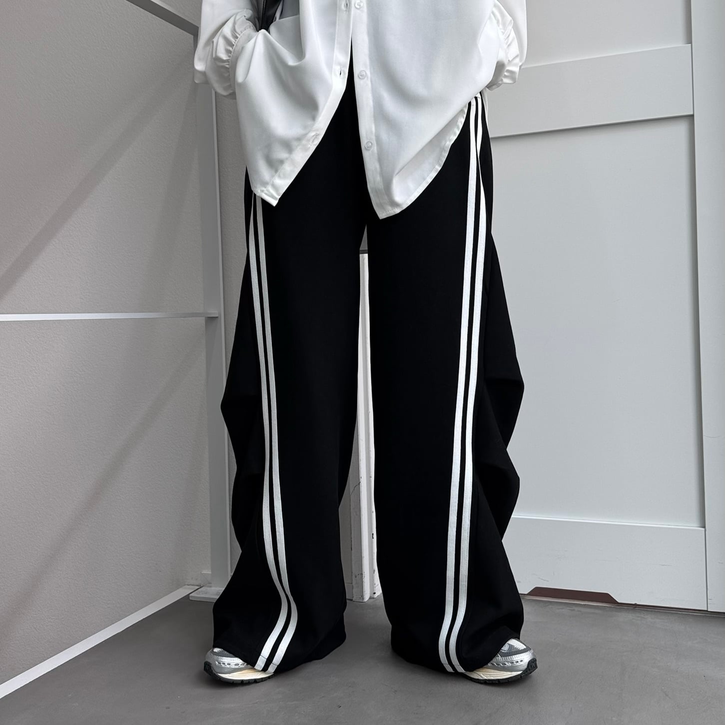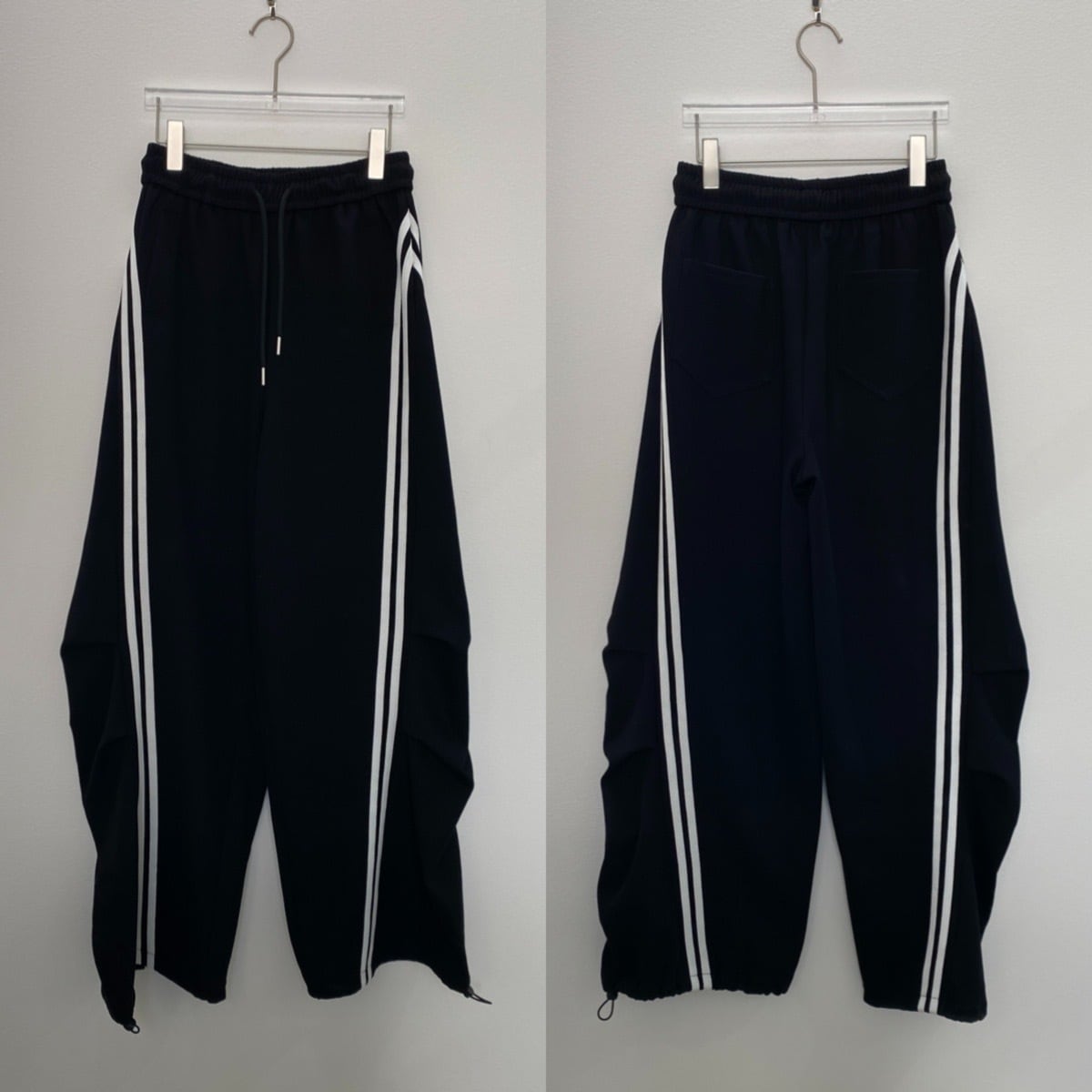 インパクトある2ラインカーブパンツ。サイドから斜め前にかけてカーブする切替に沿ったライン横からタックによる立体カーブシルエットデザインになっています。裾はドロスト仕様。絞ればバルーンに変化できアレンジ楽しめます。丈感は長めで脚長効果は抜群。マニッシュな雰囲気なのにウエストゴム仕様でリラックスして着用いただけます。