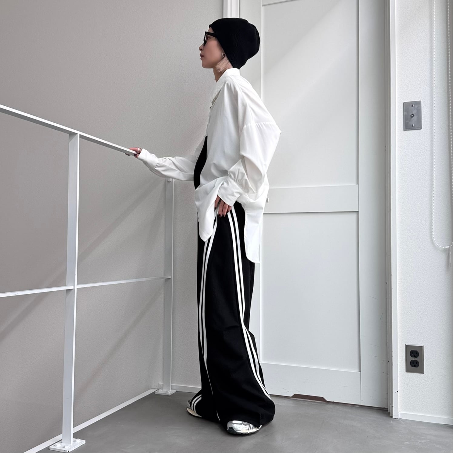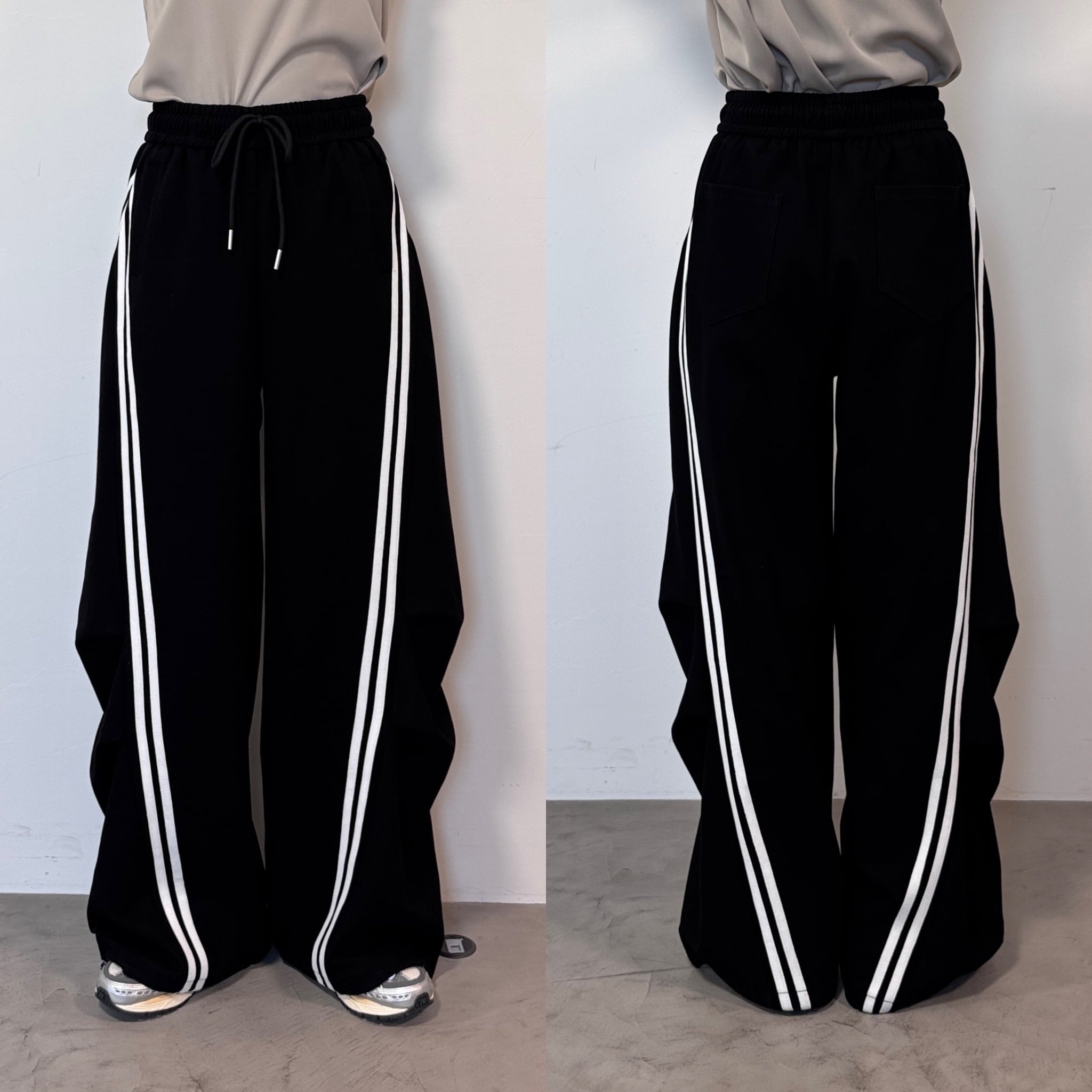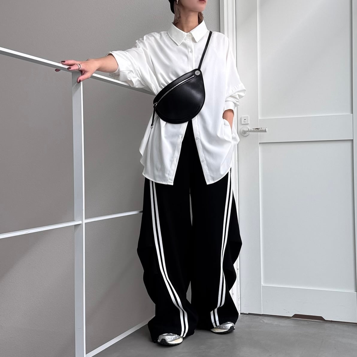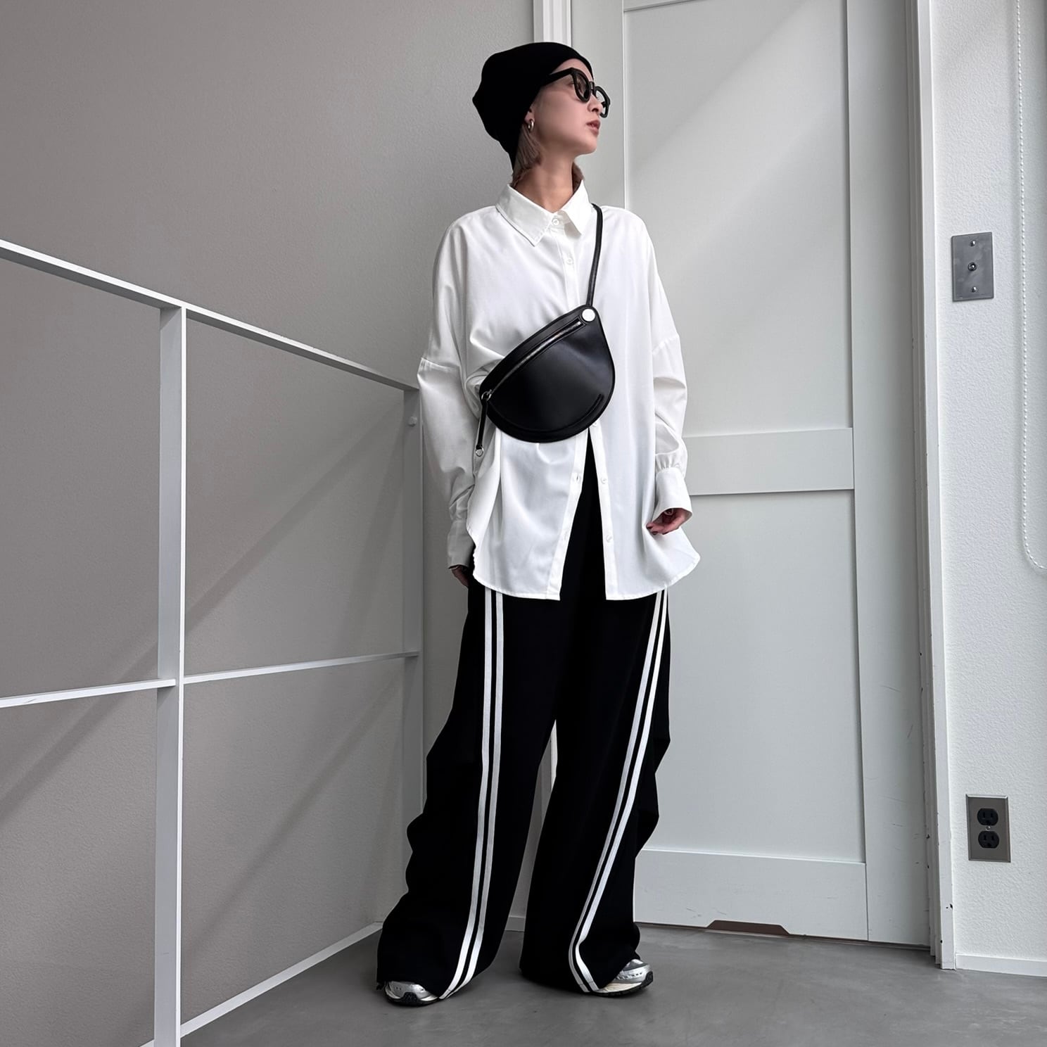 インパクトある2ラインカーブパンツ。サイドから斜め前にかけてカーブする切替に沿ったライン横からタックによる立体カーブシルエットデザインになっています。裾はドロスト仕様。絞ればバルーンに変化できアレンジ楽しめます。丈感は長めで脚長効果は抜群。マニッシュな雰囲気なのにウエストゴム仕様でリラックスして着用いただけます。