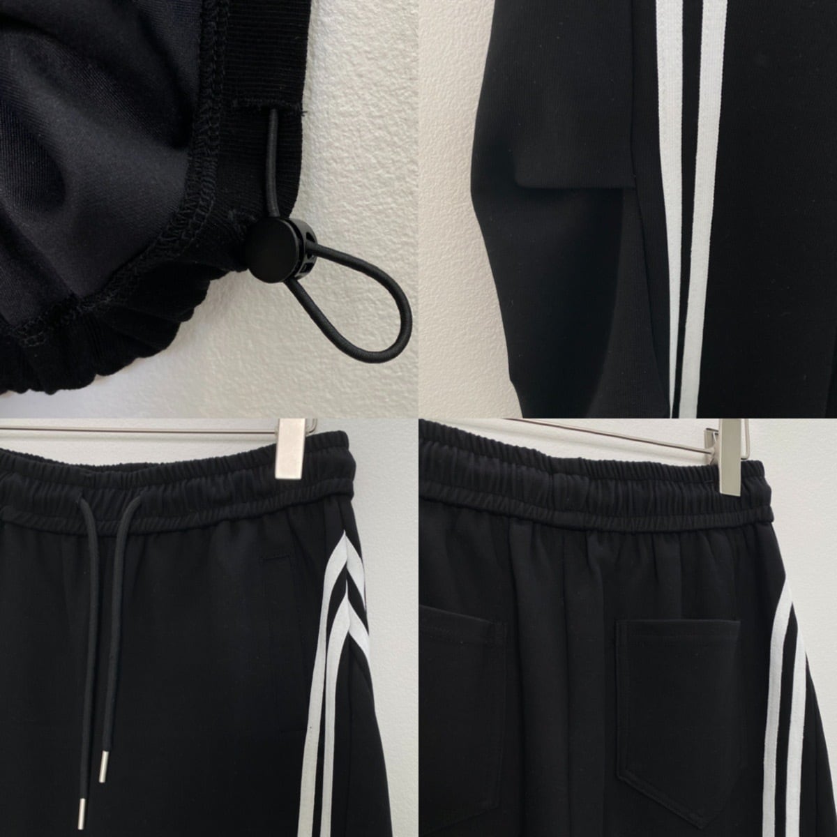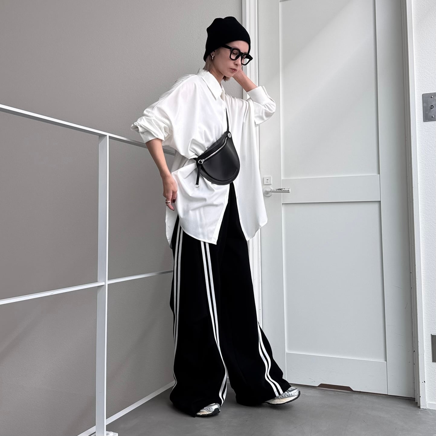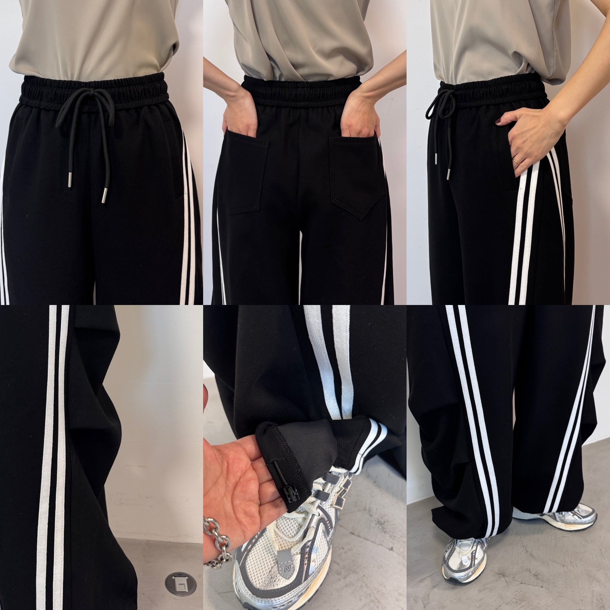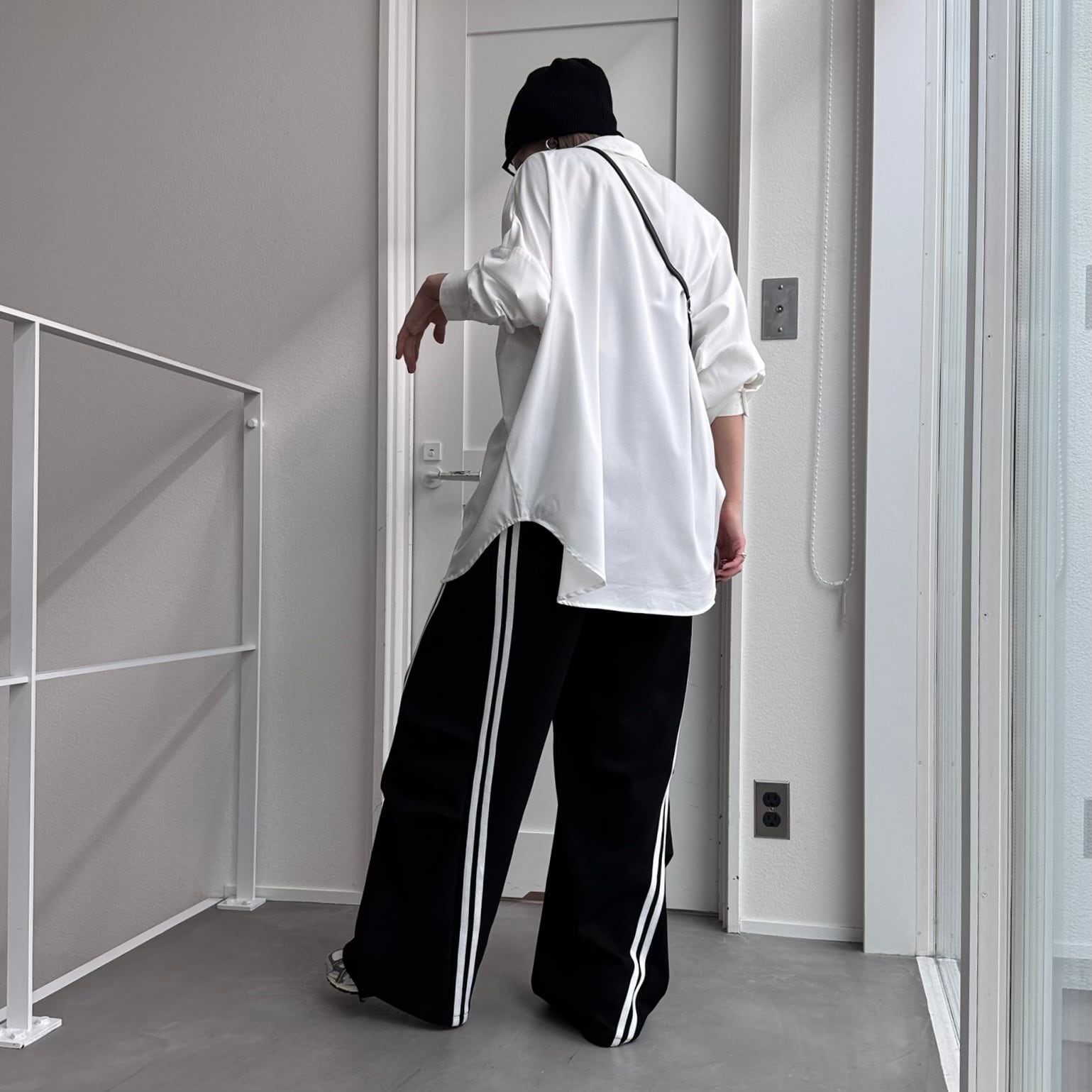 インパクトある2ラインカーブパンツ。サイドから斜め前にかけてカーブする切替に沿ったライン横からタックによる立体カーブシルエットデザインになっています。裾はドロスト仕様。絞ればバルーンに変化できアレンジ楽しめます。丈感は長めで脚長効果は抜群。マニッシュな雰囲気なのにウエストゴム仕様でリラックスして着用いただけます。
