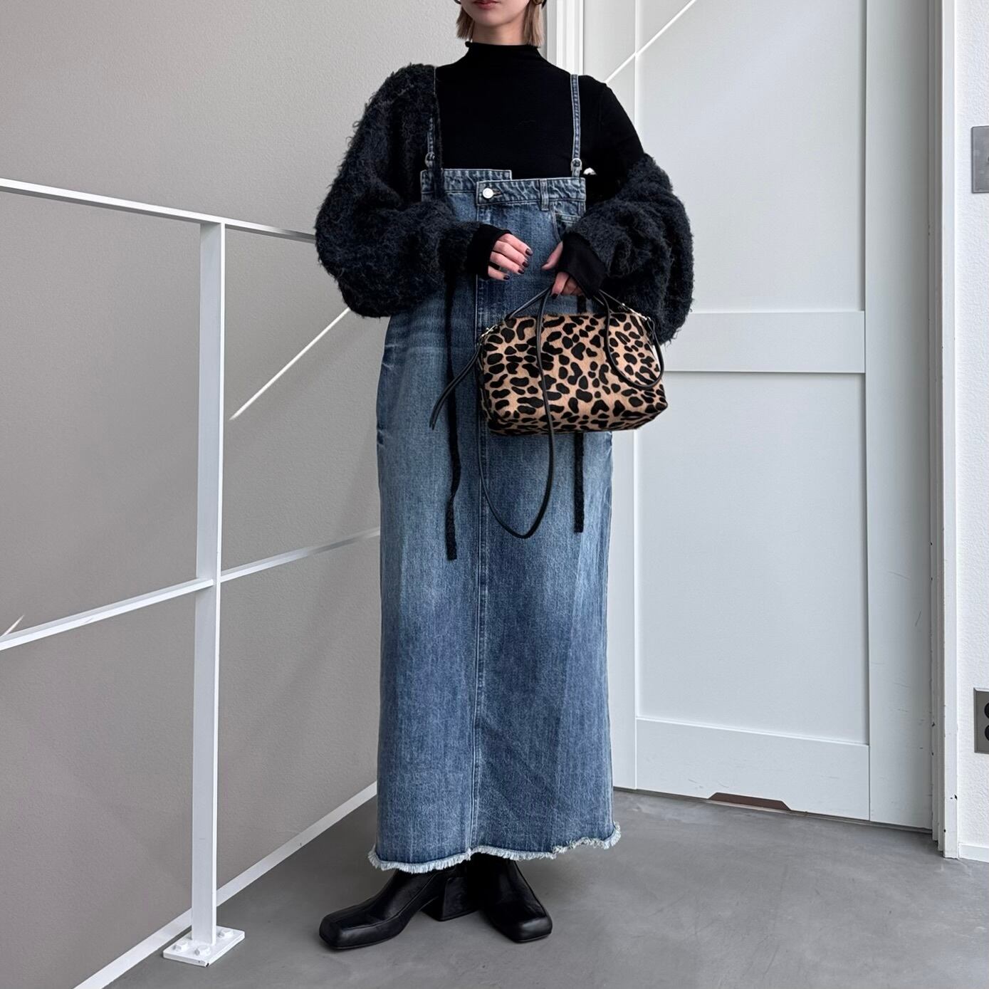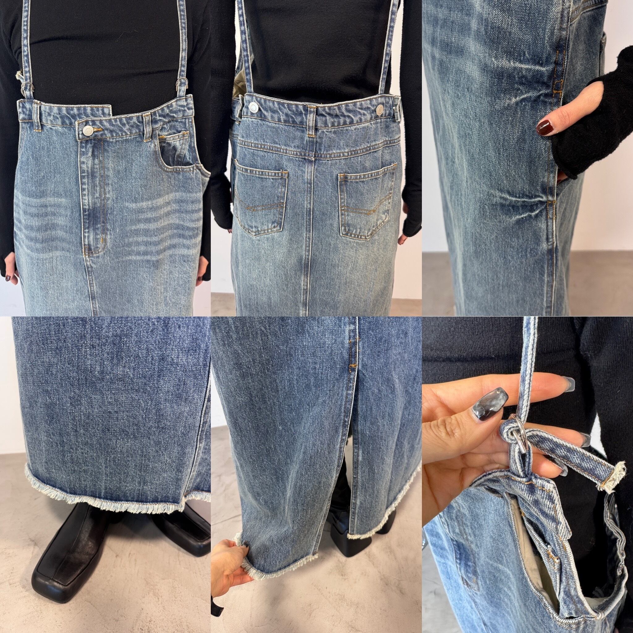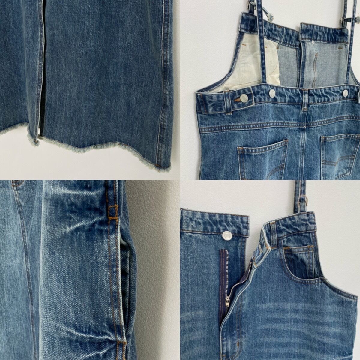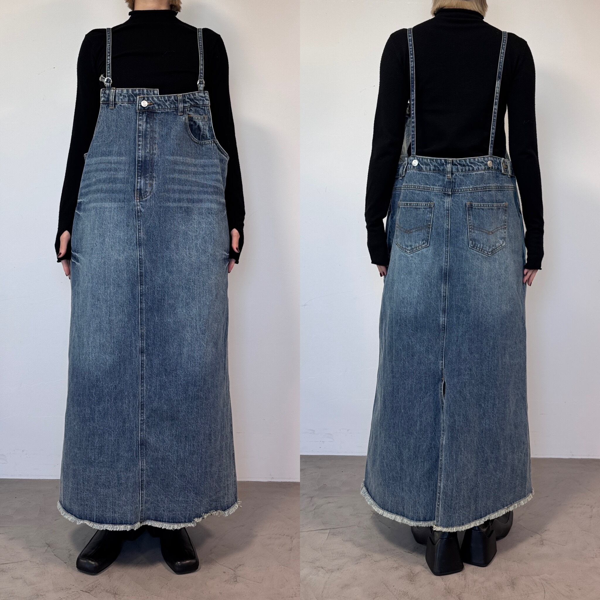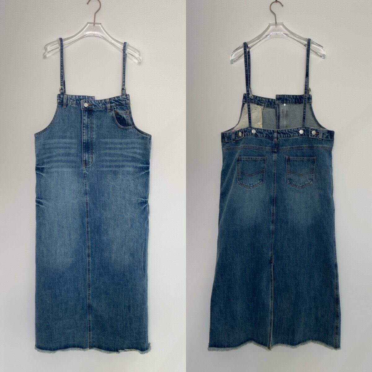 胸元がデニムパンツのウエストのようなデザインでアクセントのあるジャンパースカート。お手持ちのインナーに合わせてさっと着るだけで今どきのデニムコーデが完成。後ろ裾にスリットが入っていて動きやすさは抜群。シルエットはタブで調節できるのでゆったりめにも少しタイトめにも着用できます。裾がフリンジデザインになっていてデニムならではのデザインを楽しめます。肩紐調節可です。