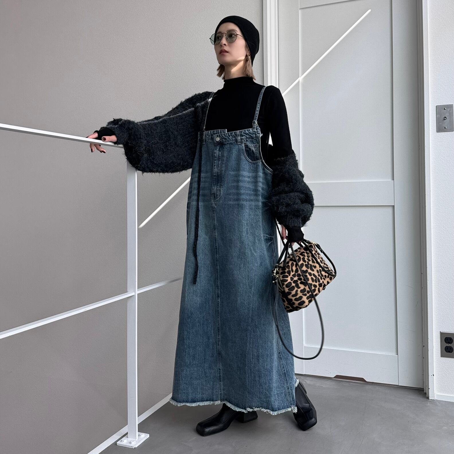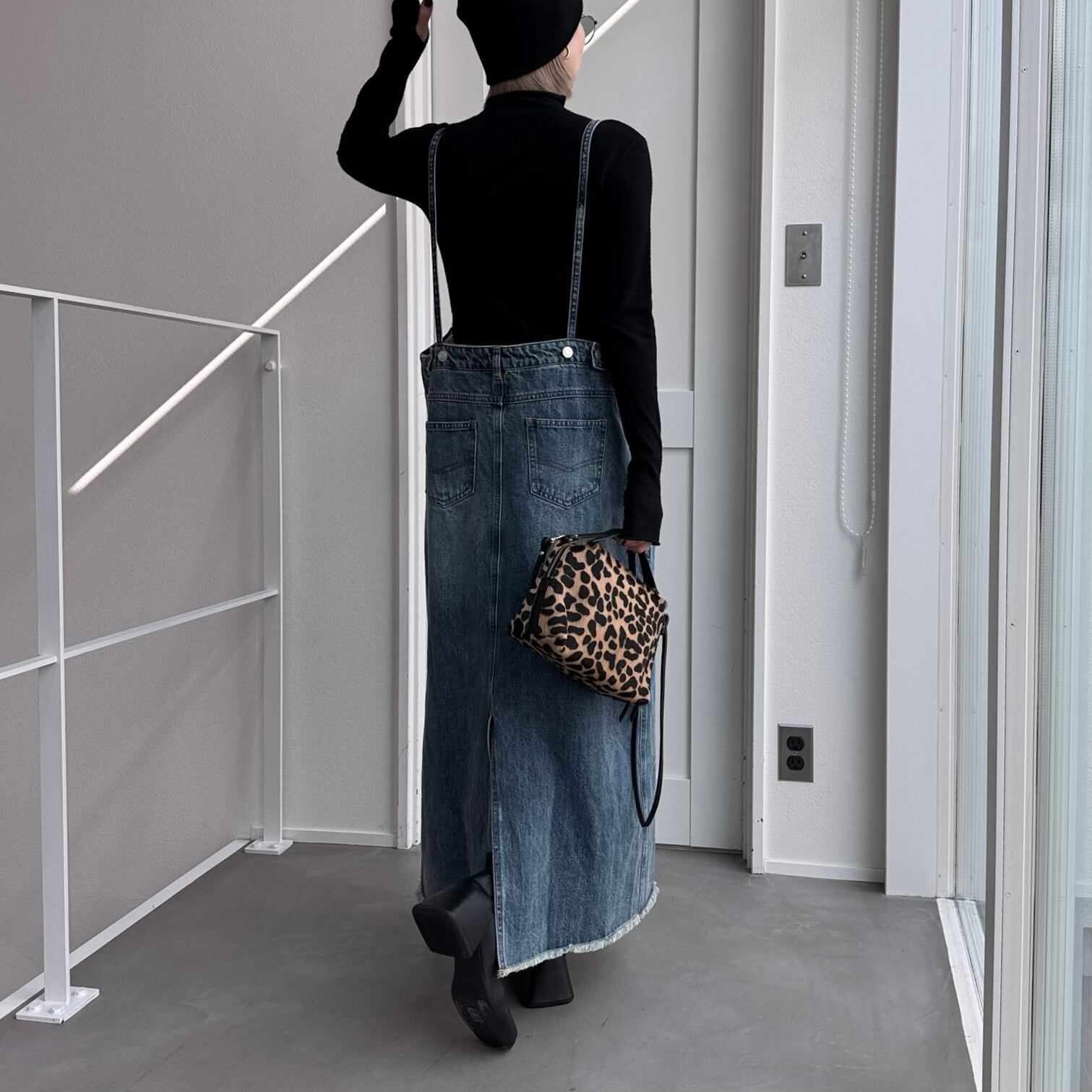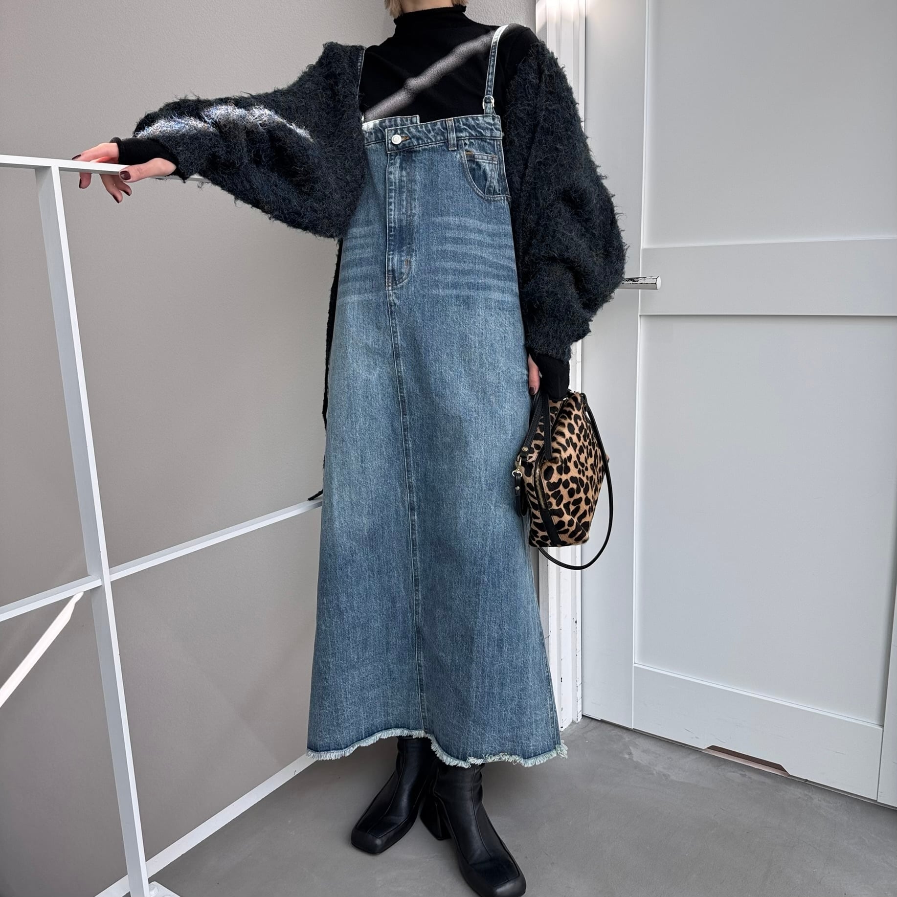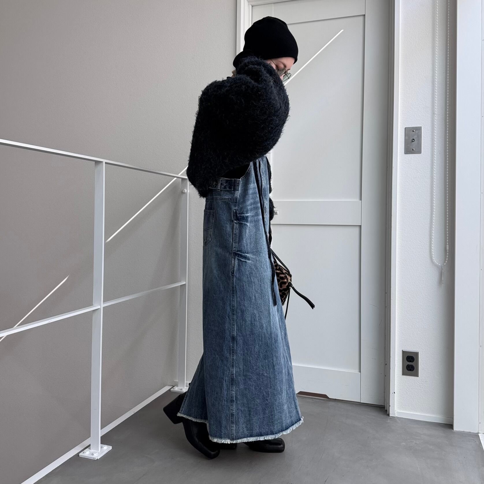 胸元がデニムパンツのウエストのようなデザインでアクセントのあるジャンパースカート。お手持ちのインナーに合わせてさっと着るだけで今どきのデニムコーデが完成。後ろ裾にスリットが入っていて動きやすさは抜群。シルエットはタブで調節できるのでゆったりめにも少しタイトめにも着用できます。裾がフリンジデザインになっていてデニムならではのデザインを楽しめます。肩紐調節可です。