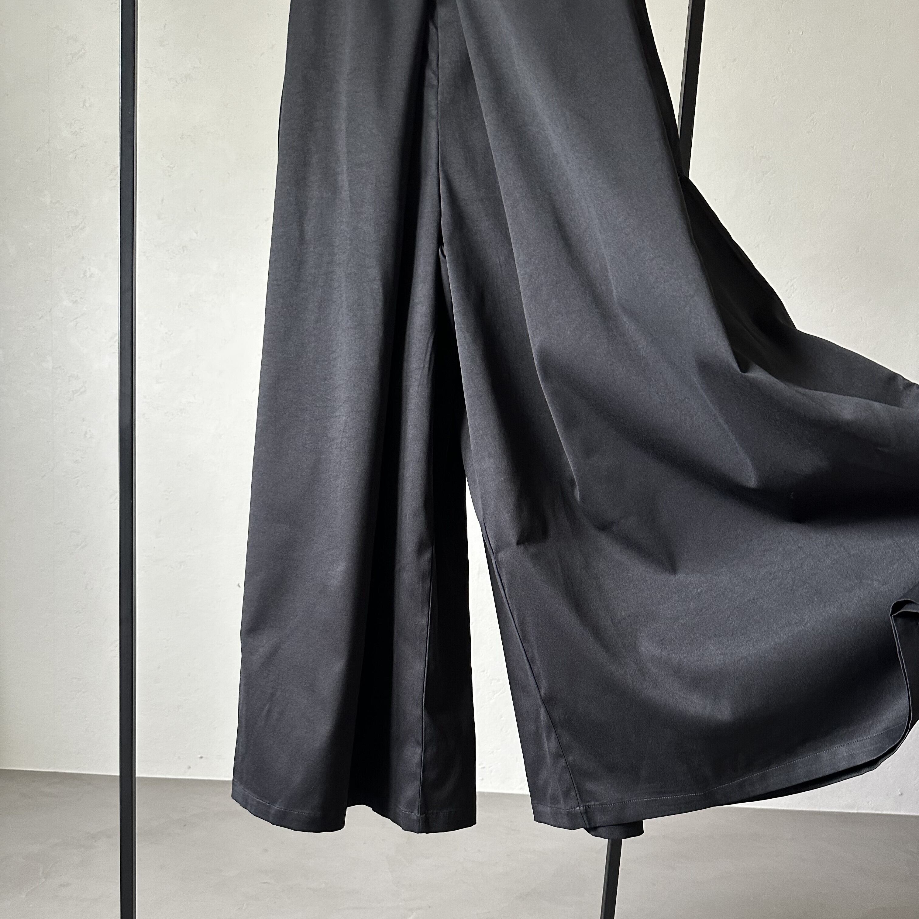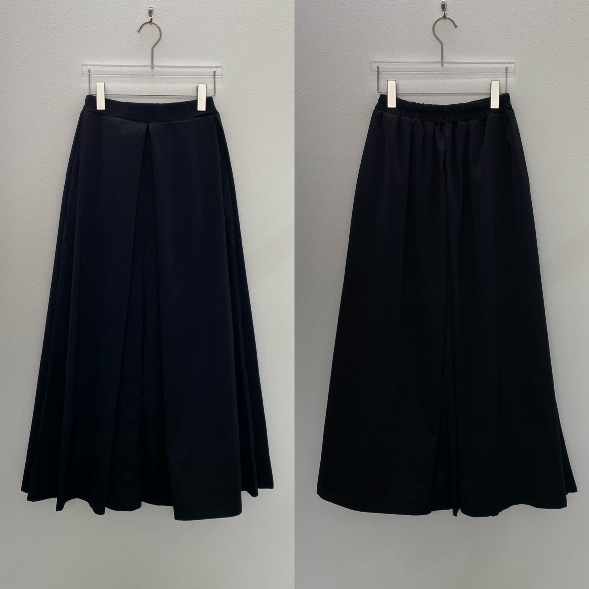 履くとまるでスカートのようなシルエットのスカンツワイドパンツ。深いインタックを前後、両サイドに施すことによりAラインに広がるシルエットに。腰回りにたっぷりのタックが入っているのでカバーしつつスッキリとした印象を与えます。ウエストは後ろゴムなのでストレスフリーな着心地です。