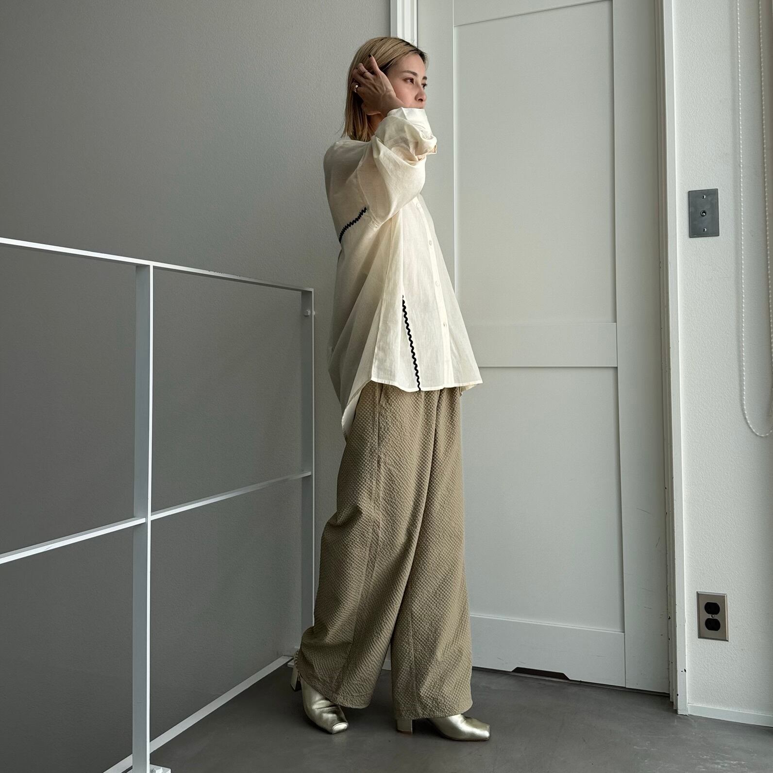 表情のあるポコポコ生地のドロストパンツ。凹凸のある生地を使用しており肌触りもよく、軽い生地感なのでストレスフリーに着用頂けます。さりげないチェック柄もポイントに。腰回りにはタックが入っているので腰回りもカバーしてくれます。ウエストゴムなのでリラクシーな着心地のうえ、裾のドロストでバランスを変えても◎