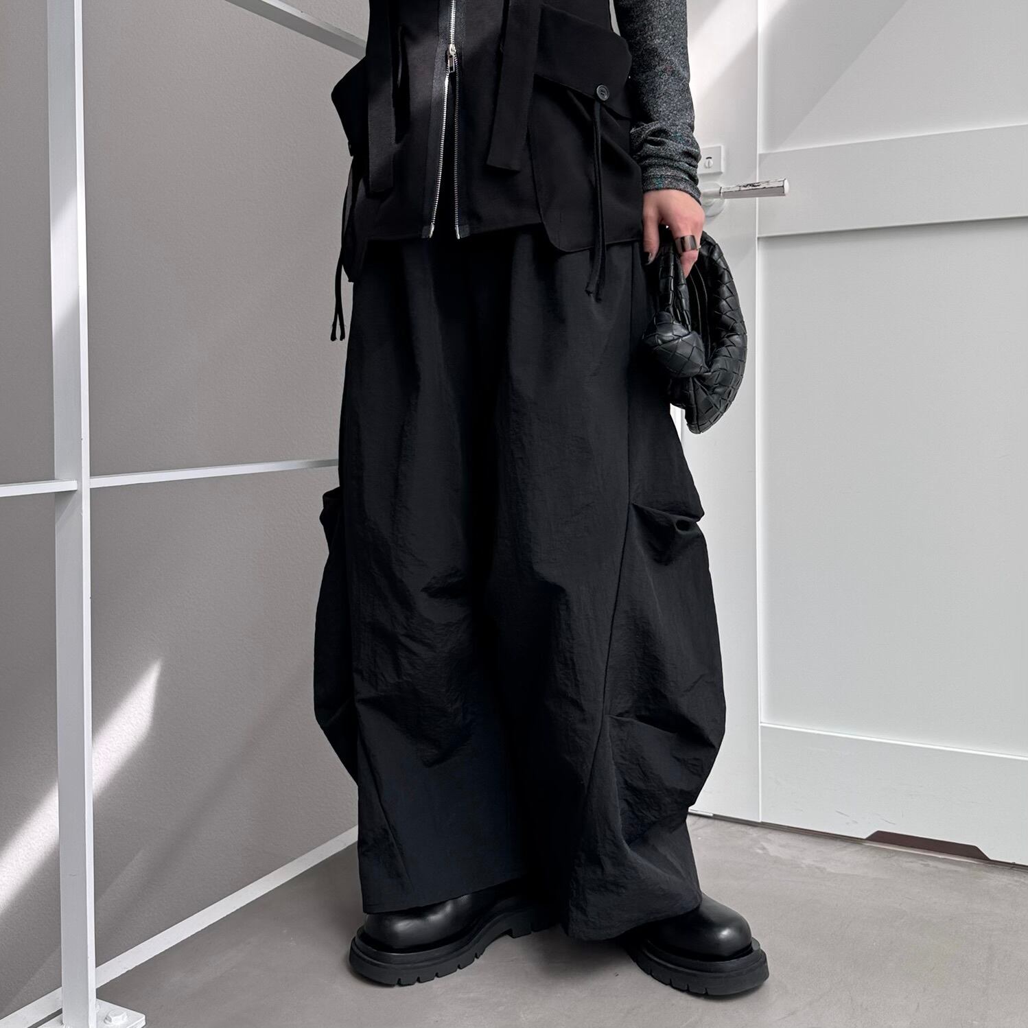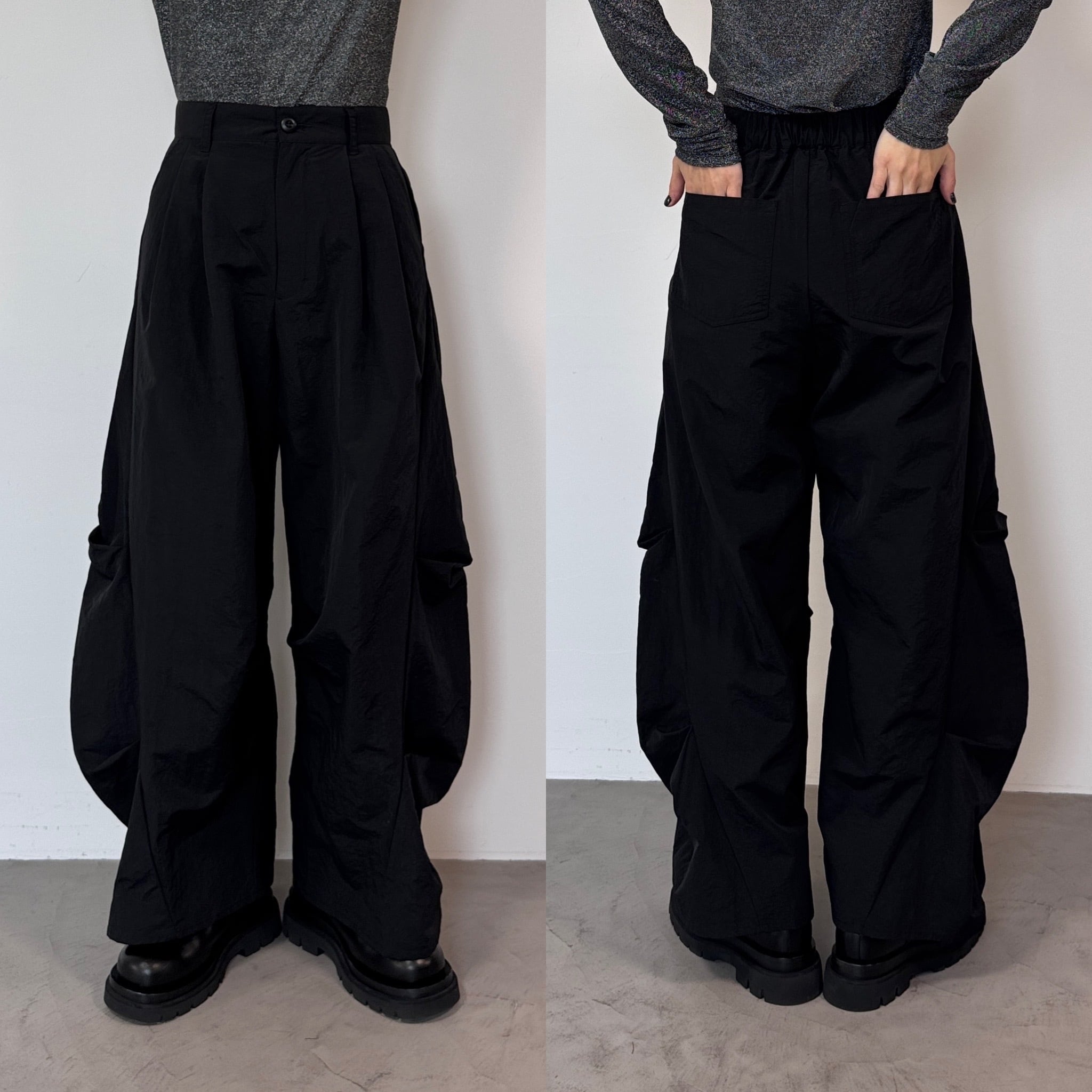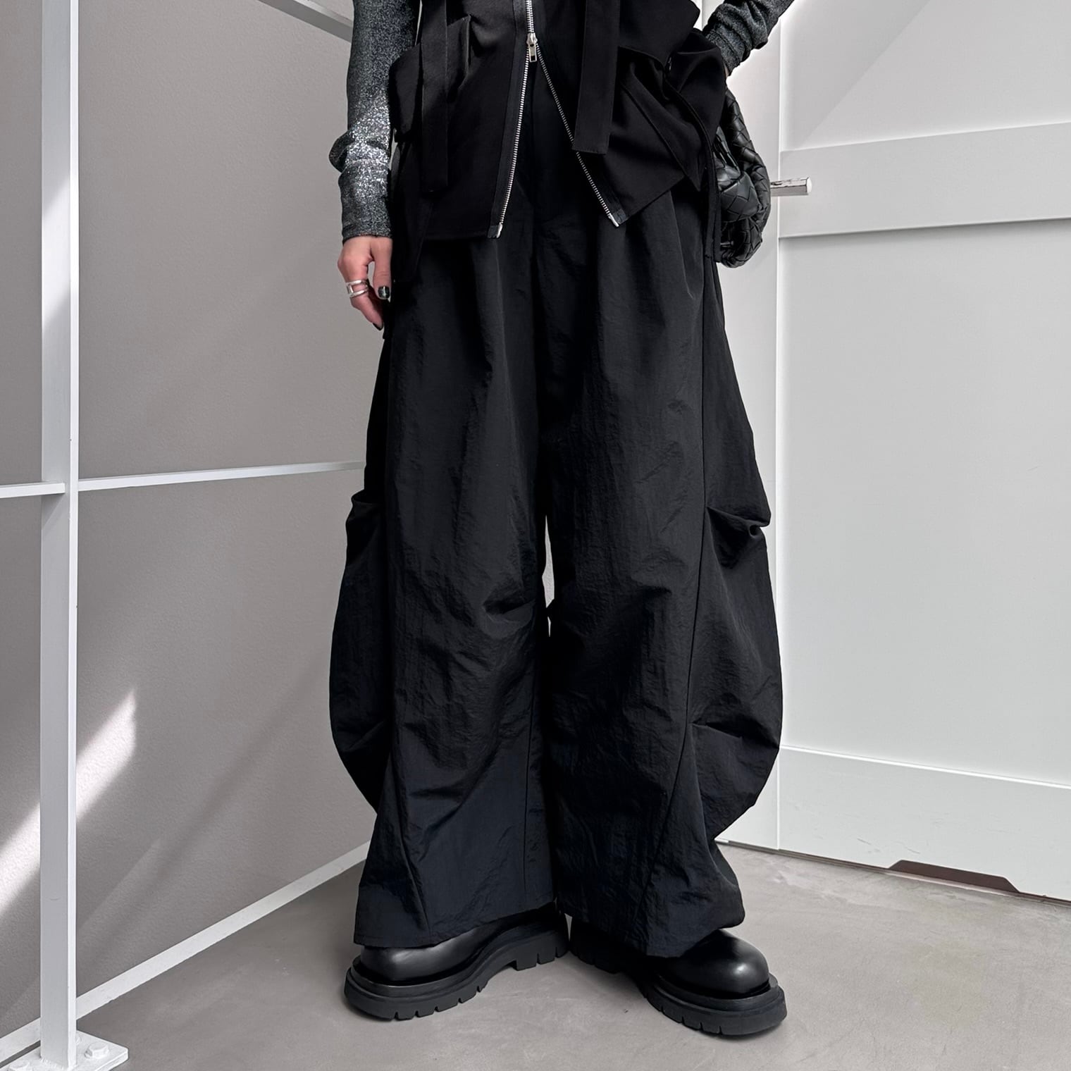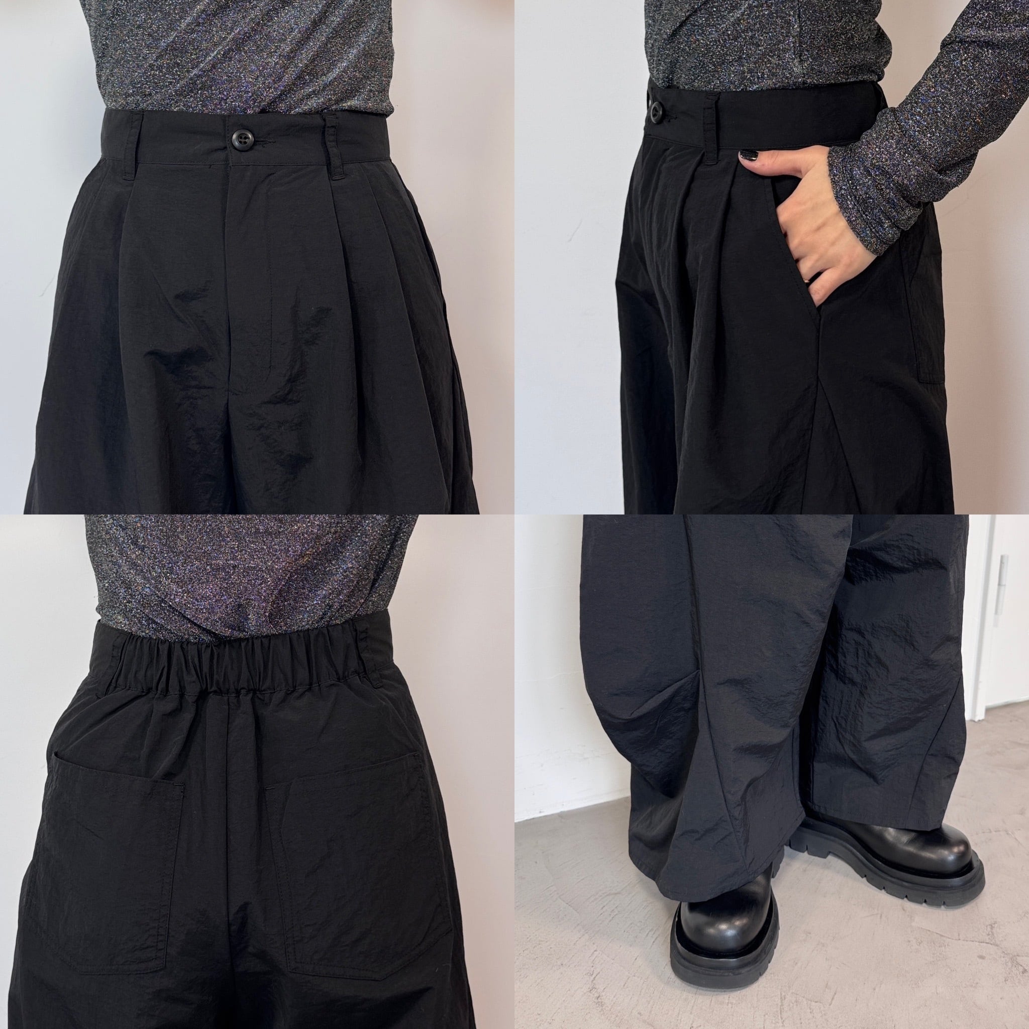 春夏に適したさらっとしたナイロンタフタ素材バレルシルエットパンツ。両サイドのタックで、立体感のあるコクーンのようなシルエットをつくり、柔らかな印象に。ゆったりワイド幅で下半身をしっかりカバー。存在感のあるシルエットとシンプルなデザインは様々なアイテムと相性が良く、幅広いスタイリングに対応可能です。ベーシックなトップスはもちろんの事、ワイドシルエットを活かしたモードテイストのアイテムとの相性も良い1着です。