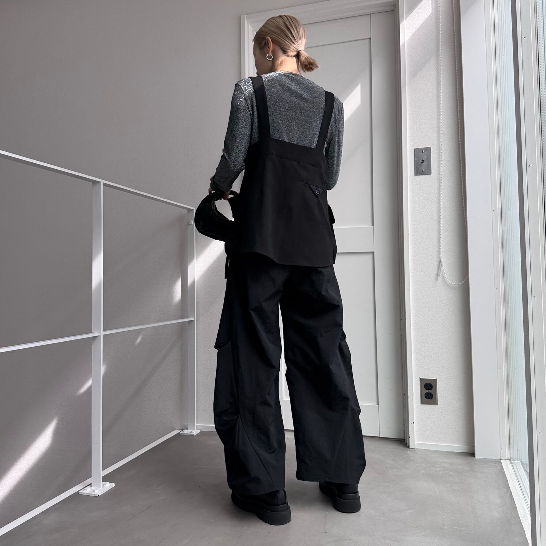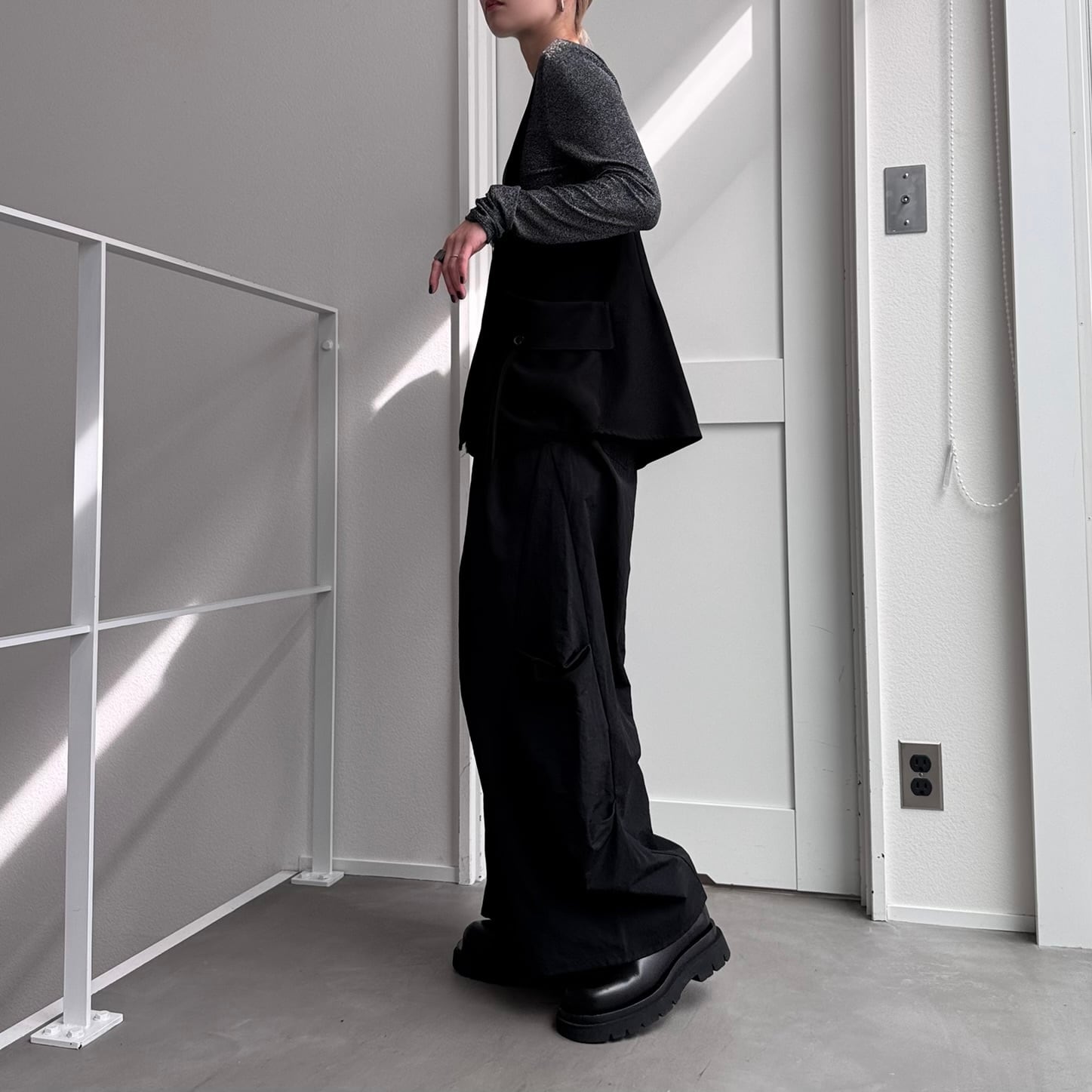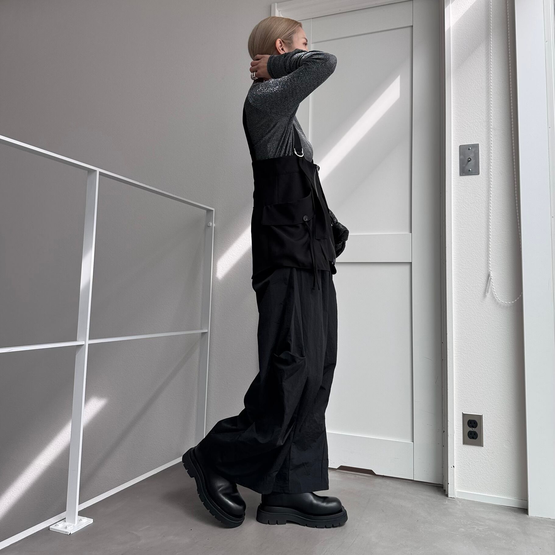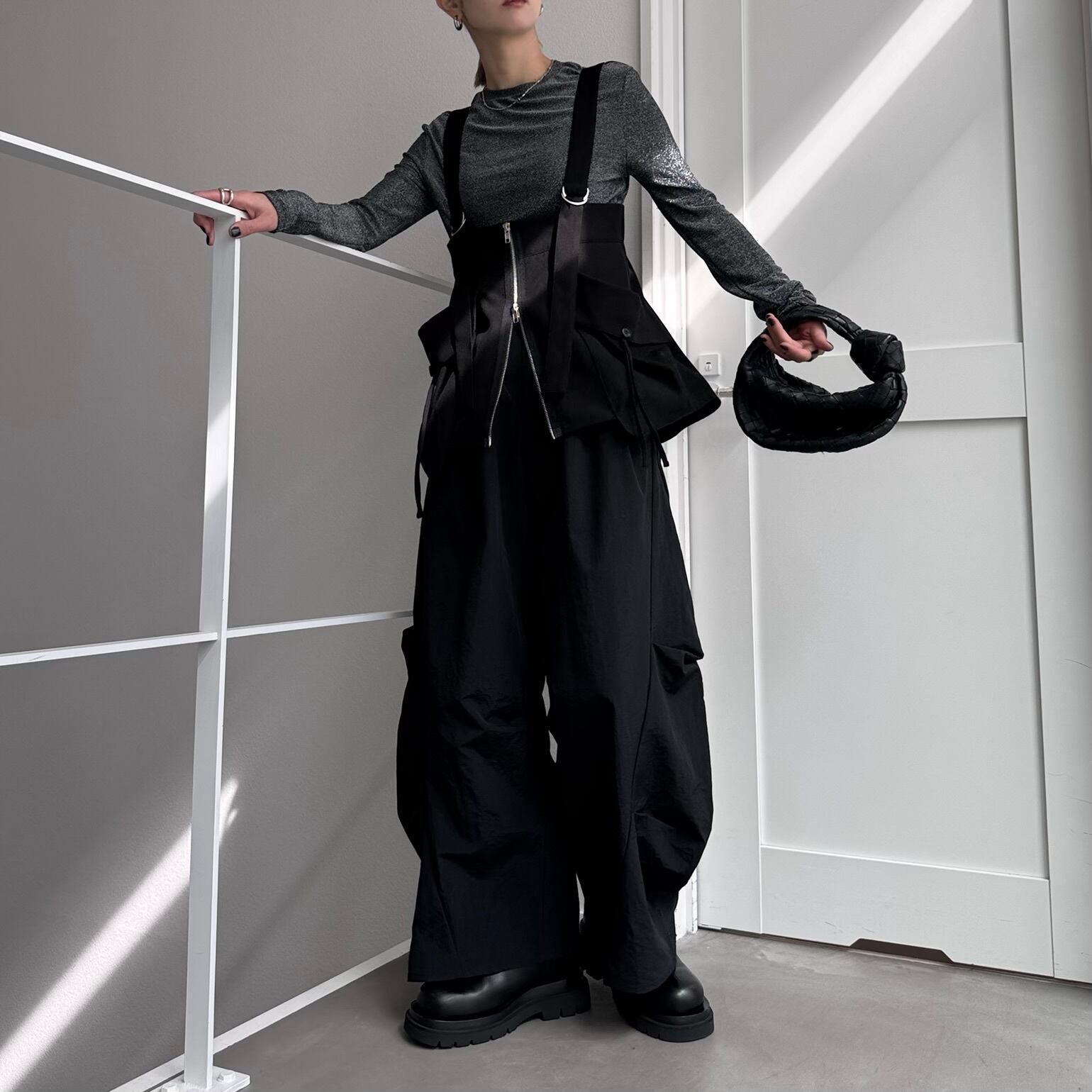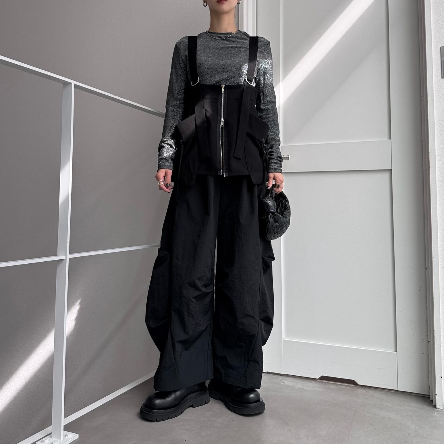 春夏に適したさらっとしたナイロンタフタ素材バレルシルエットパンツ。両サイドのタックで、立体感のあるコクーンのようなシルエットをつくり、柔らかな印象に。ゆったりワイド幅で下半身をしっかりカバー。存在感のあるシルエットとシンプルなデザインは様々なアイテムと相性が良く、幅広いスタイリングに対応可能です。ベーシックなトップスはもちろんの事、ワイドシルエットを活かしたモードテイストのアイテムとの相性も良い1着です。