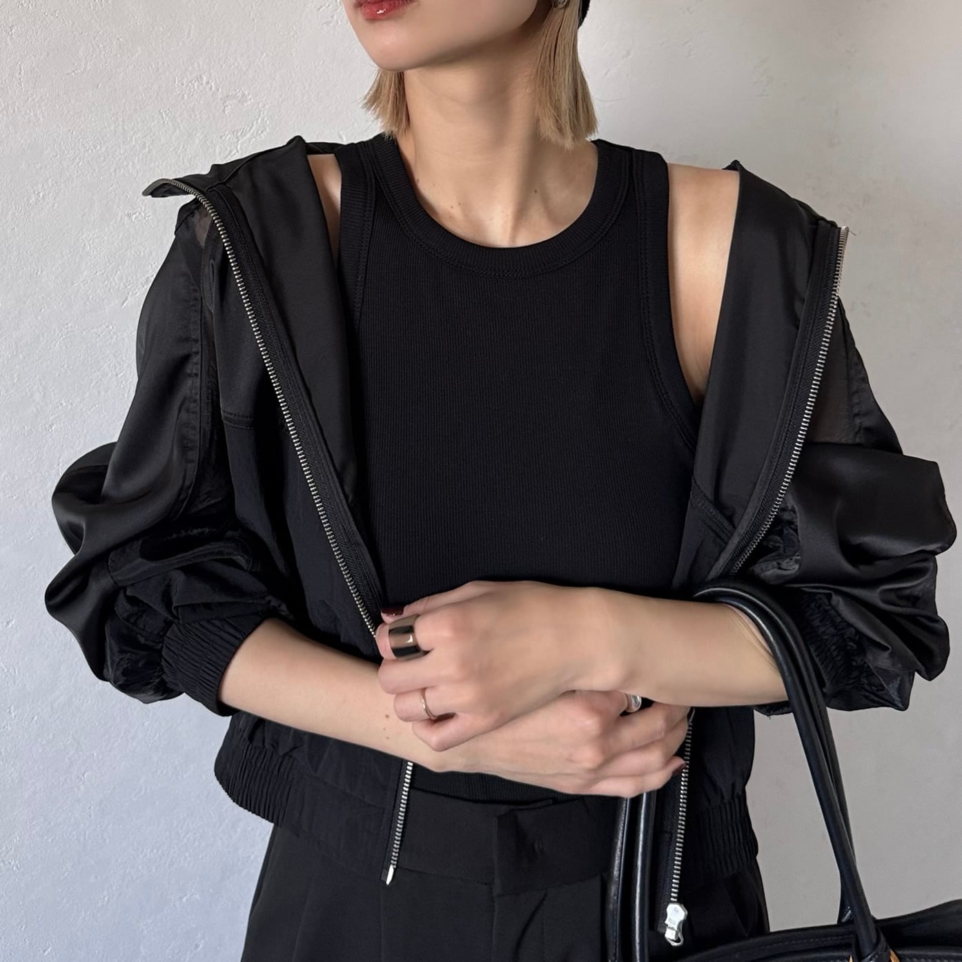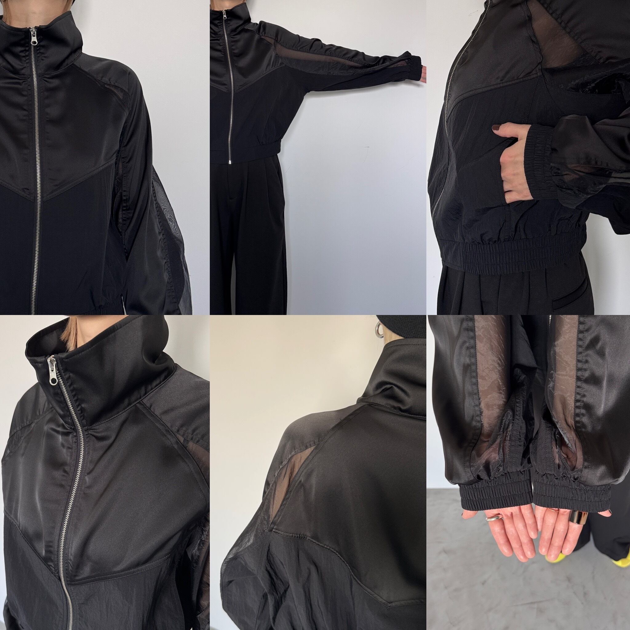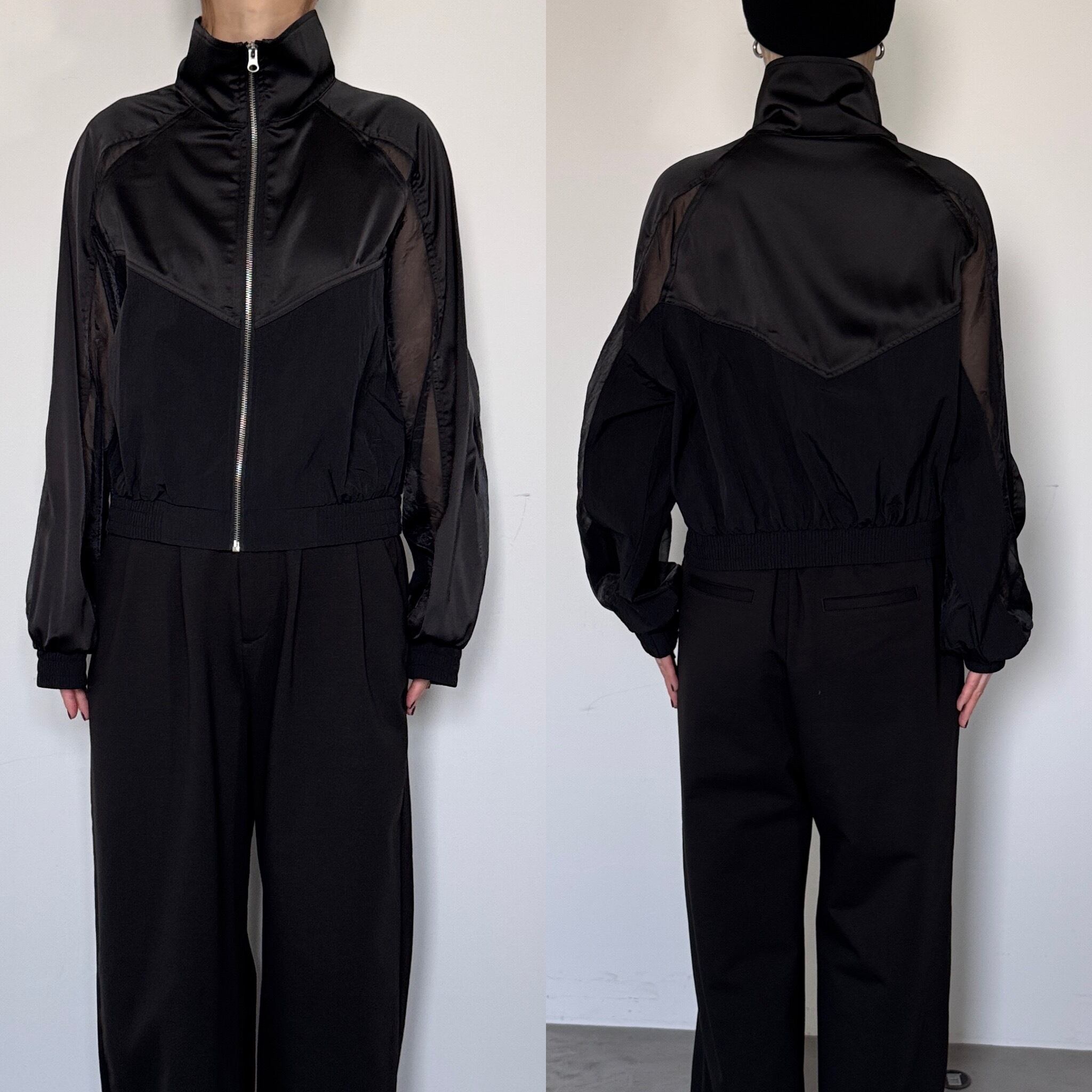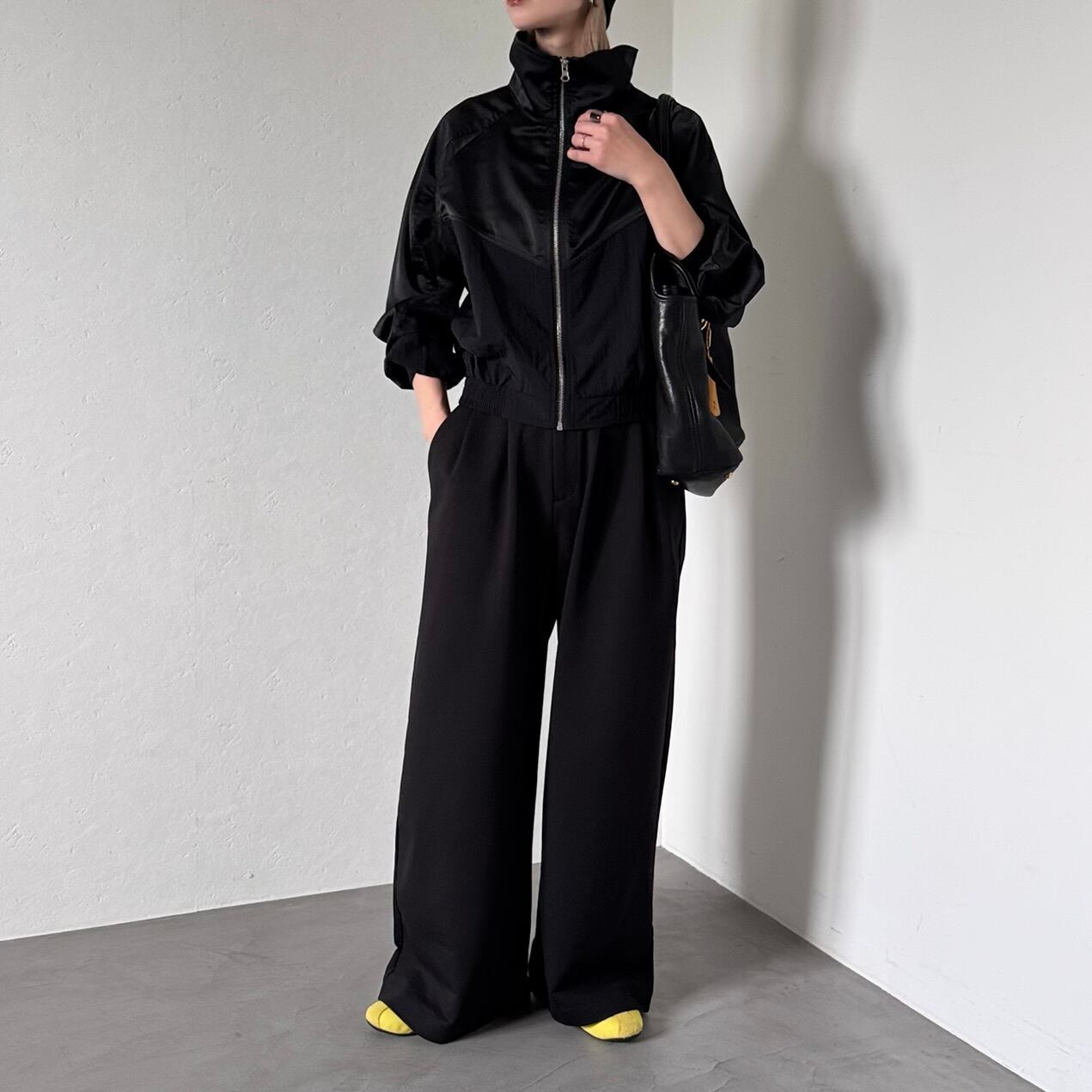 様々な素材を組み合わせたジップブルゾン。身頃はサテン生地、タフタ生地を使用し、袖の一部はオーガンジーの切替デザイン。異なる質感の組み合わせがコーディネートに奥行きを与えた一着。ゆったりとした身幅とドロップショルダーが、リラックス感のある着心地と抜け感をプラスします。ジップを途中まで開けて襟元を抜き、ゆったりとしたシルエットで着こなすと、よりこなれた印象になります。