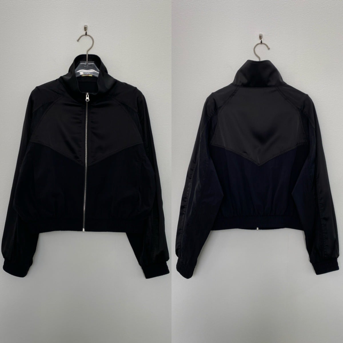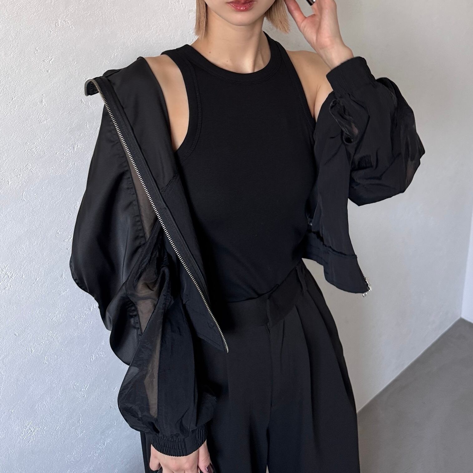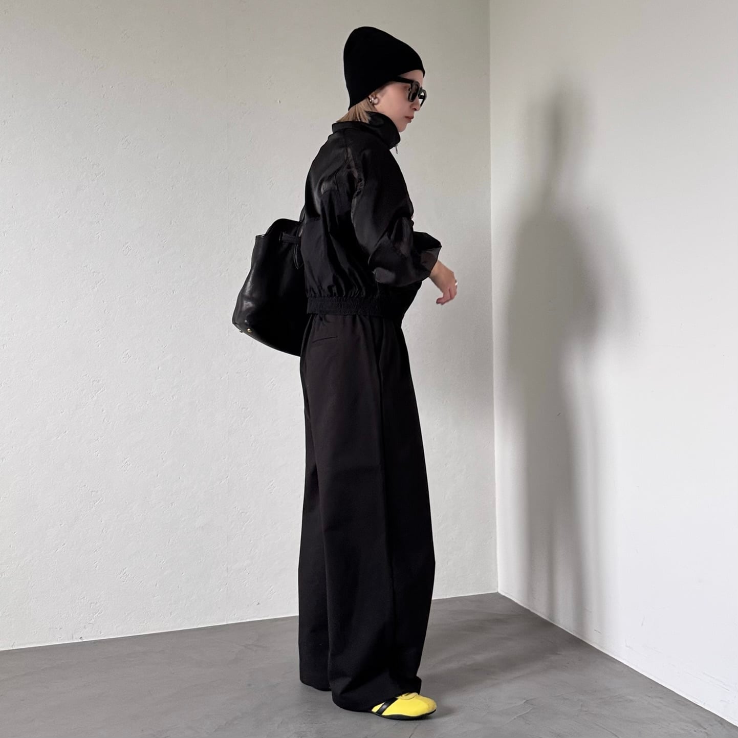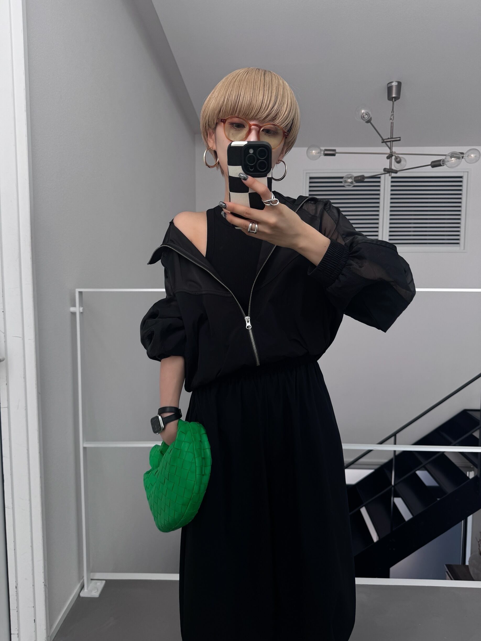 様々な素材を組み合わせたジップブルゾン。身頃はサテン生地、タフタ生地を使用し、袖の一部はオーガンジーの切替デザイン。異なる質感の組み合わせがコーディネートに奥行きを与えた一着。ゆったりとした身幅とドロップショルダーが、リラックス感のある着心地と抜け感をプラスします。ジップを途中まで開けて襟元を抜き、ゆったりとしたシルエットで着こなすと、よりこなれた印象になります。