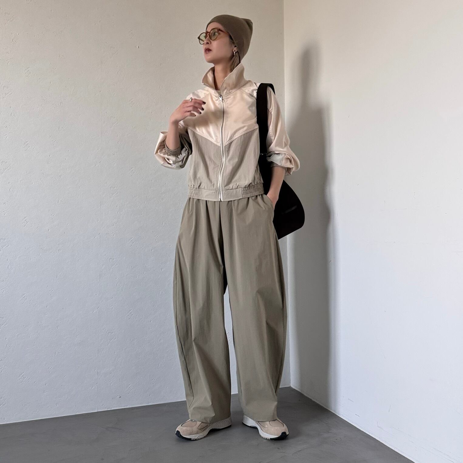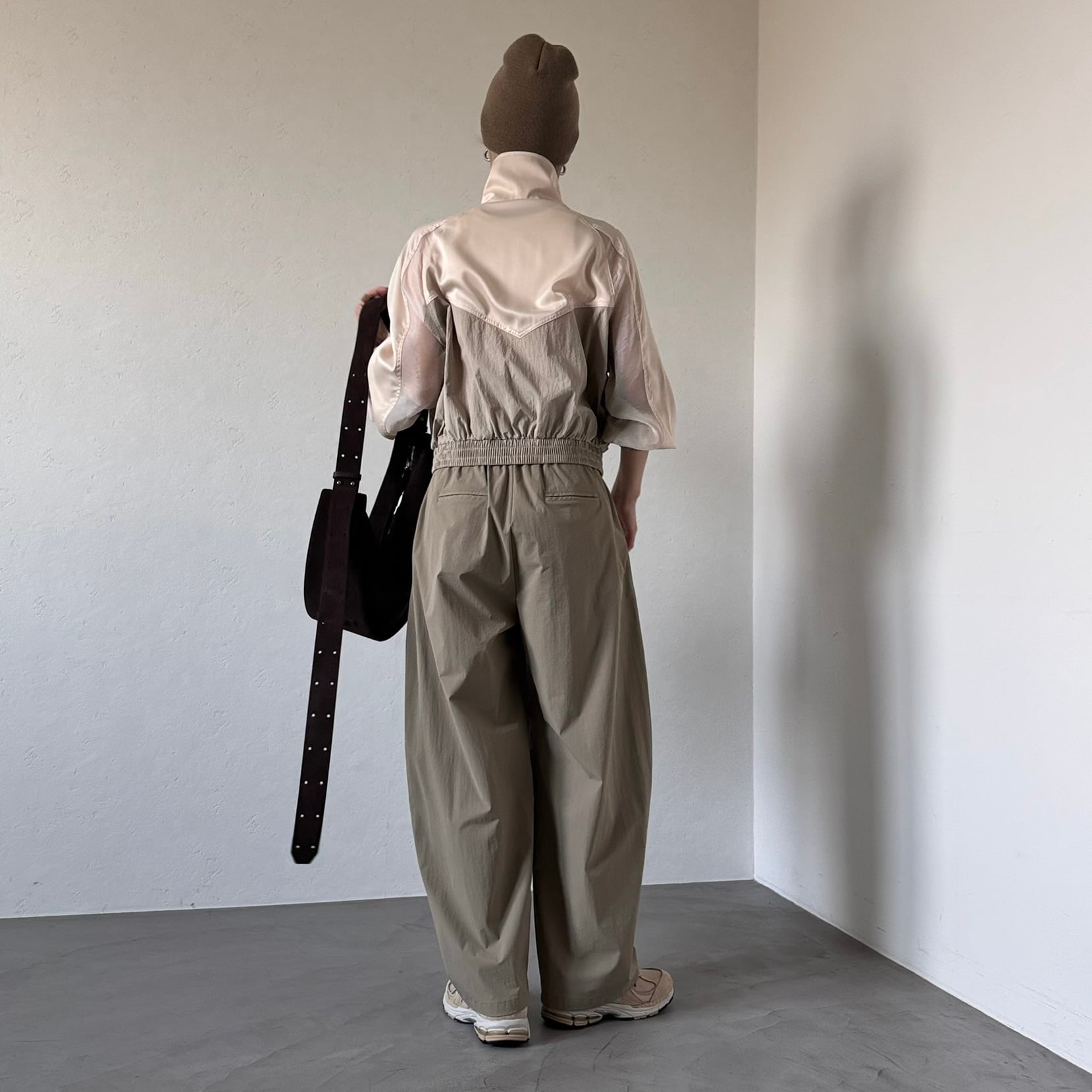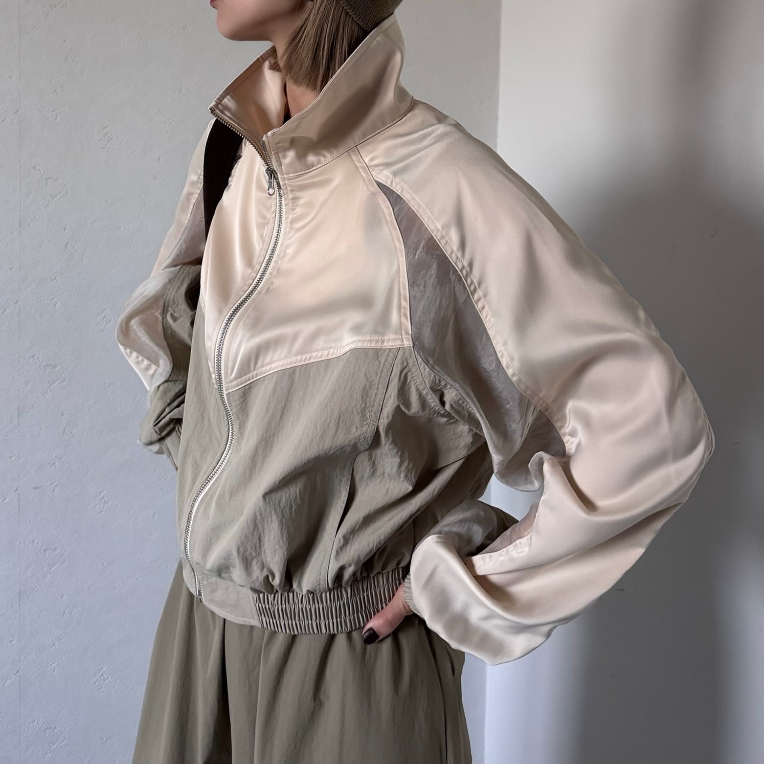 様々な素材を組み合わせたジップブルゾン。身頃はサテン生地、タフタ生地を使用し、袖の一部はオーガンジーの切替デザイン。異なる質感の組み合わせがコーディネートに奥行きを与えた一着。ゆったりとした身幅とドロップショルダーが、リラックス感のある着心地と抜け感をプラスします。ジップを途中まで開けて襟元を抜き、ゆったりとしたシルエットで着こなすと、よりこなれた印象になります。
