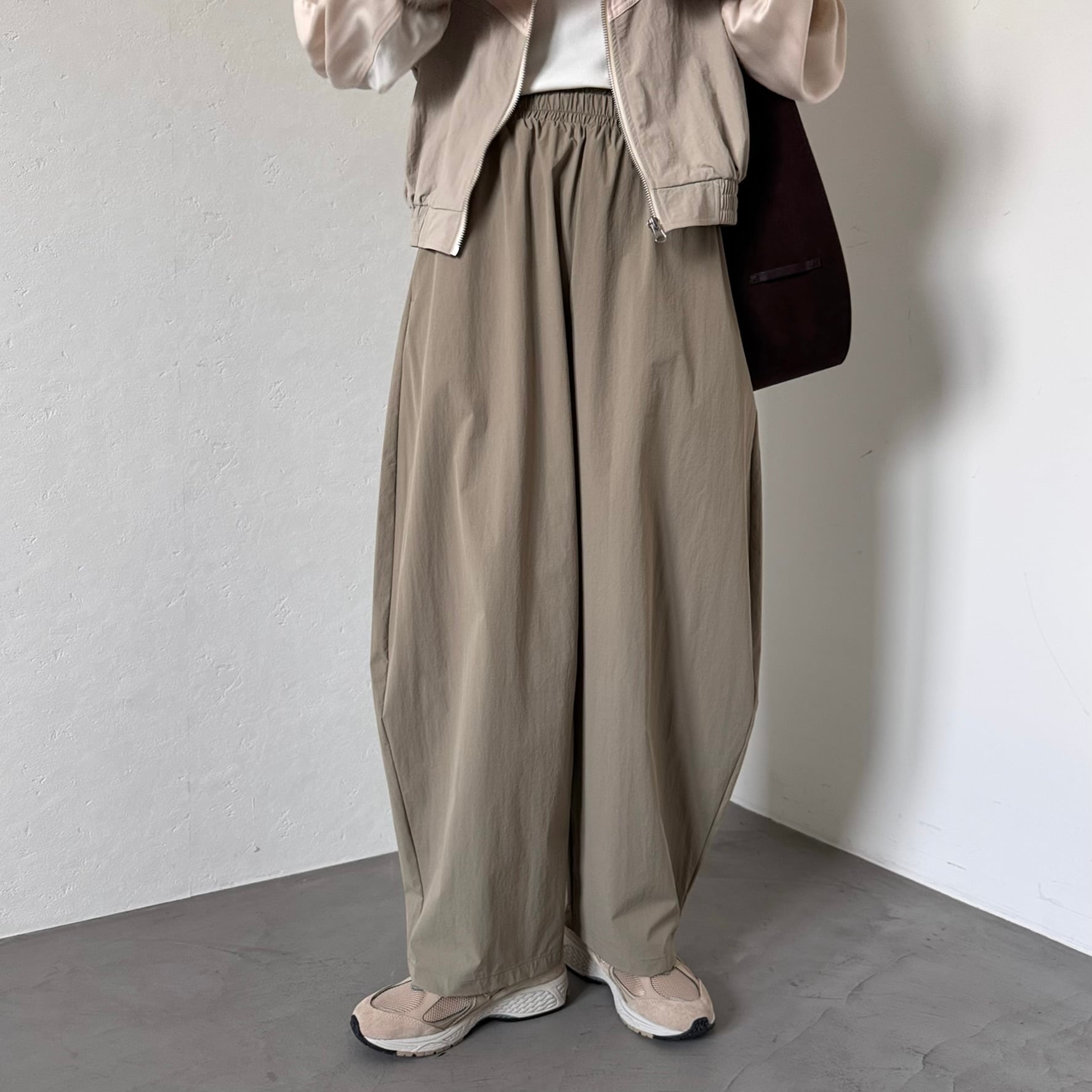 深めのタックと裾に向かって細くなるシルエットが特徴的なコクーンシルエットのパンツ。接触冷感なのでさらっと着用いただけます。丸みのあるフォルムが気になるヒップや太もも周りを自然にカバーし、リラックス感とスタイルアップを両立します。ウエストゴムながらも、タックインスタイルもきれいに決まる仕様で、トップス次第で様々なコーディネートを楽しめます。