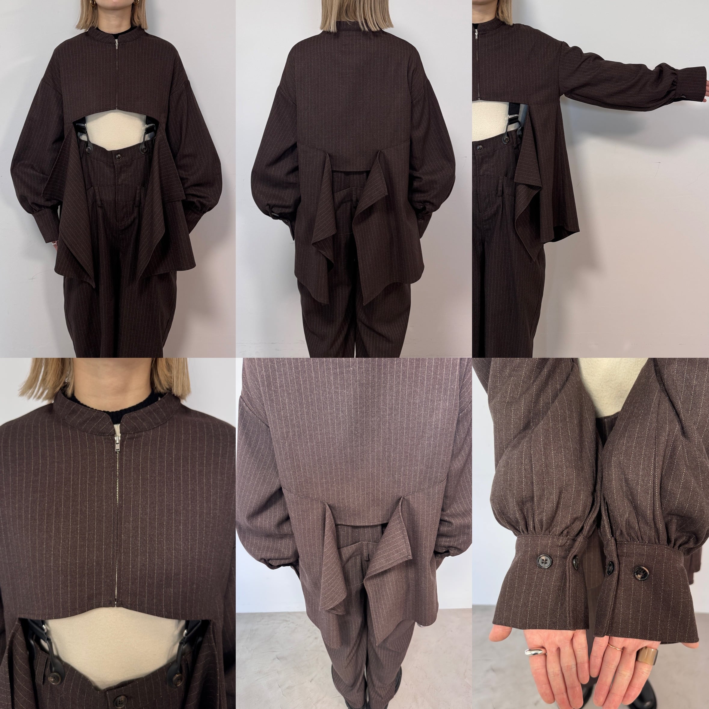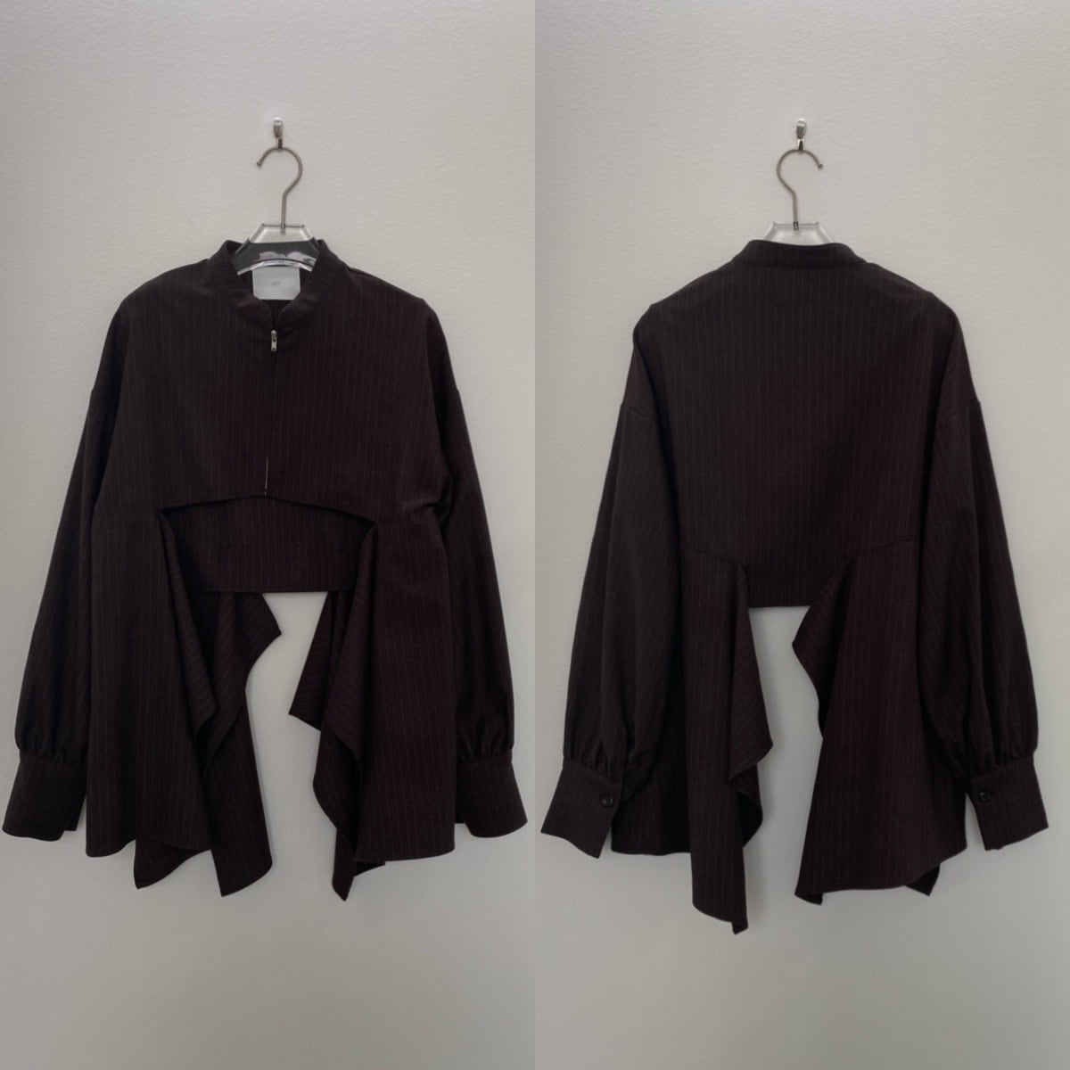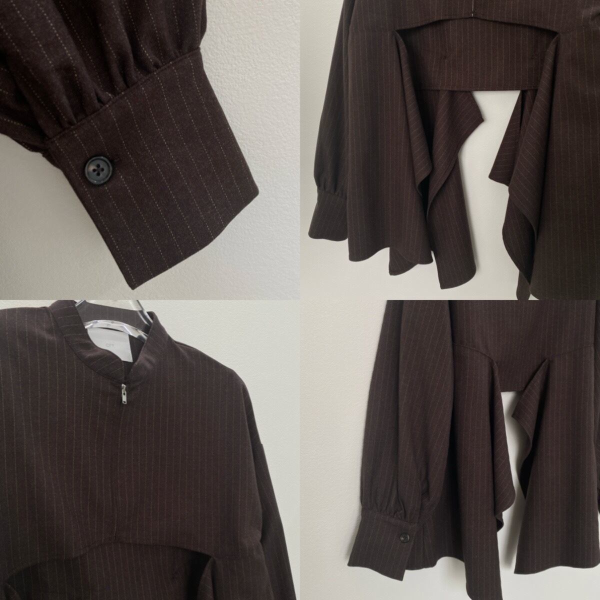 フロントとバックのドレープが目を惹くジップジャケット。ドレープ部分は腰回りを隠してくれるロング丈。きれいなドレープ感のあるシルエットなので重く見えず動きのあるデザインに。zip部分はあえて短くしているので合わせるインナーで印象が変わります。セットアップはもちろんワンピースの上やシャツ感覚で羽織っても◎オケージョンにもおすすめです。