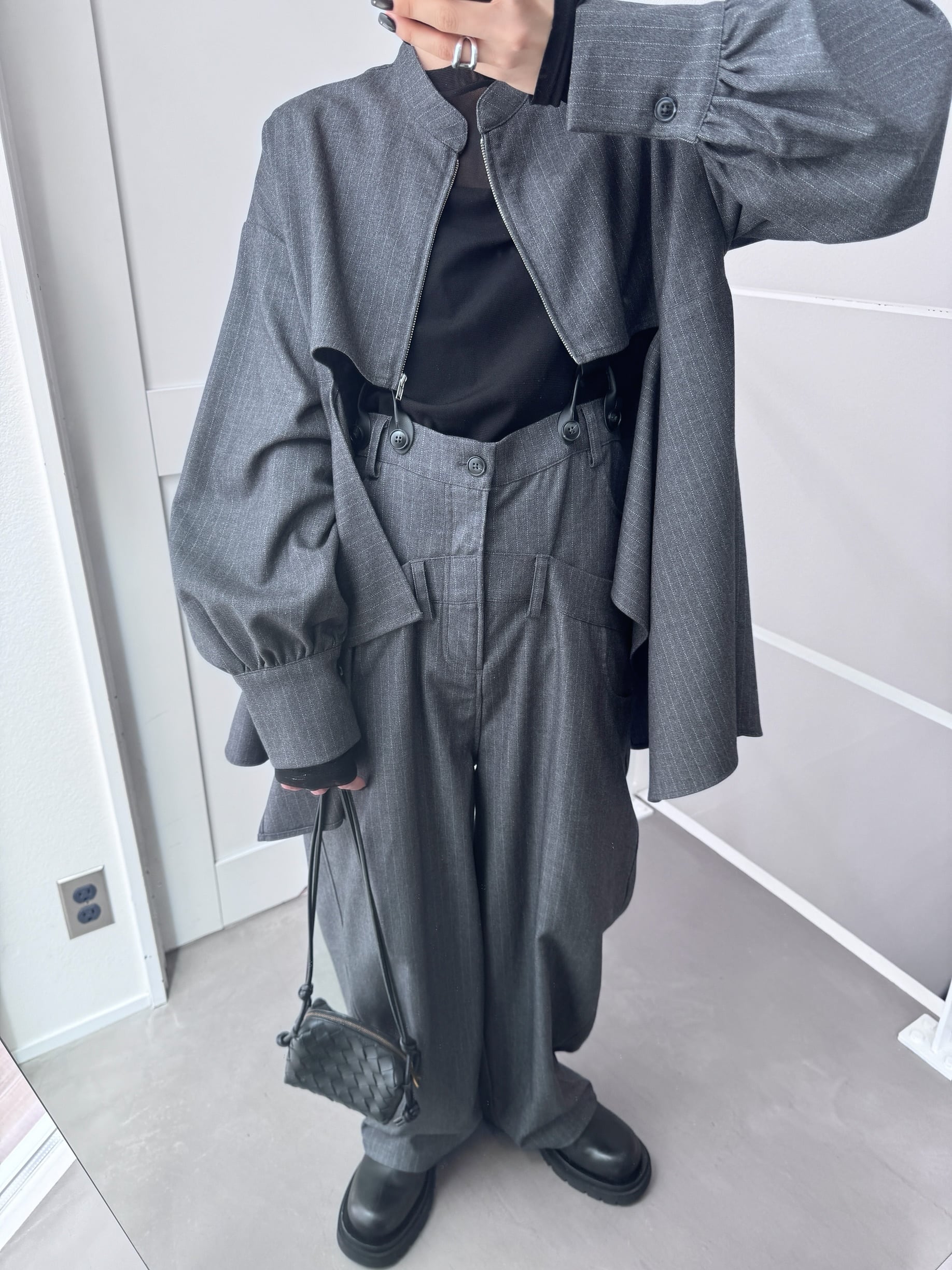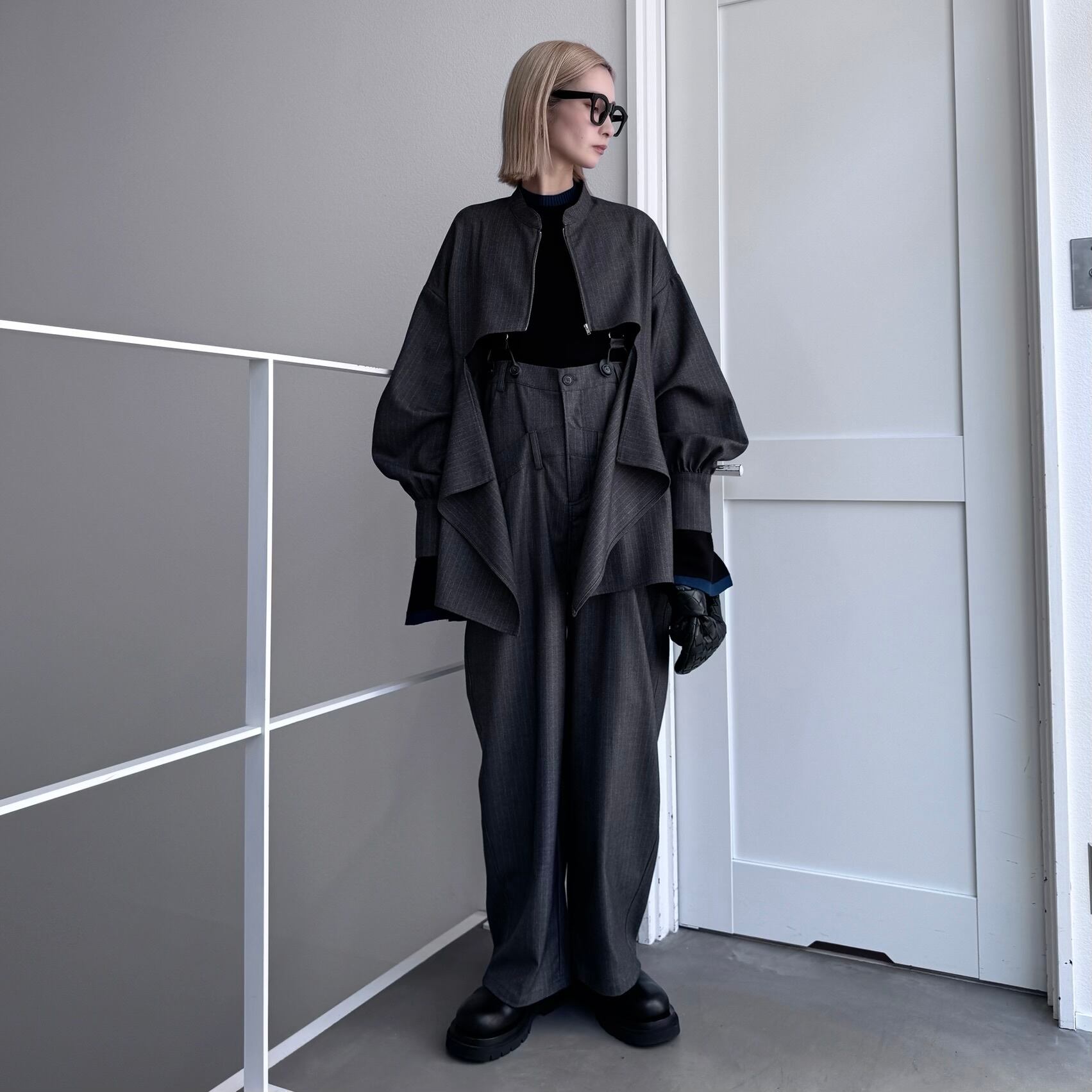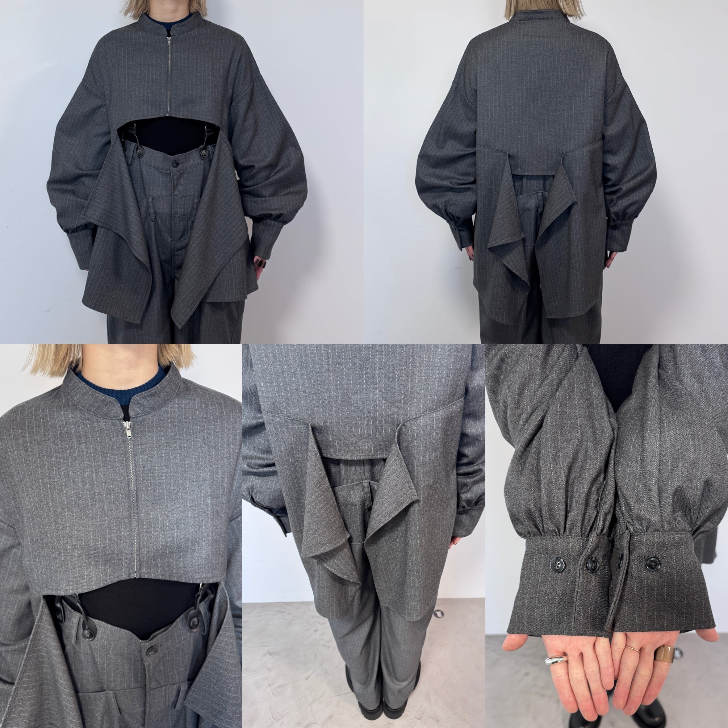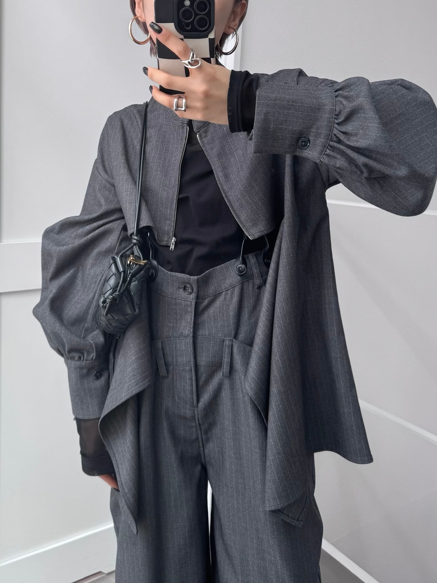 フロントとバックのドレープが目を惹くジップジャケット。ドレープ部分は腰回りを隠してくれるロング丈。きれいなドレープ感のあるシルエットなので重く見えず動きのあるデザインに。zip部分はあえて短くしているので合わせるインナーで印象が変わります。セットアップはもちろんワンピースの上やシャツ感覚で羽織っても◎オケージョンにもおすすめです。