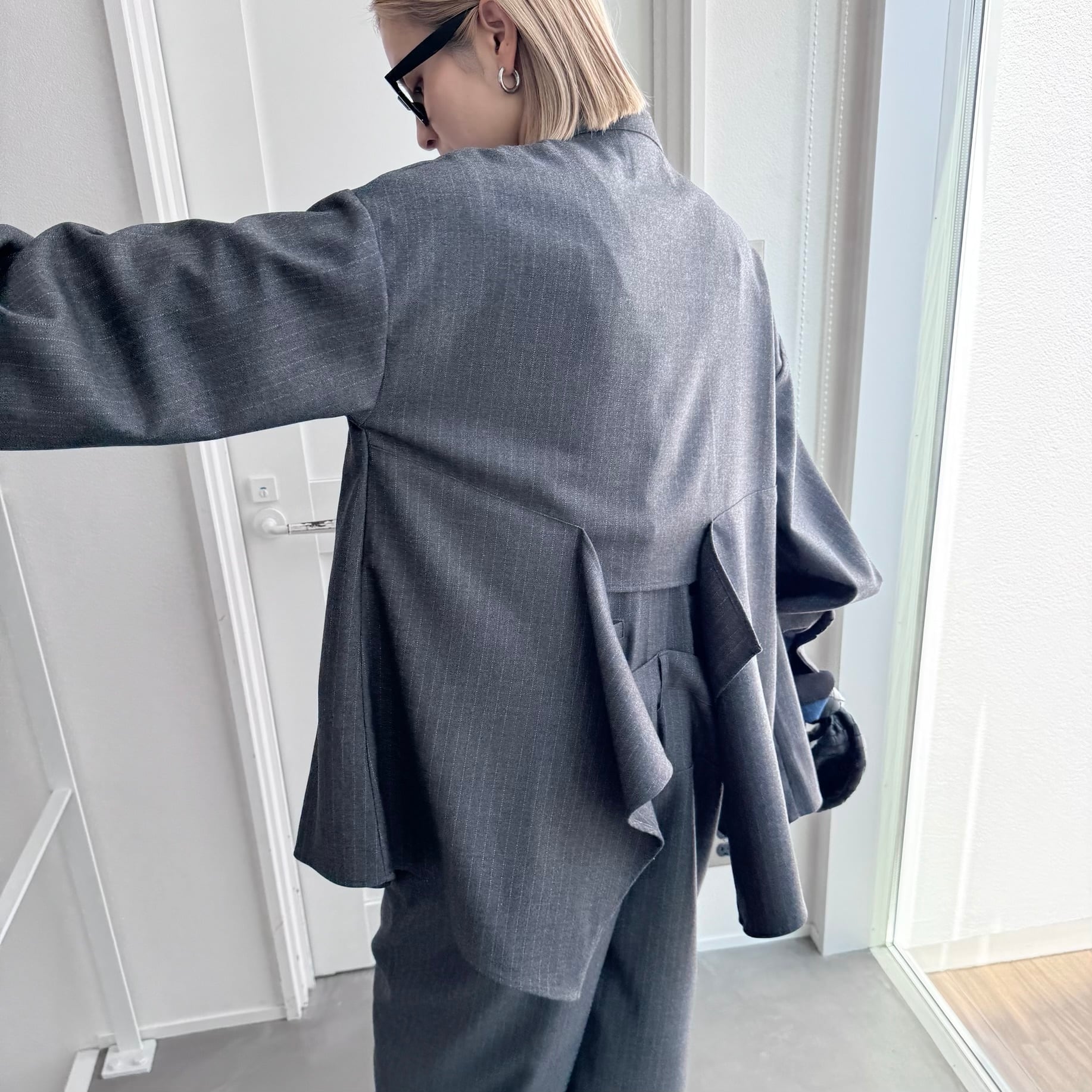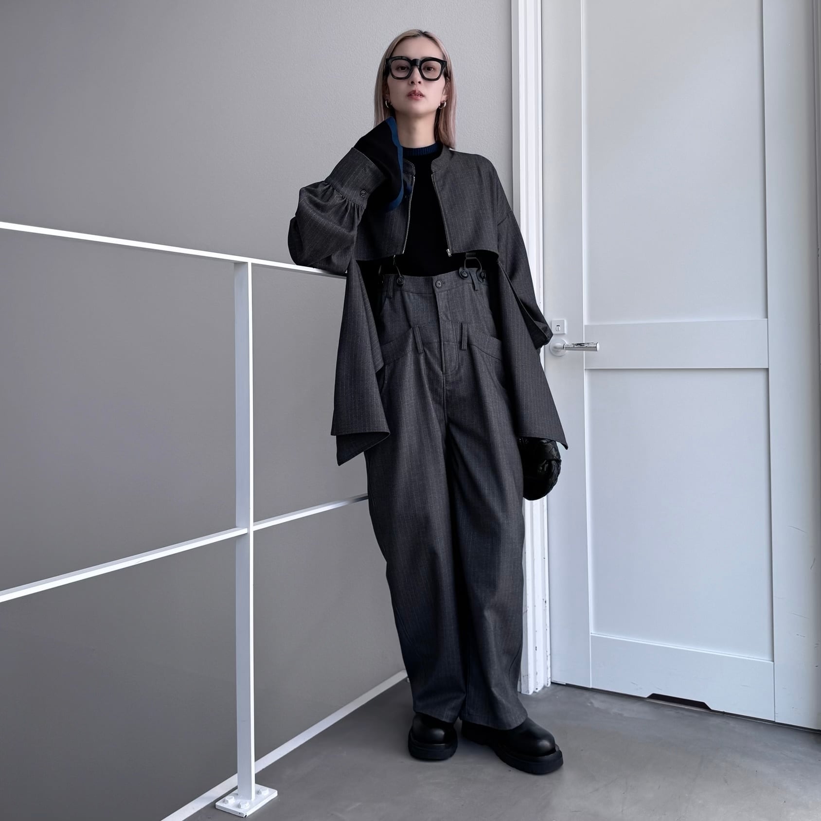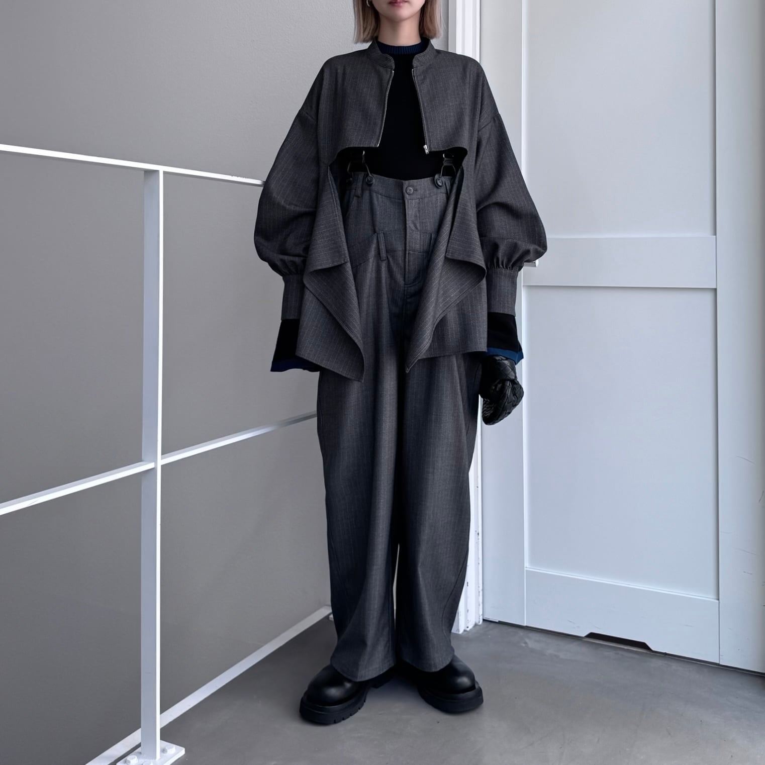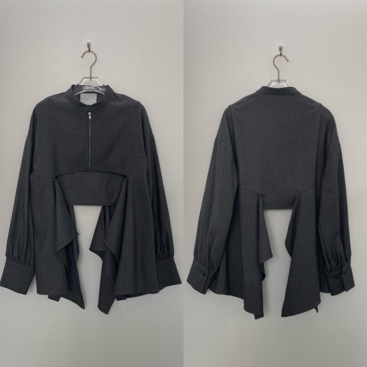 フロントとバックのドレープが目を惹くジップジャケット。ドレープ部分は腰回りを隠してくれるロング丈。きれいなドレープ感のあるシルエットなので重く見えず動きのあるデザインに。zip部分はあえて短くしているので合わせるインナーで印象が変わります。セットアップはもちろんワンピースの上やシャツ感覚で羽織っても◎オケージョンにもおすすめです。