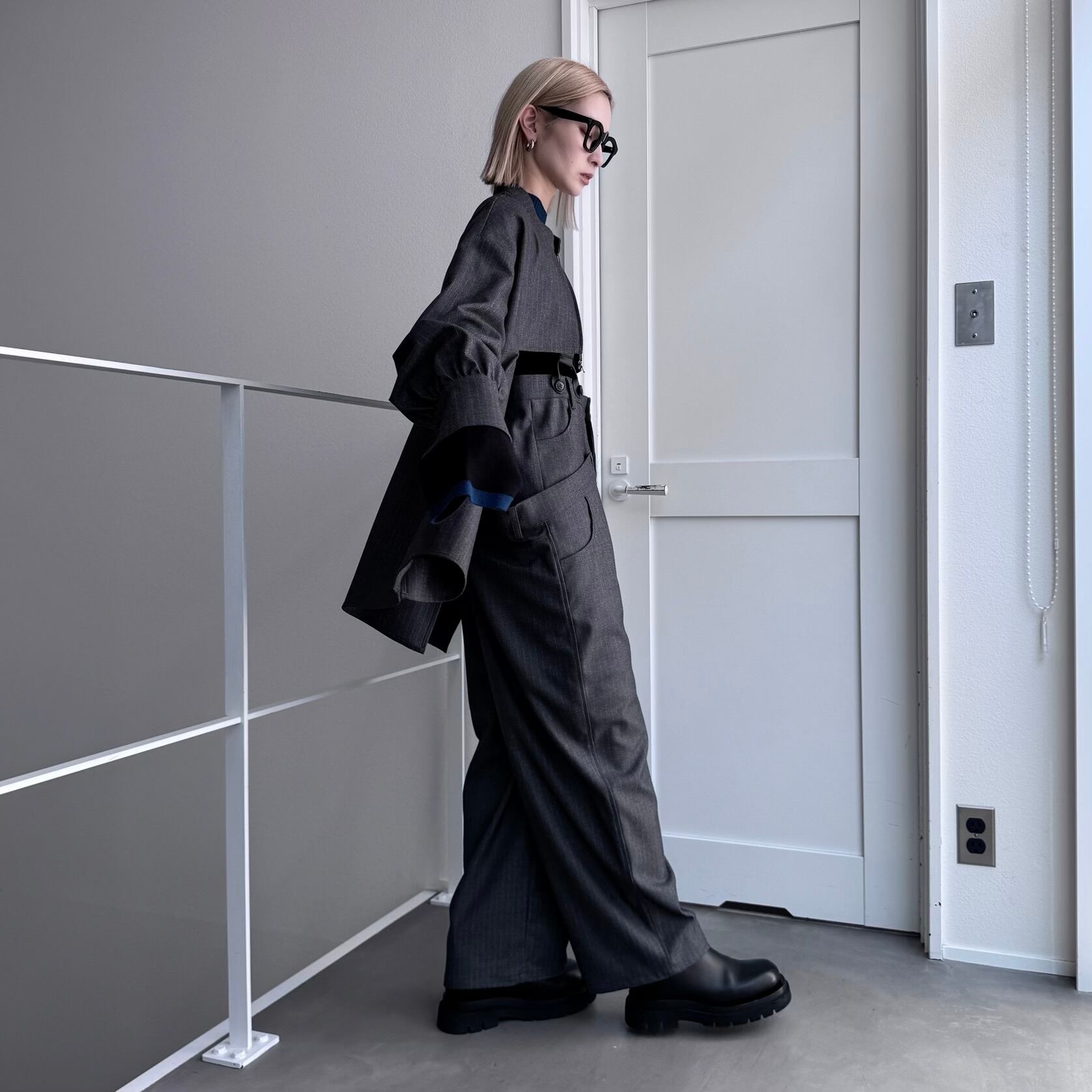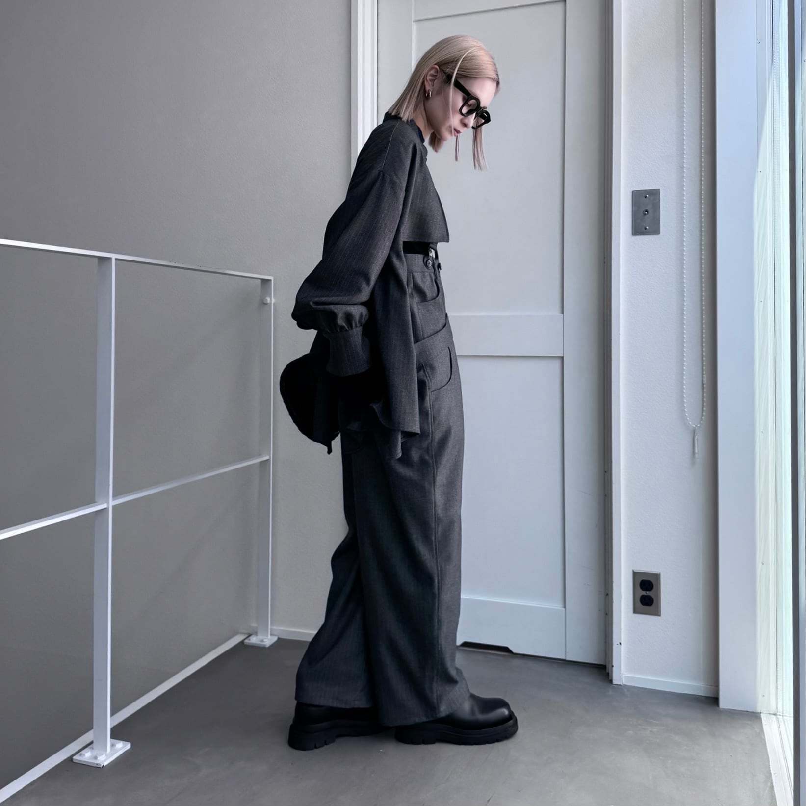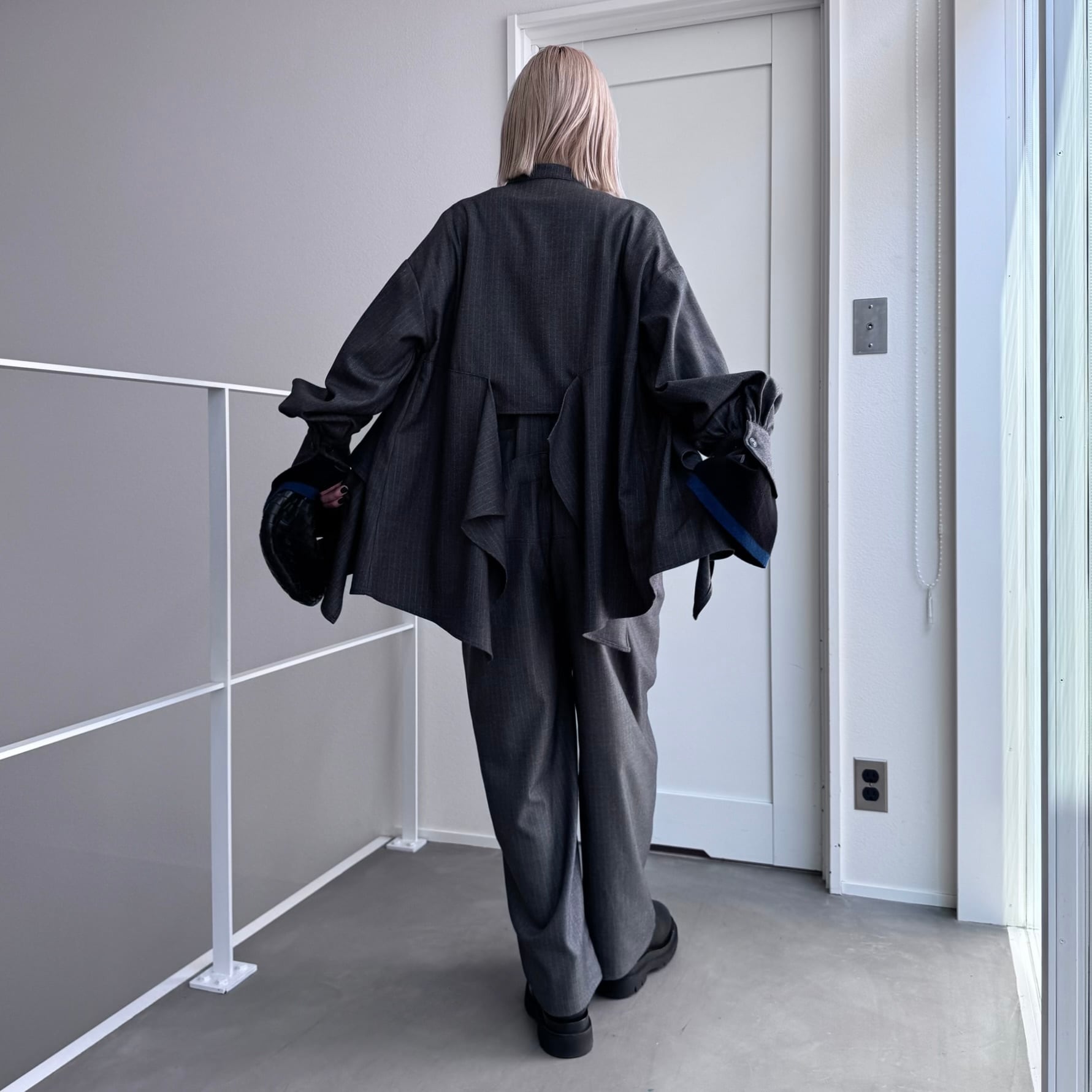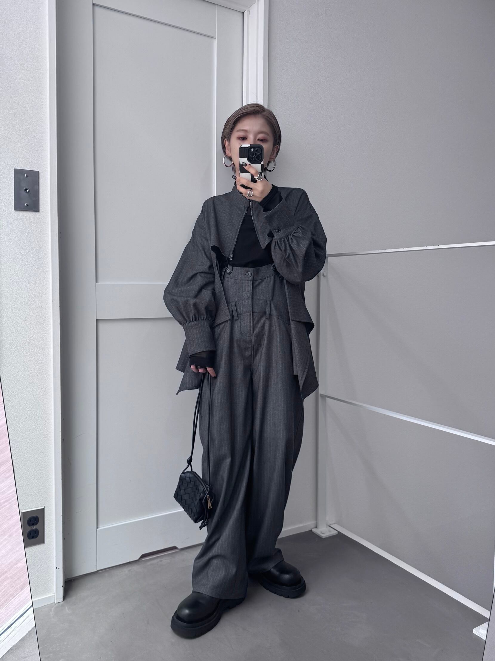フロントとバックのドレープが目を惹くジップジャケット。ドレープ部分は腰回りを隠してくれるロング丈。きれいなドレープ感のあるシルエットなので重く見えず動きのあるデザインに。zip部分はあえて短くしているので合わせるインナーで印象が変わります。セットアップはもちろんワンピースの上やシャツ感覚で羽織っても◎オケージョンにもおすすめです。